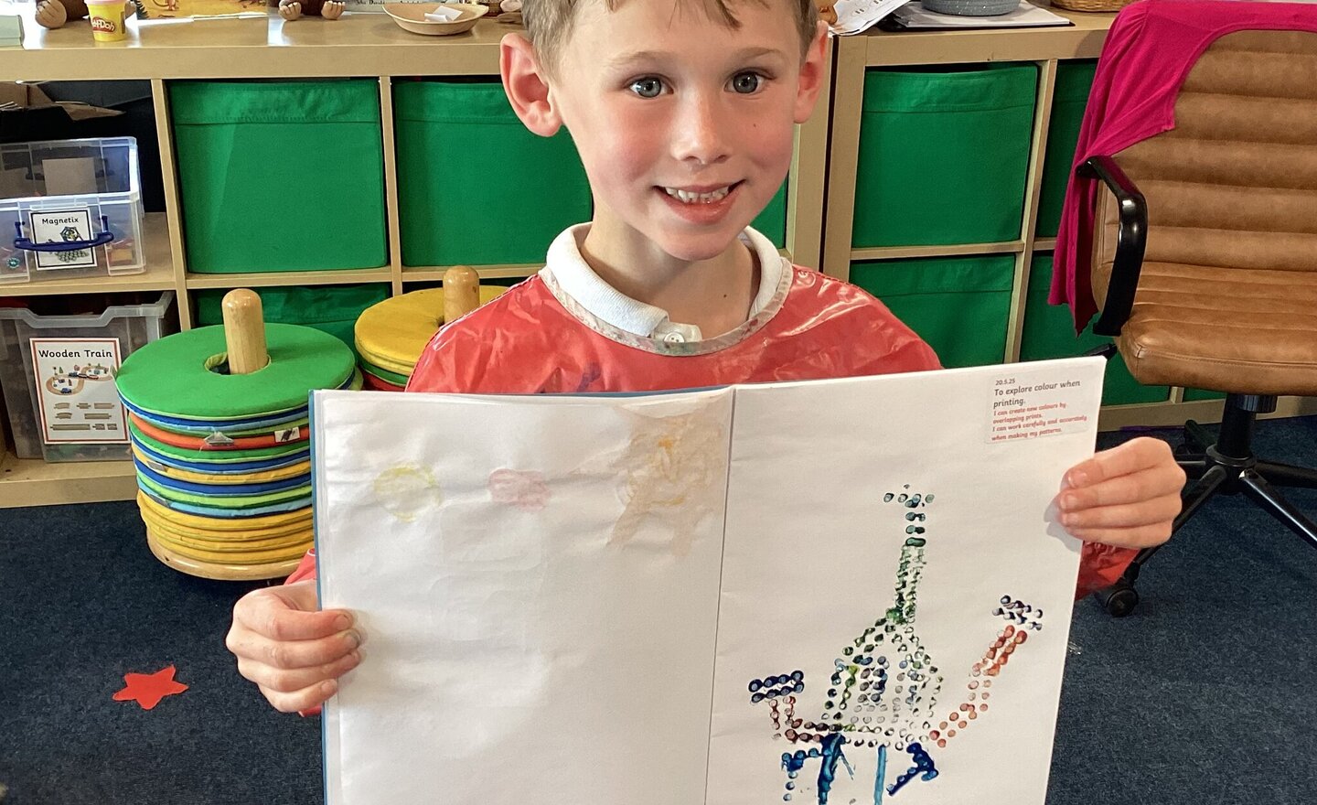 Using Lego bricks to create prints the children experiments creating patterns, combining colours and creating pictures. They created the new colours by overlapping prints and aimed to work carefully and accurately to create their prints.