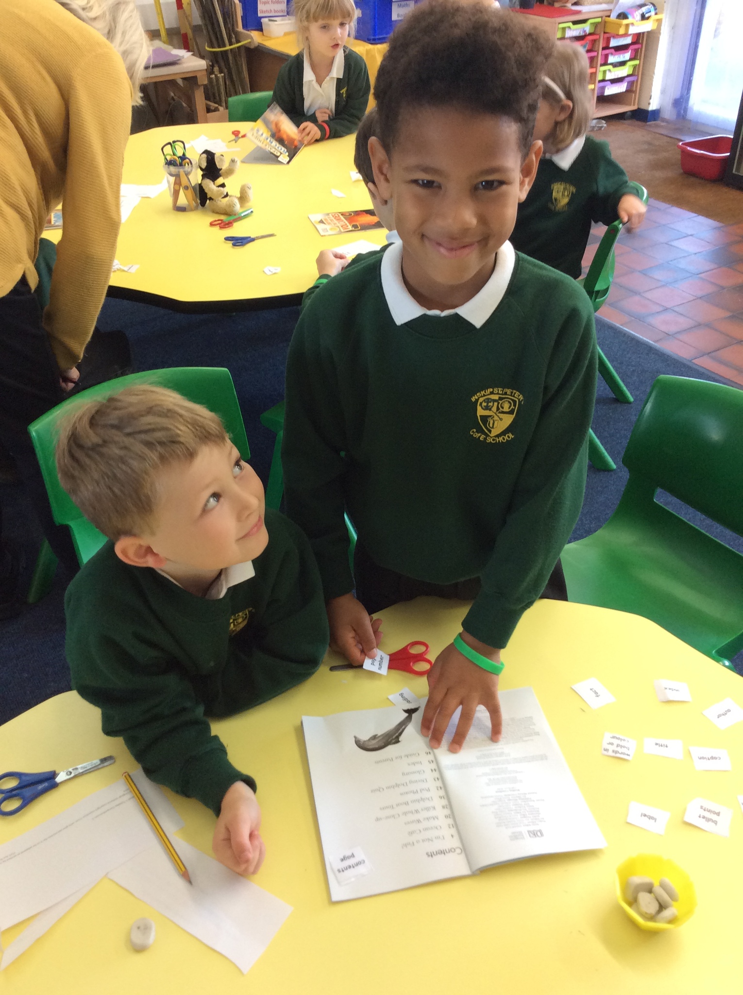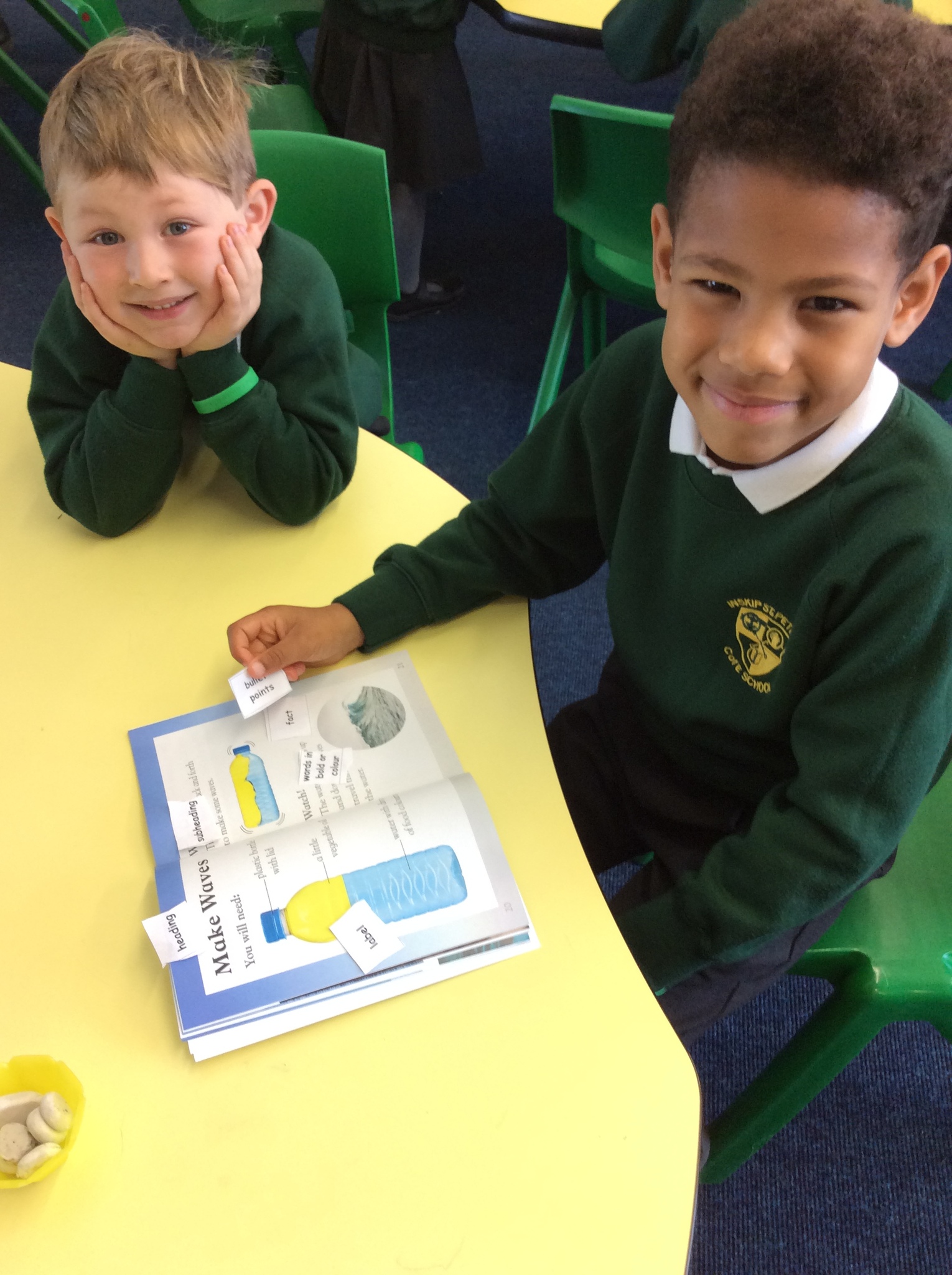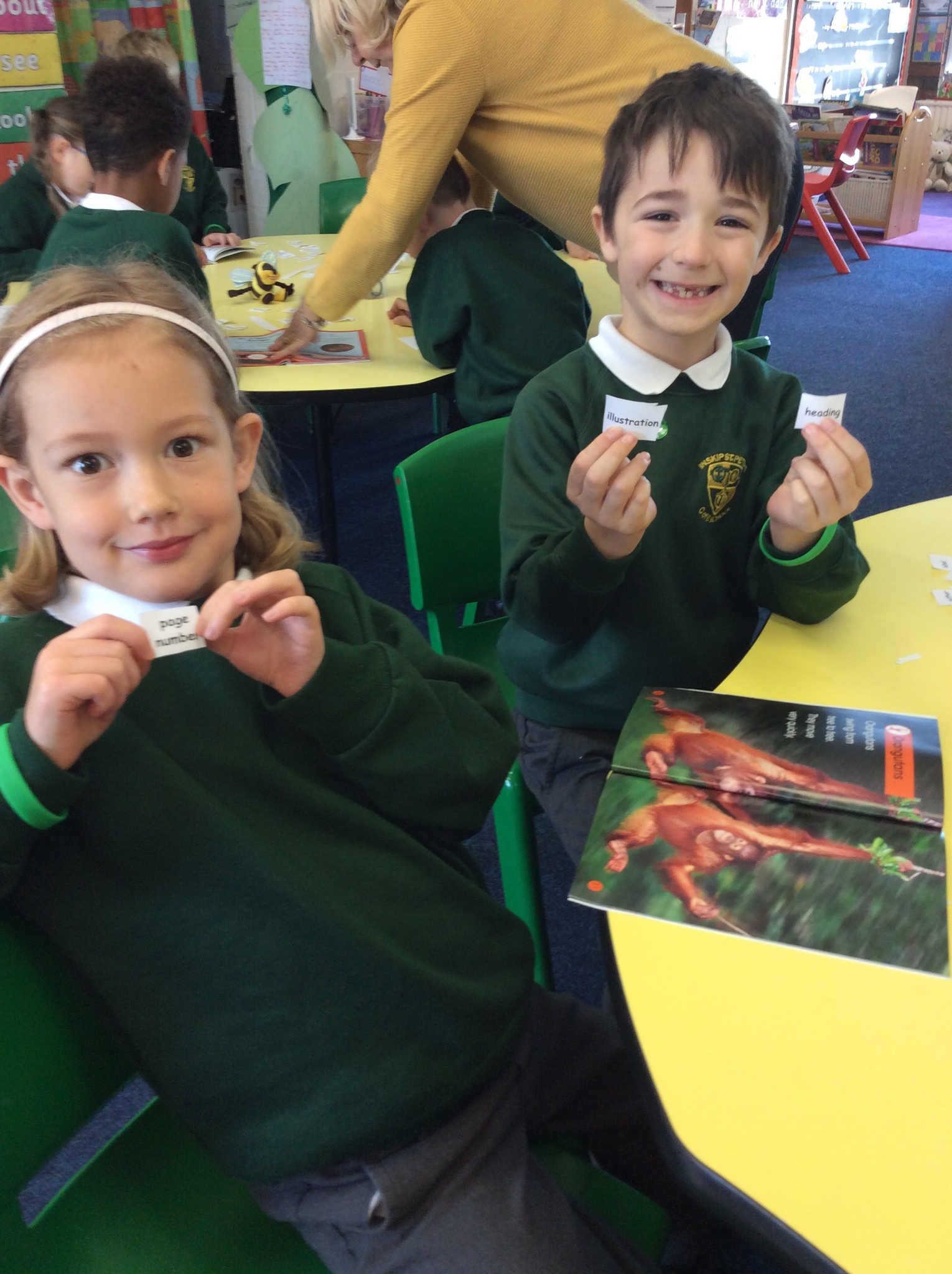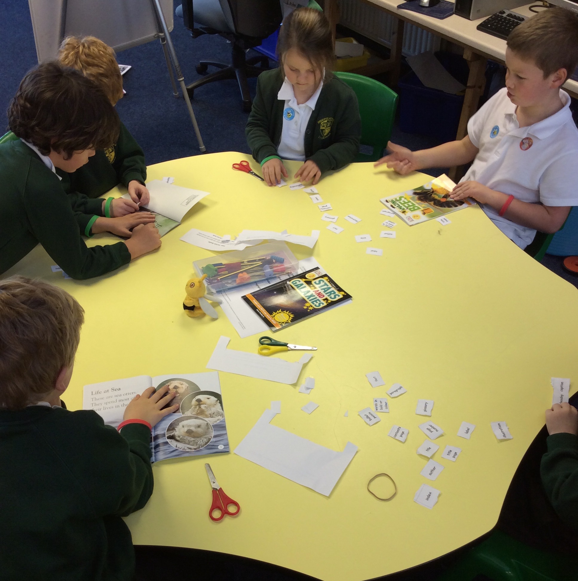 Year 1 and 2 children have been great co-operative 'Busy Bee' learners working in pairs to find features of non-fiction texts in books. They did this to help them see and learn how to set out information ready for when they write the facts they have learnt about hedgehogs.
