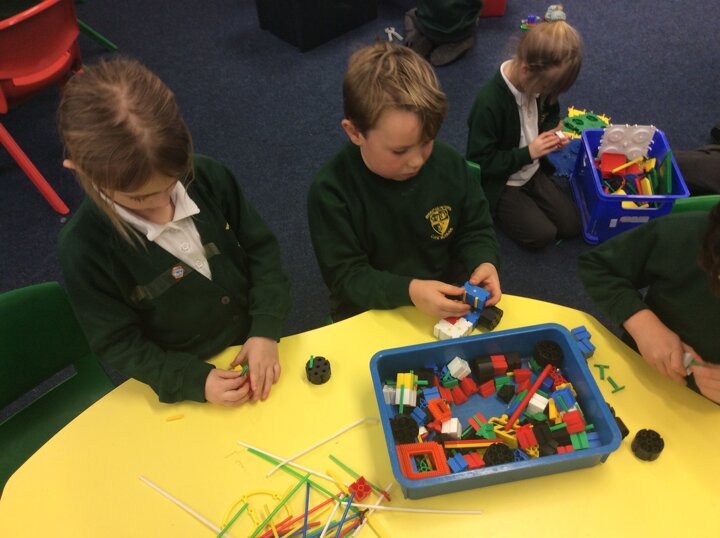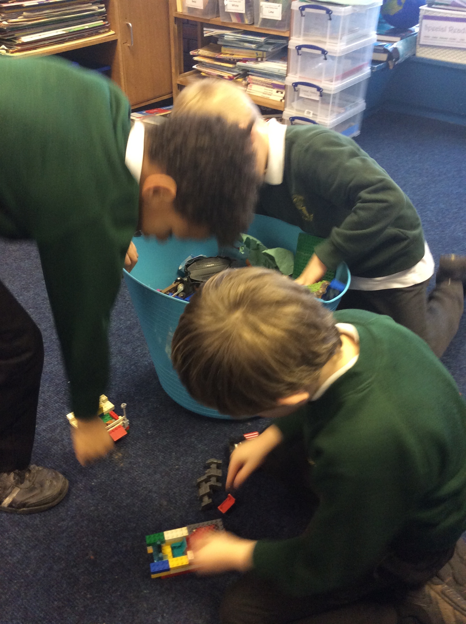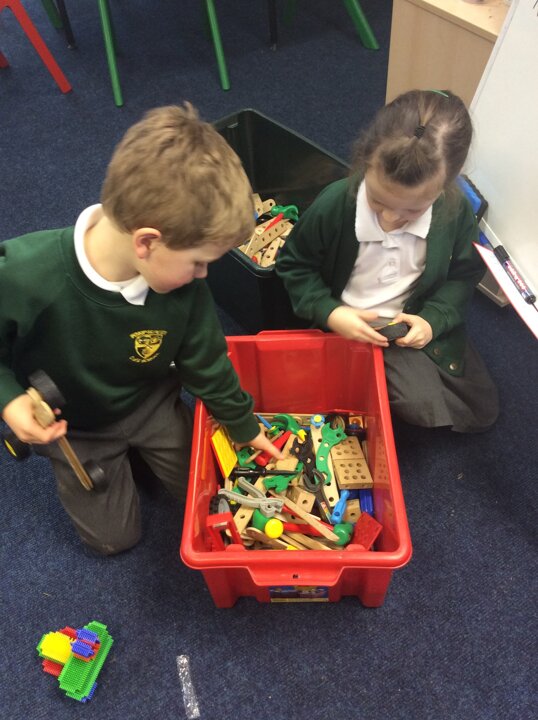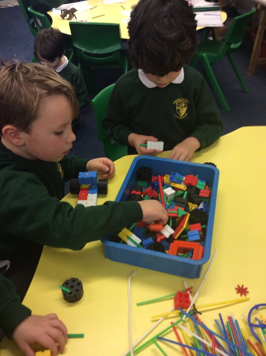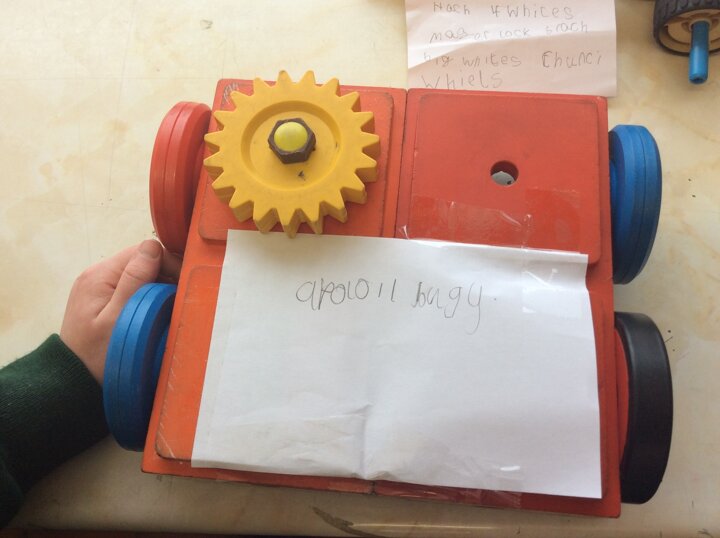 Today the children started their project by thinking about what their vehicle will need to be like and why. They thought of some clever ideas: thick tyres so that they wouldn't sink on the moon's surface, space for Bob to sit, space for Bob's cleaning equipment and brushes attached to clean the surface as he drives. Then they talked about what materials and equipment they are going to need to make their model of the buggy.