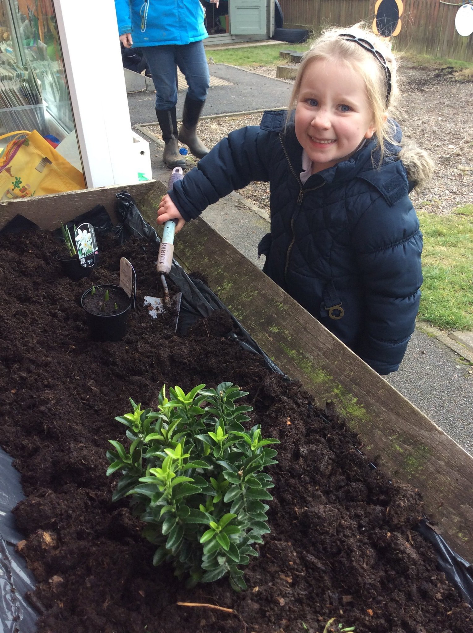 Reception had a good tidy up time in our garden area this morning. They cleared out the weeds and turned over the soil in our tyres that we had grown potatoes and wild flowers in last year. Then they planted some bulbs and shrubs in the wooden trough planters. They learnt new things and showed their understanding of gardening well talking about roots, bulbs, shoots, compost and how to use the tools and take care of plants.
