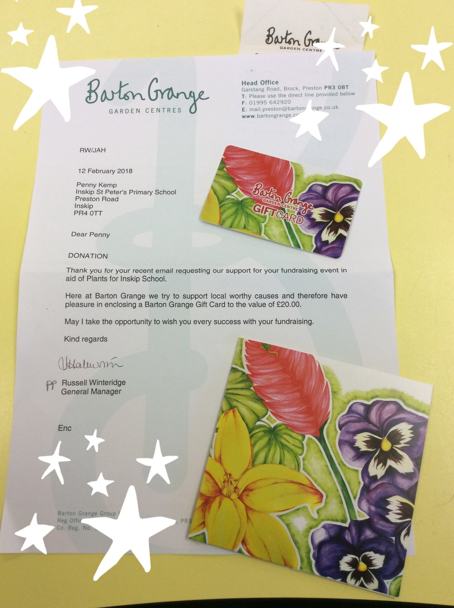 20 February 2018 Penny Kemp Lower School (KS1) Thank you very much to Barton Grange who have very kindly given us a voucher for £20 with which we will buy plants and seeds for our science learning this term.