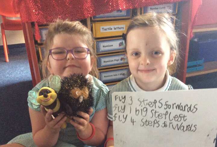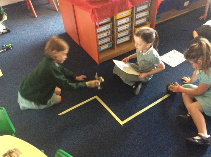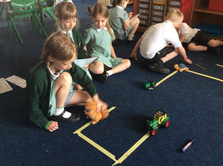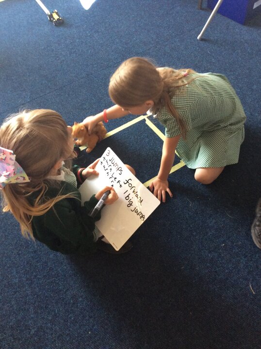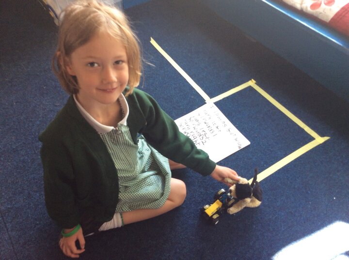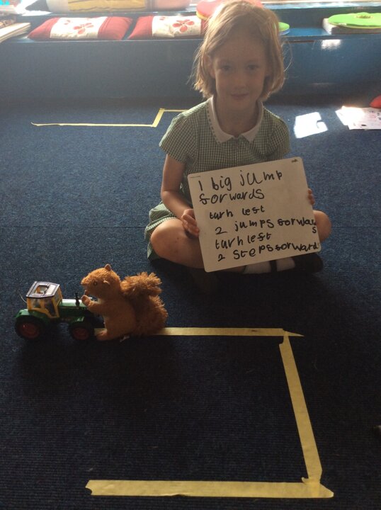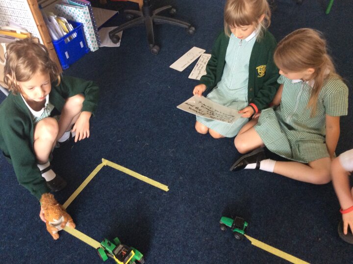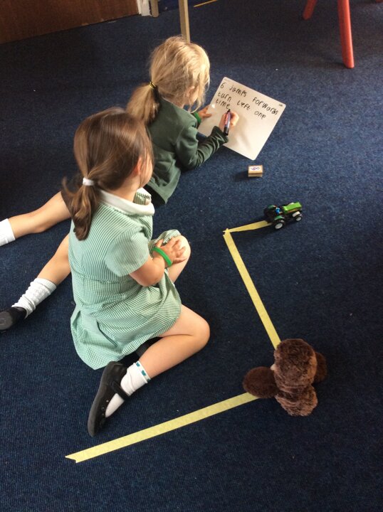 To practise their learning today they wrote instructions telling the teddies how to move along the track to reach the tractors to go for a ride!