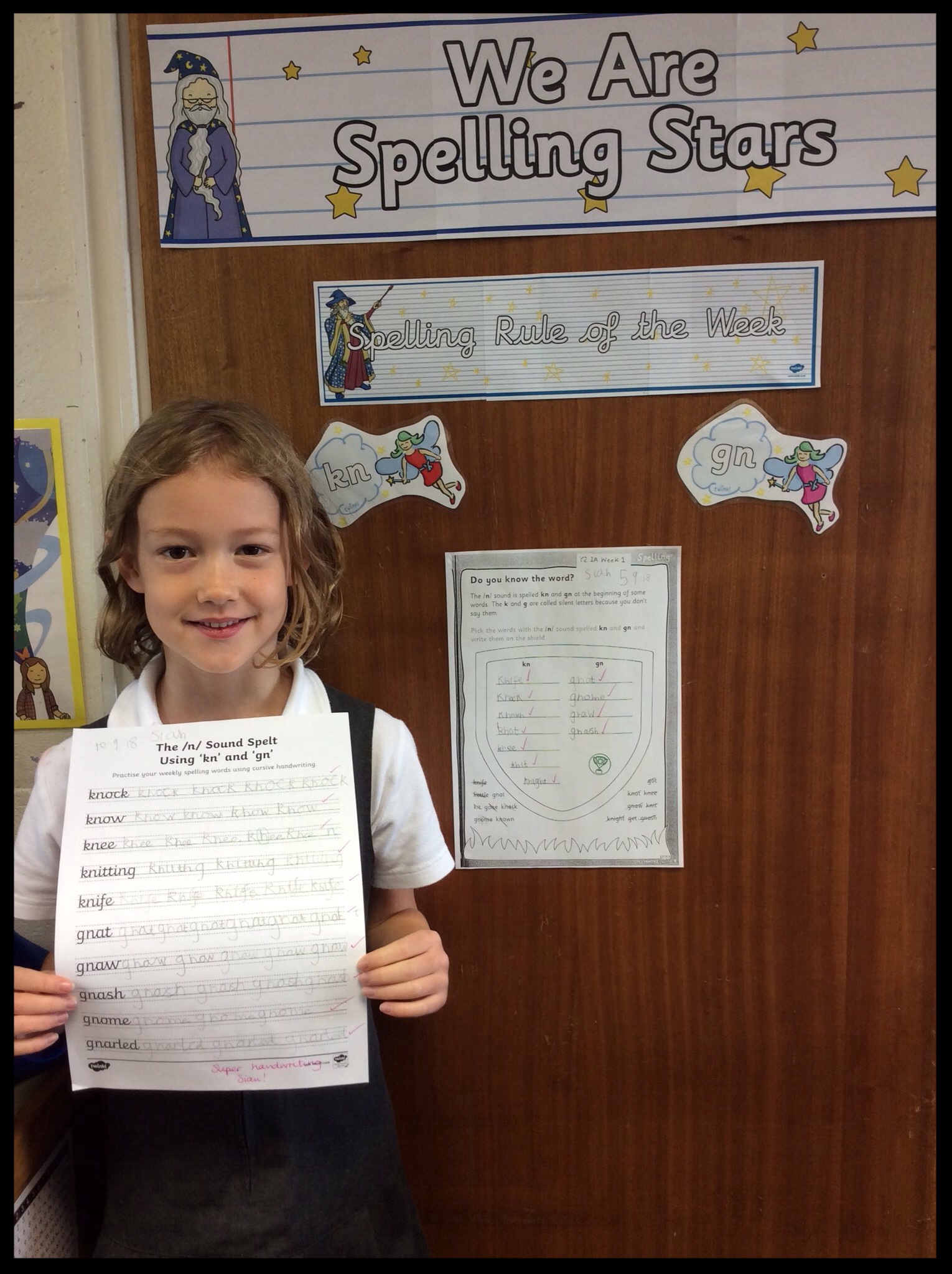 12 September 2018 Penny Kemp Lower School (KS1) Sian is doing so well this week learning the spelling rule for ‘kn’ and ‘ gn’ and her handwriting is excellent! Well done Sian.