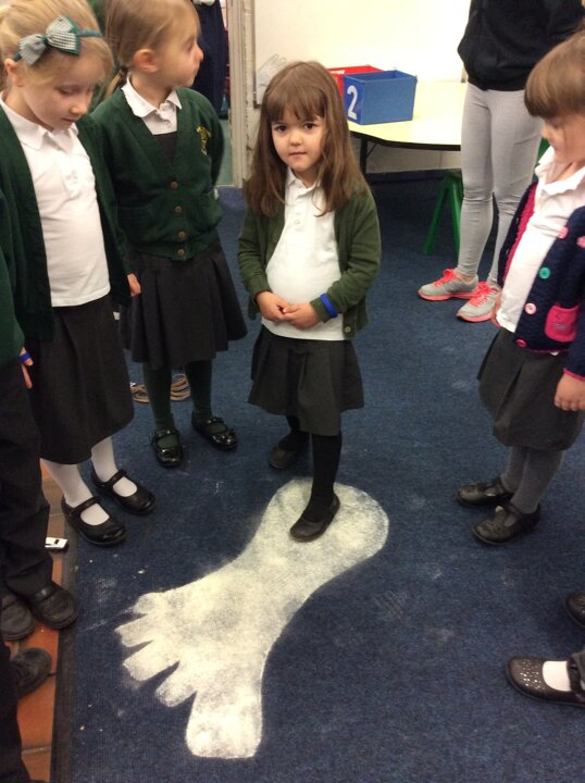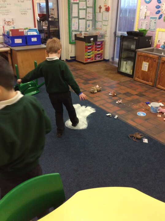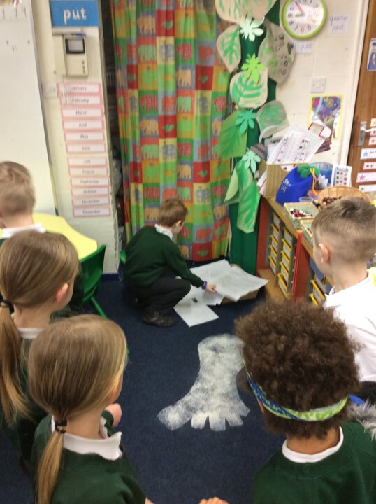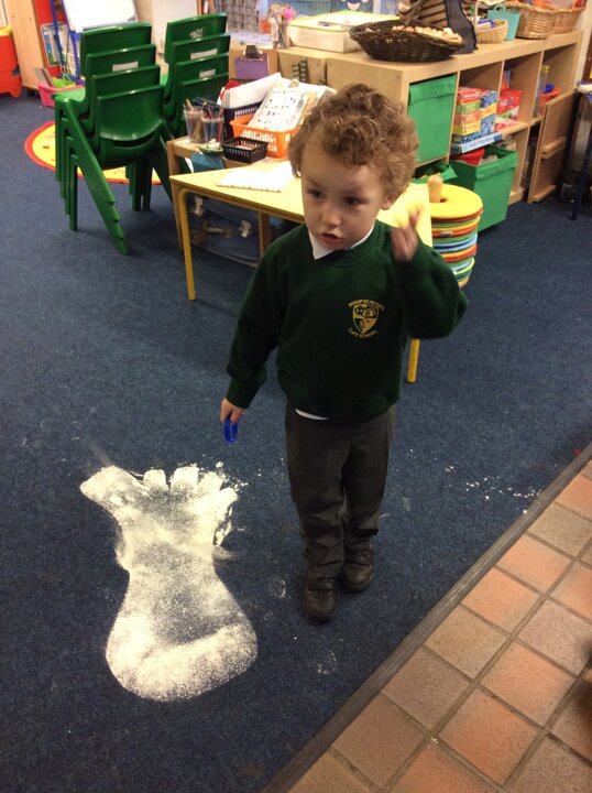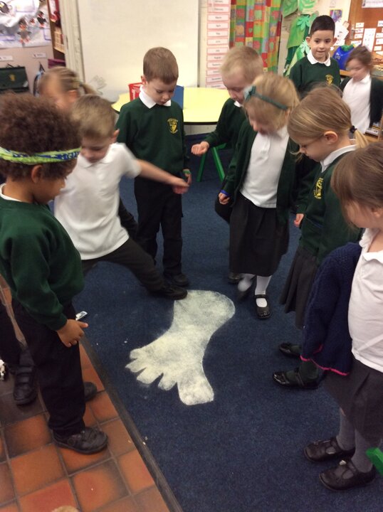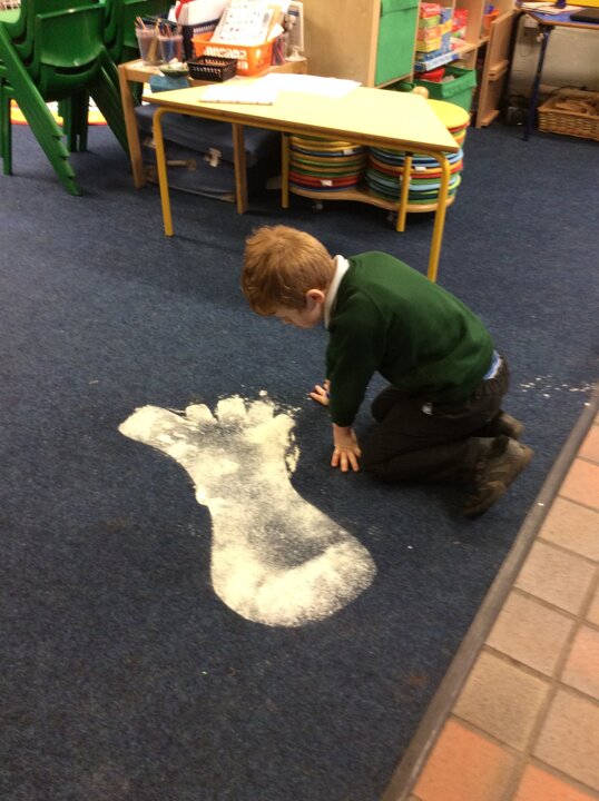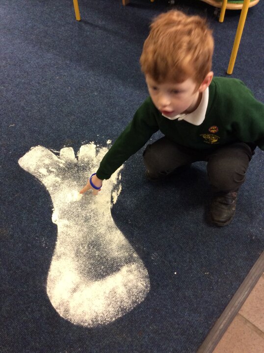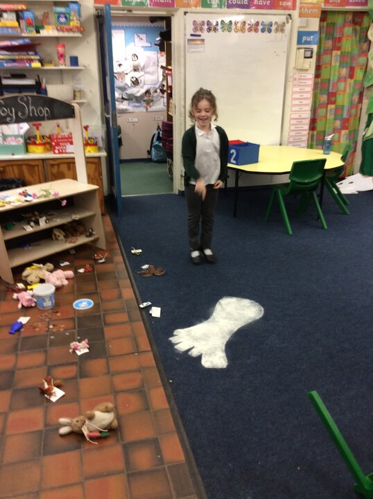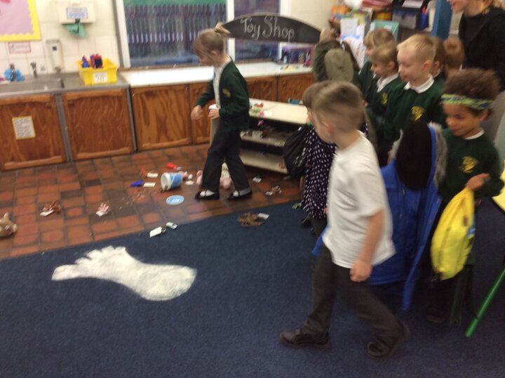 On Wednesday morning we arrived to a HUGE surprise, giant footprints on the carpet, furniture knocked over in our classroom and a letter - the giant had come down the beanstalk and been in our classroom during the night!