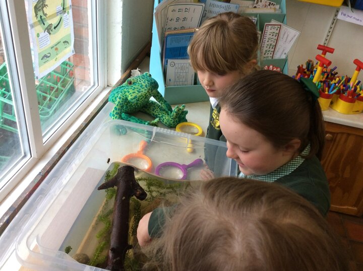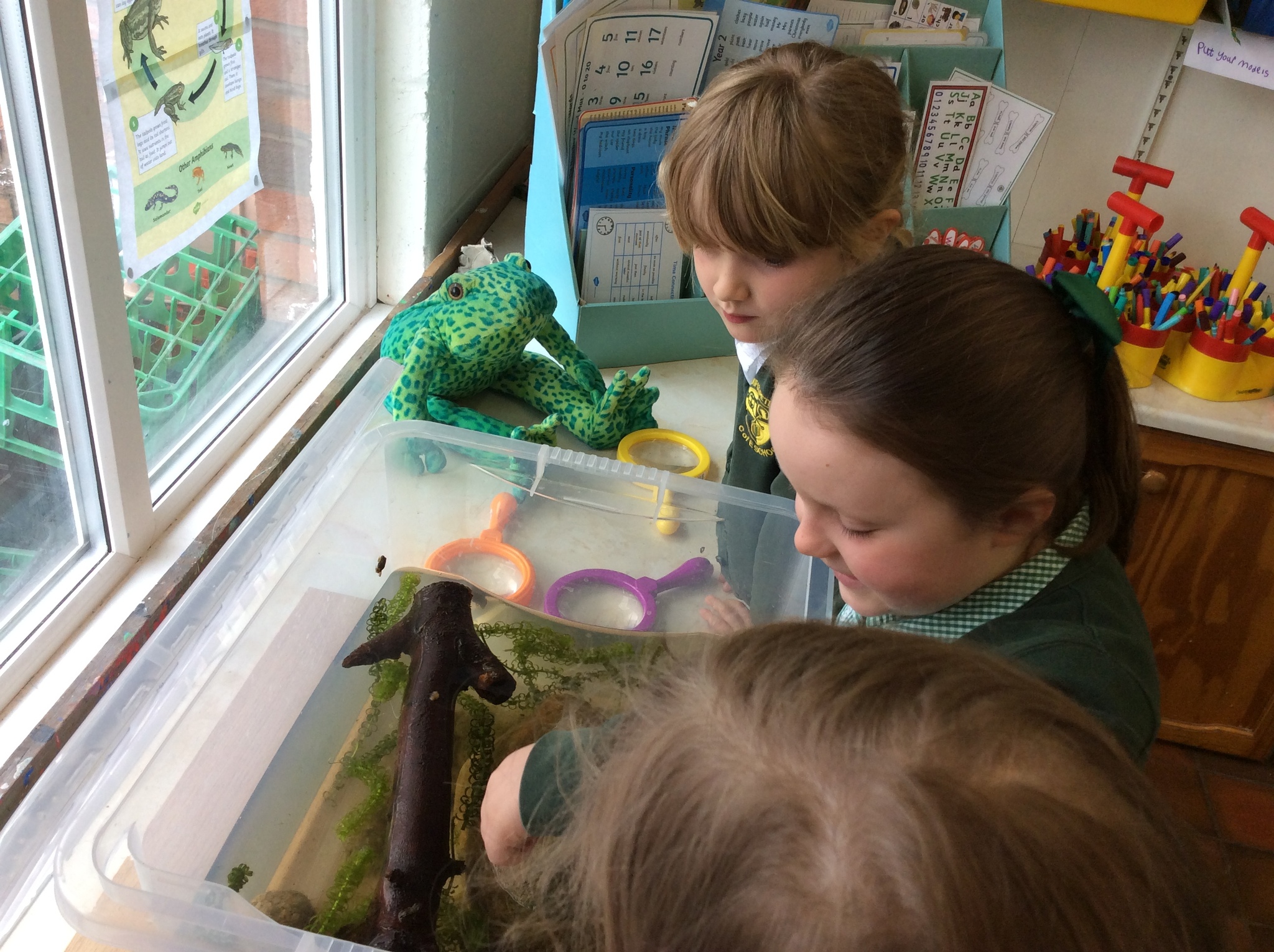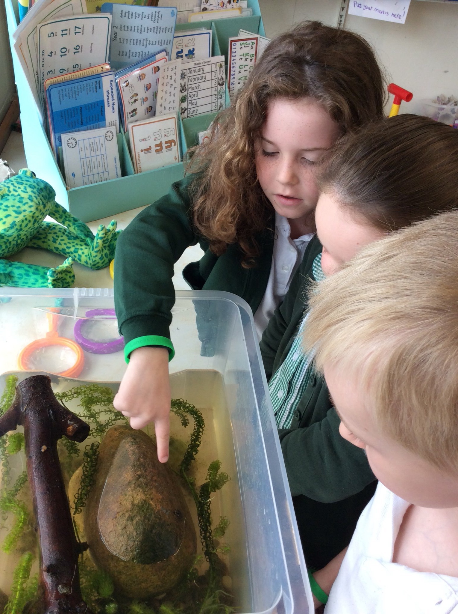 The Tadpoles have turned into frogs over the Easter holidays, the children have been very excited to see them and observe the changes this week. The frogs are fascinating to watch.