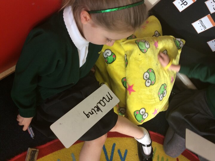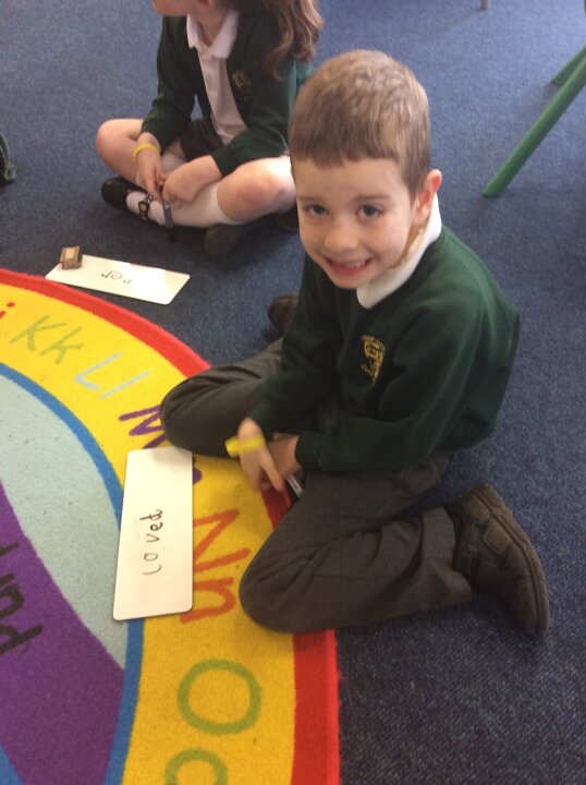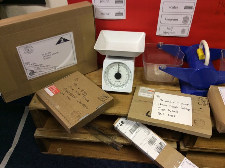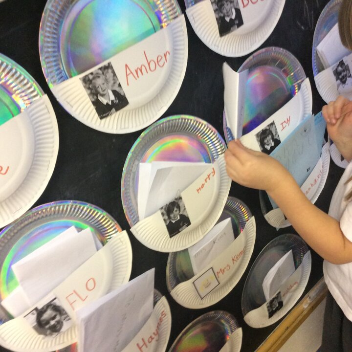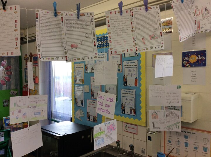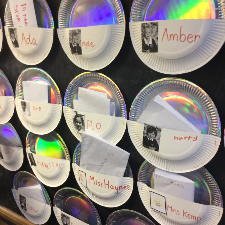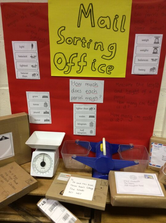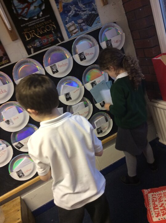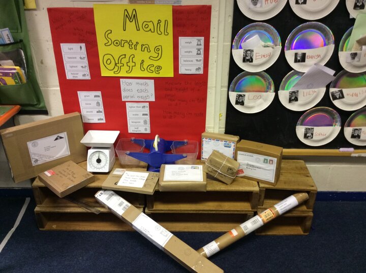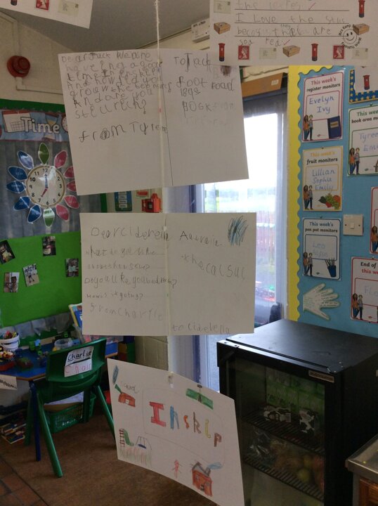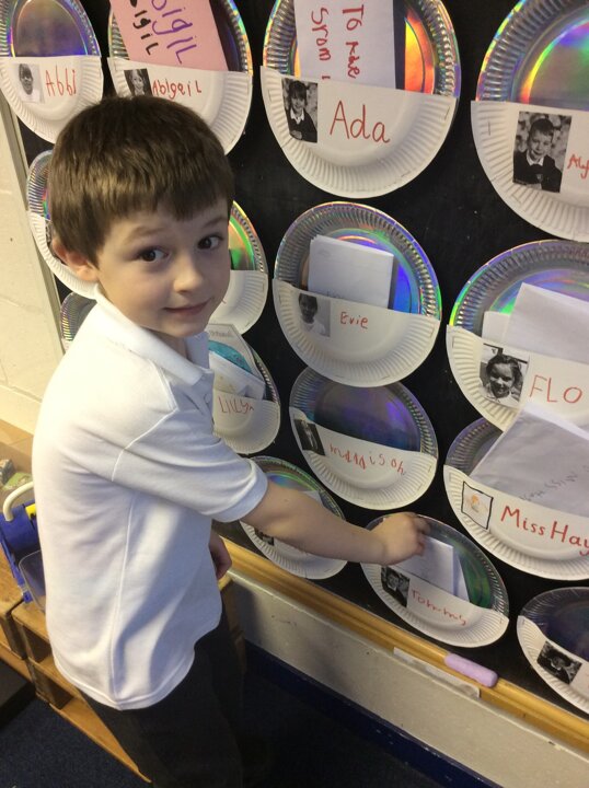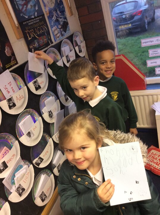 Over this last half term the children have showed some great progression in their writing skills. They have had many writing opportunities to develop these skills. Our role play area which the children decided should be a post office meant lots of letters, cards, notes and postcards where written. Each child had a ‘postbox’ (you can see the silver paper plate pockets on the wall in the photographs) and every day the post office workers emptied the post box and sorted the post into the children’s post pockets.