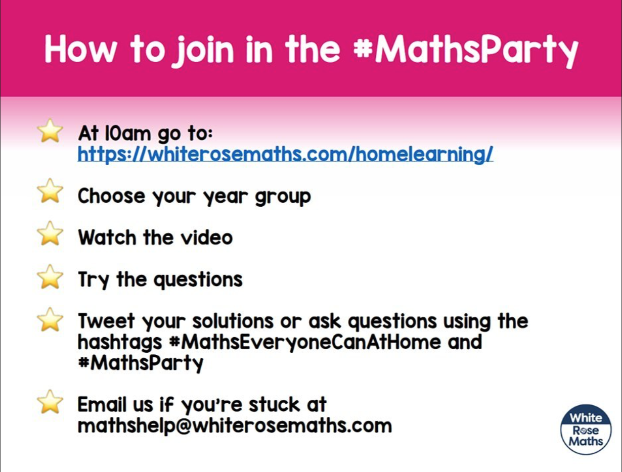 Join the maths party at White Rose Maths Home Learning by clicking on this link https://whiterosemaths.com/homelearning/. Choose your year group, watch the video first then have a go at the activities. I suggest you do one of the lessons and then go and do some practical maths ...