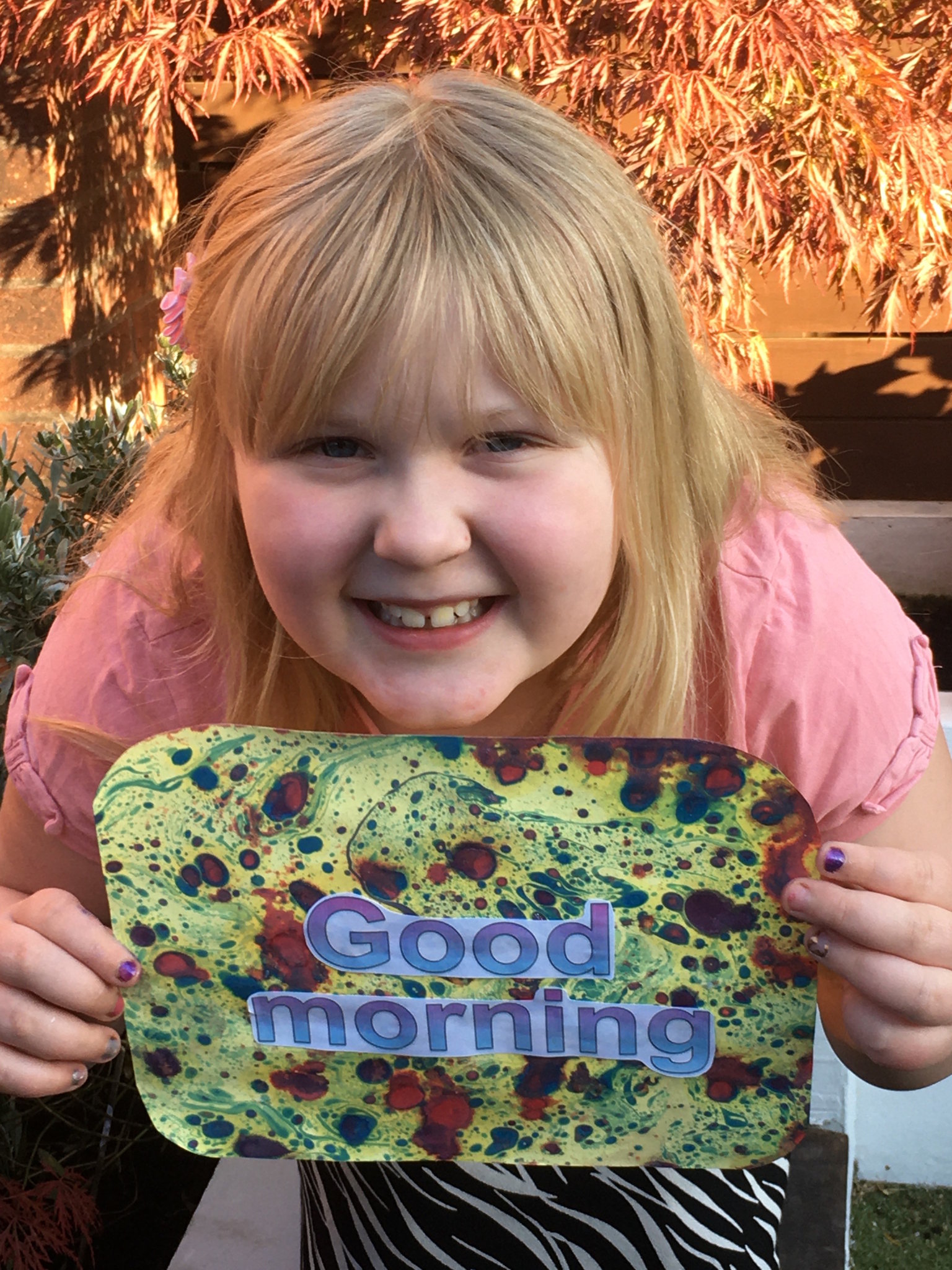 Today's star of the blog is Sophie! Sophie has been doing lots of great learning at home, she has created the paper she is holding by a painting technique called marbling, well done Sophie it looks great!