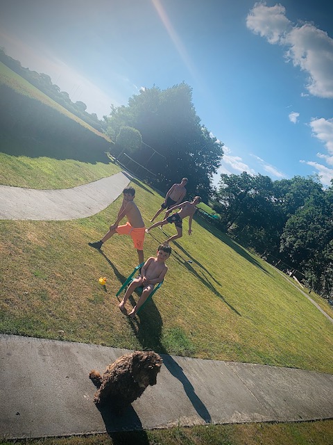 Today’s stars of the blog are Leo and his brothers Ben, Sam and Josh looking happy in the sun together when they met for the first time on Monday after three months of not all being able to see each other.