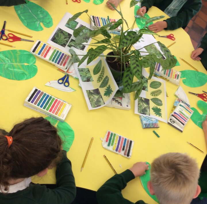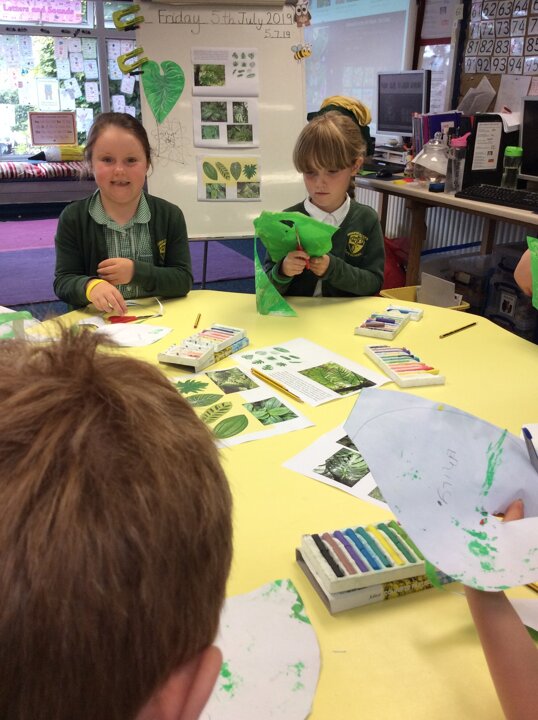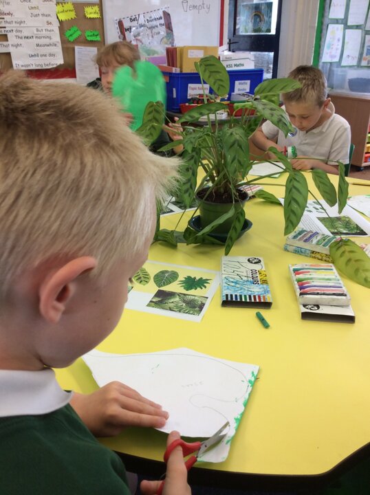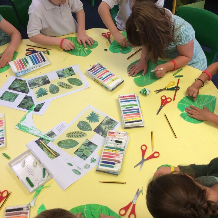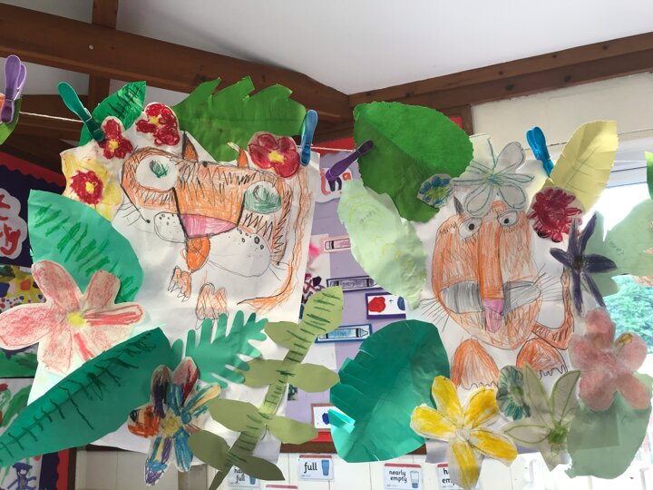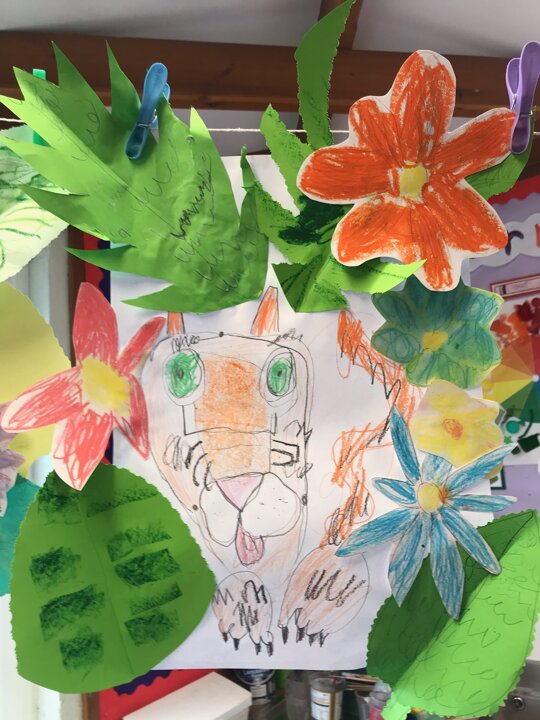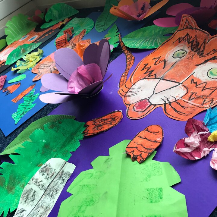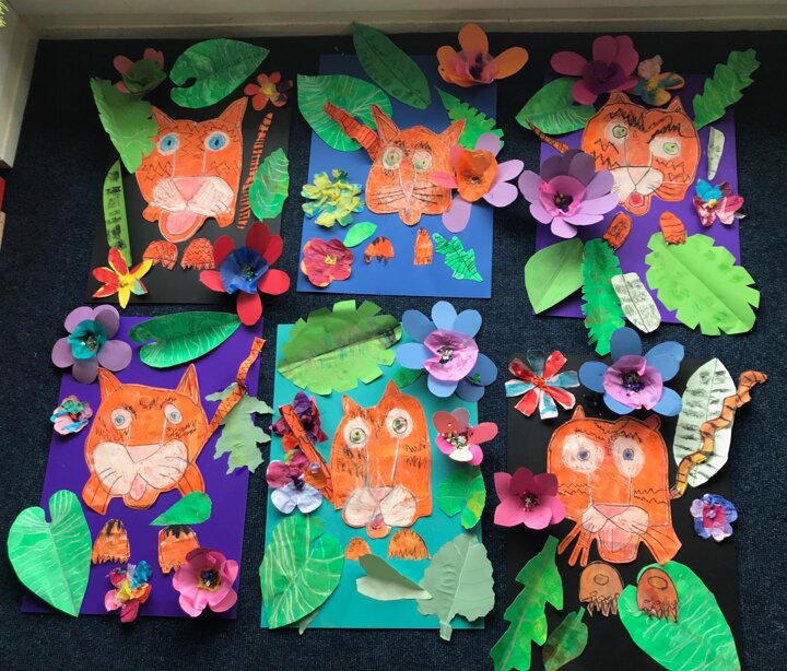 It was a really fun and rewarding project that we all enjoyed. The children learnt and practised new skills as we worked through each stage. We began by looking closely at Henri Rousseau's painting 'Tiger In A Tropical Storm Surprised', asking questions and making observations about the colours, style of painting and the content.