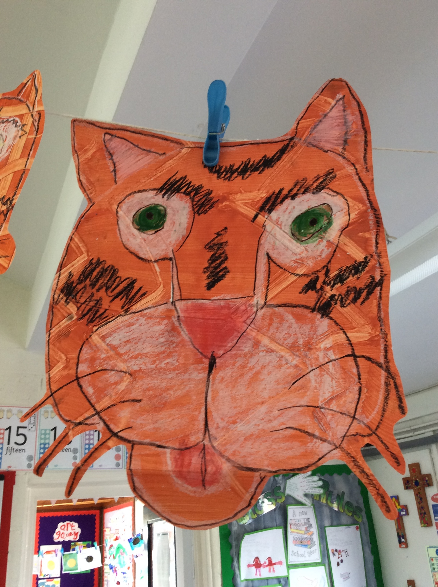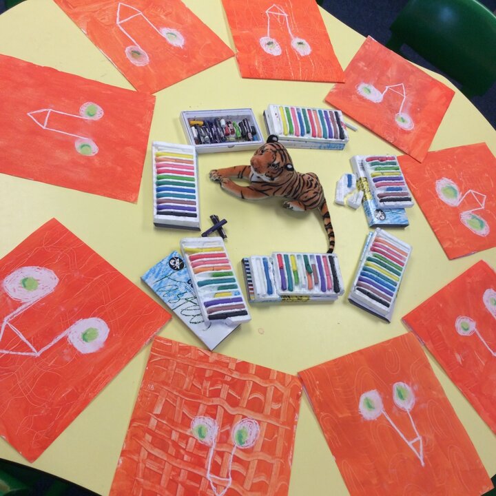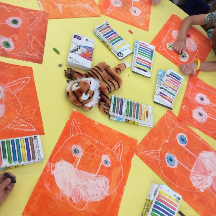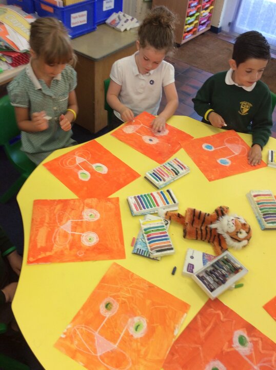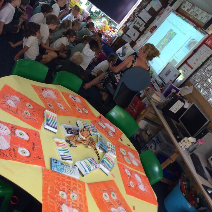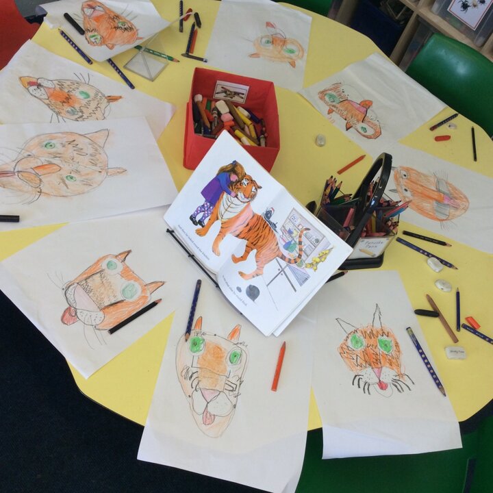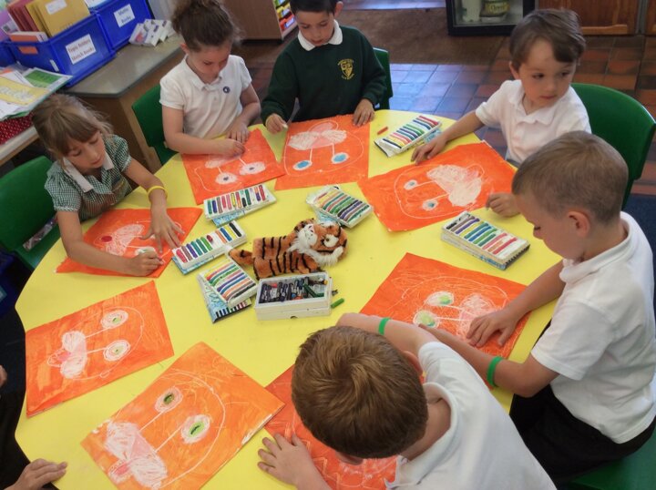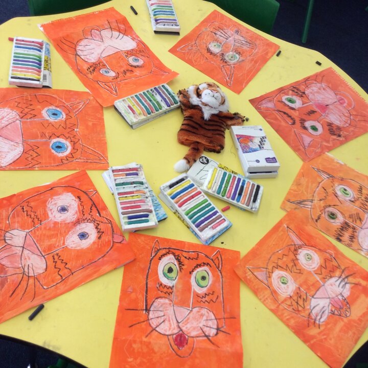 Then we watched a short video on Youtube by a fabulous art teacher in America called Cassie Stephens 'Learn the Elements of Art! While Drawing A Tiger' and followed the steps she shows on the video to draw our large tiger faces. We created the textured paper as the base for our Tiger's face by painting a piece of paper with different shades of orange paint (which the children mixed themselves) and then by rolling and dragging different objects and printing tools to leave lines and impressions in the paint before it dried. Year 1 and 2 drew the face and two paws using oil pastels whilst the Reception children used pencils and wax crayons. We also read one of our favourite stories 'The Tiger Who Came To Tea' by Judith Kerr and used her illustrations to inspire our drawings. Have a look at this first group of photos to see the stages ...