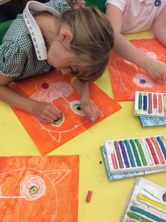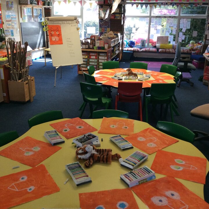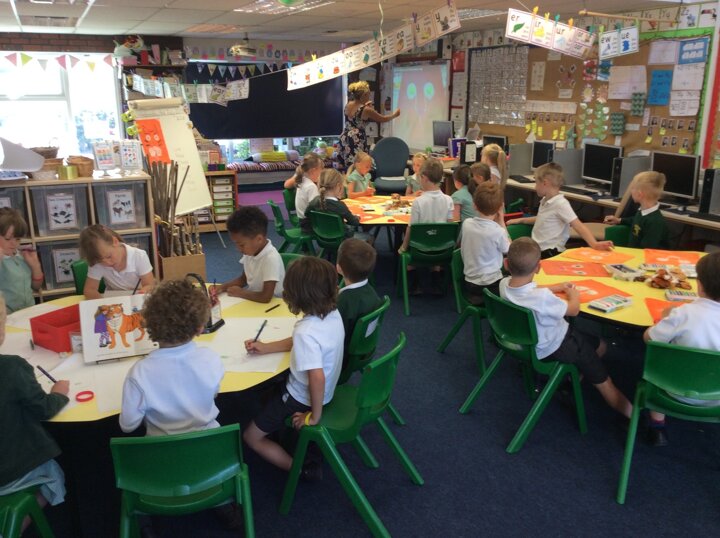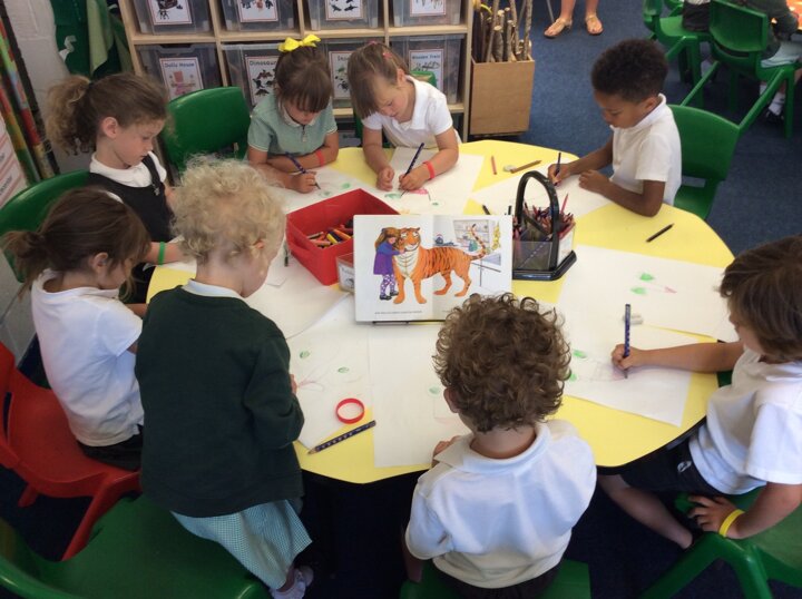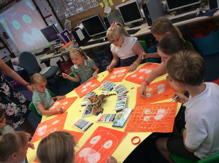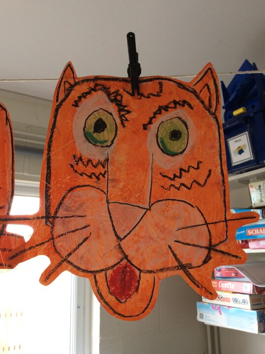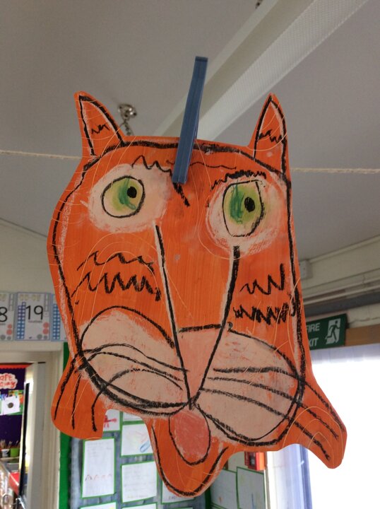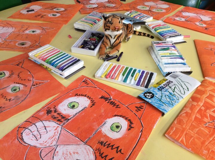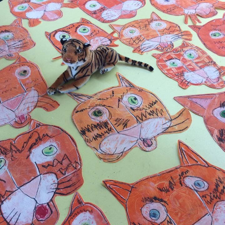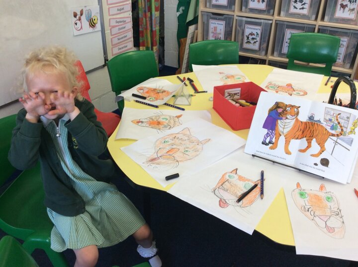 Then we watched a short video on Youtube by a fabulous art teacher in America called Cassie Stephens 'Learn the Elements of Art! While Drawing A Tiger' and followed the steps she shows on the video to draw our large tiger faces. We created the textured paper as the base for our Tiger's face by painting a piece of paper with different shades of orange paint (which the children mixed themselves) and then by rolling and dragging different objects and printing tools to leave lines and impressions in the paint before it dried. Year 1 and 2 drew the face and two paws using oil pastels whilst the Reception children used pencils and wax crayons. We also read one of our favourite stories 'The Tiger Who Came To Tea' by Judith Kerr and used her illustrations to inspire our drawings. Have a look at this first group of photos to see the stages ...