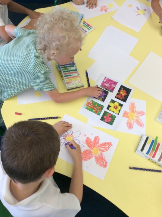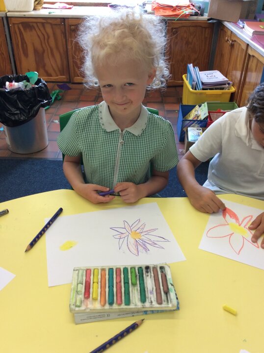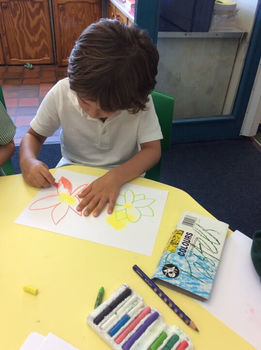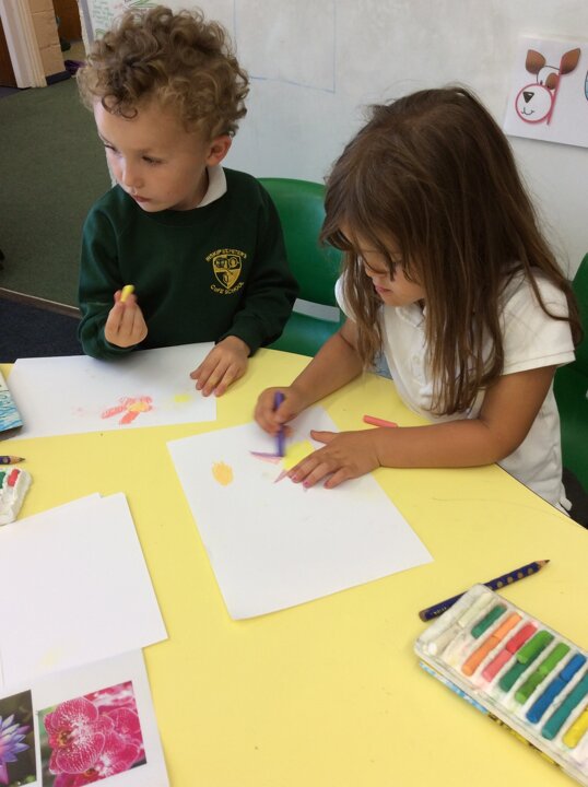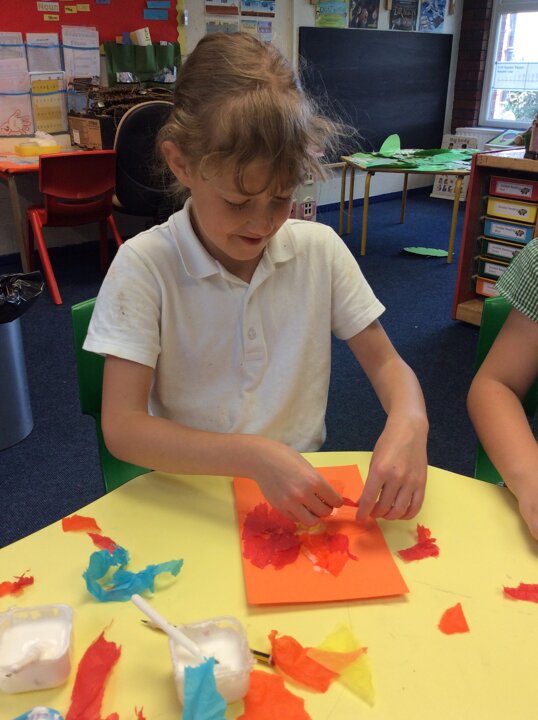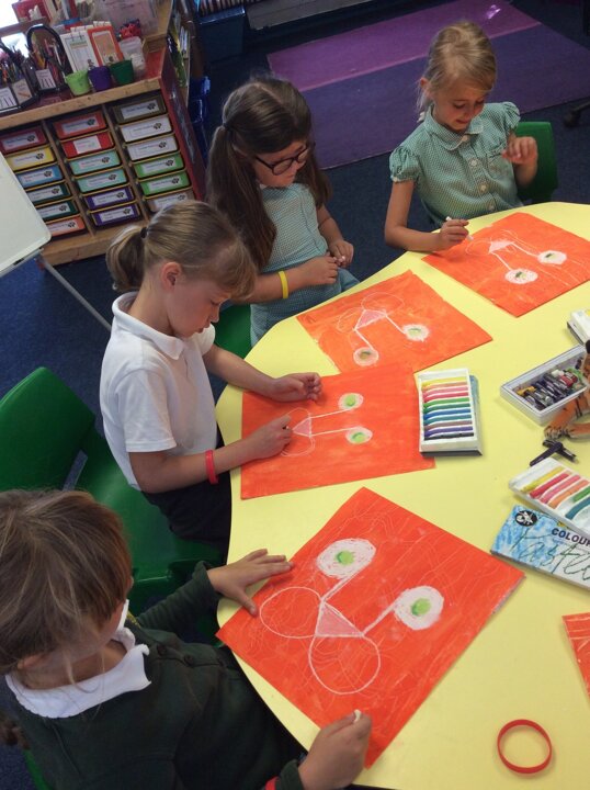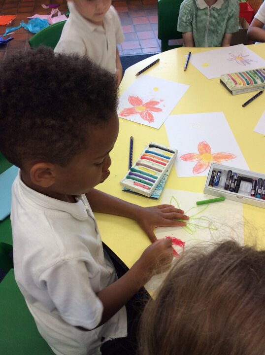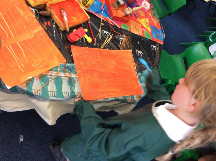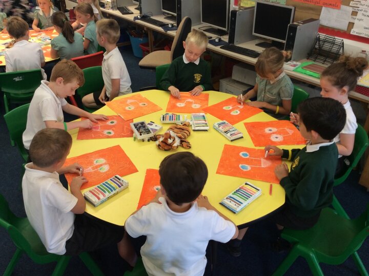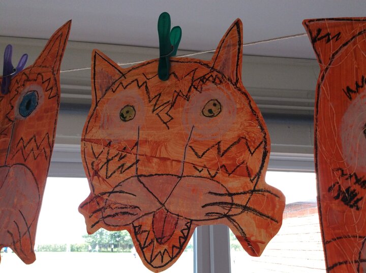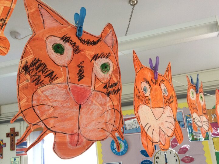Then we watched a short video on Youtube by a fabulous art teacher in America called Cassie Stephens 'Learn the Elements of Art! While Drawing A Tiger' and followed the steps she shows on the video to draw our large tiger faces. We created the textured paper as the base for our Tiger's face by painting a piece of paper with different shades of orange paint (which the children mixed themselves) and then by rolling and dragging different objects and printing tools to leave lines and impressions in the paint before it dried. Year 1 and 2 drew the face and two paws using oil pastels whilst the Reception children used pencils and wax crayons. We also read one of our favourite stories 'The Tiger Who Came To Tea' by Judith Kerr and used her illustrations to inspire our drawings. Have a look at this first group of photos to see the stages ...