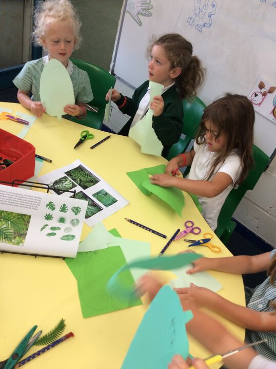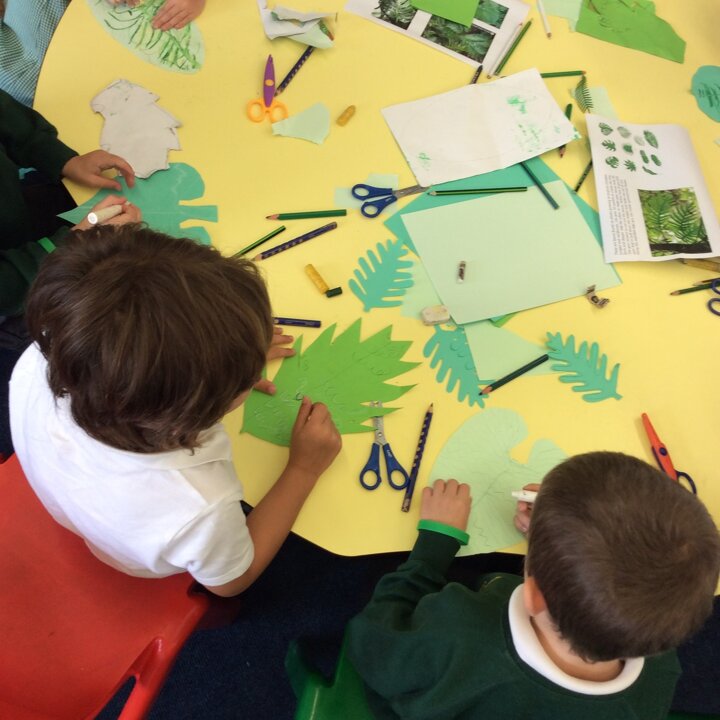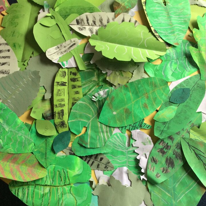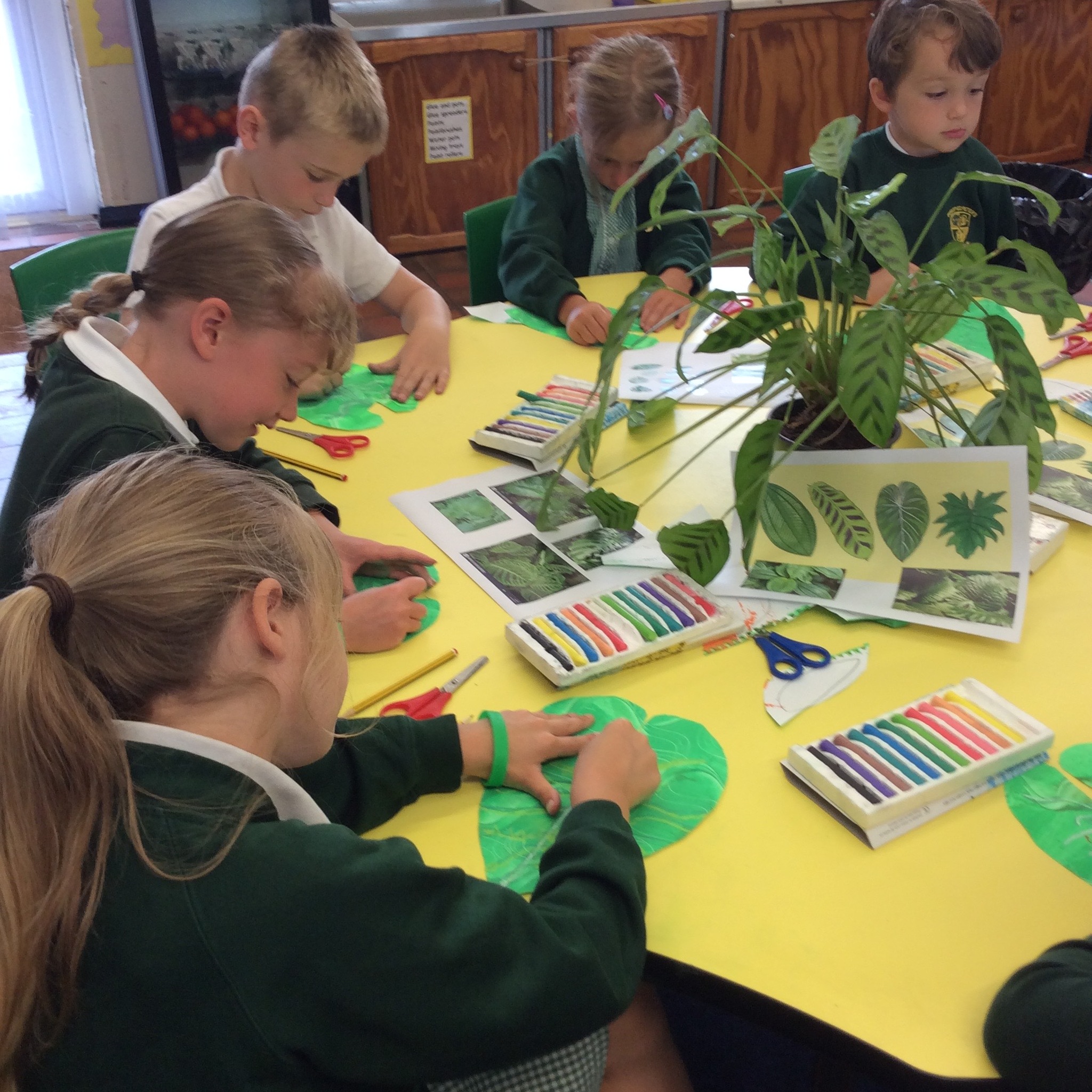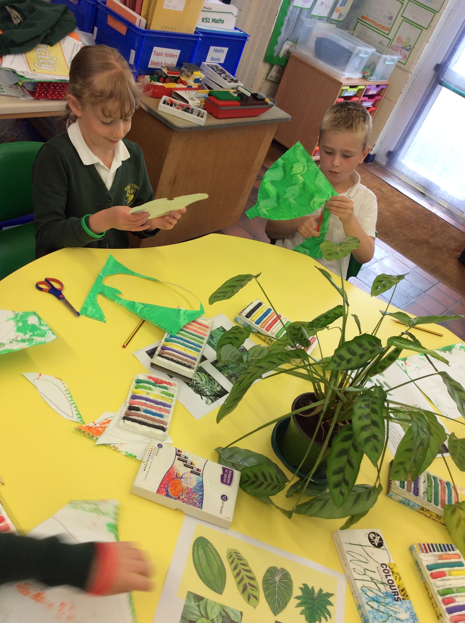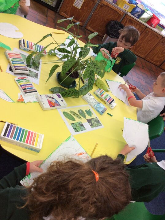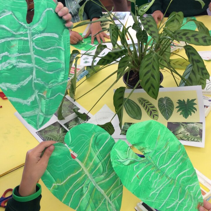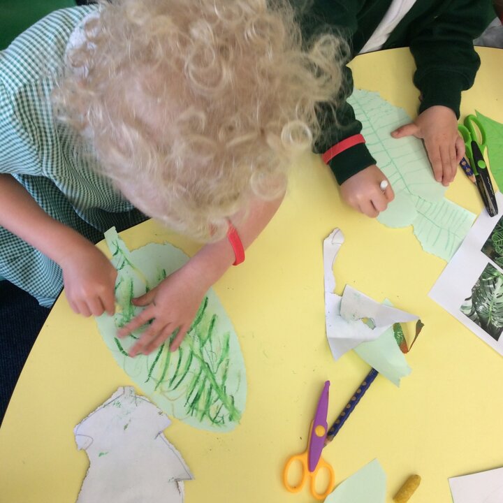 Then we looked on the internet at other children's art along the same theme and found a brilliant collage using the same ideas we had used from Cassie Stephens inspiring us to create something similar. We chose to place our tigers faces behind tropical flowers, plants and leaves, like Rousseau had painted the tiger hiding in the plants. We used lots of different materials and skills to make our foliage have different textures and create an impressive 3D effect! Again we used our observation skills and looked closely at photos of tropical plants and some real plants (even though they weren't tropical ones!) to study colour and line. Have a look at this group of photos to see what we did ...