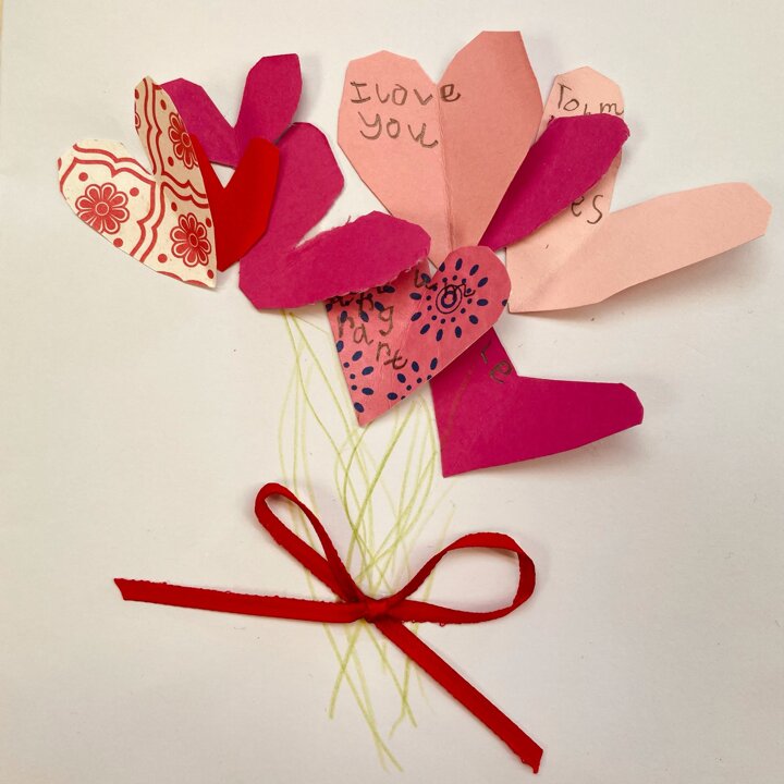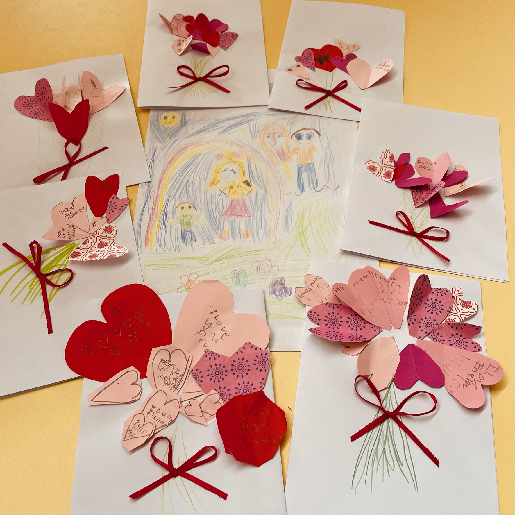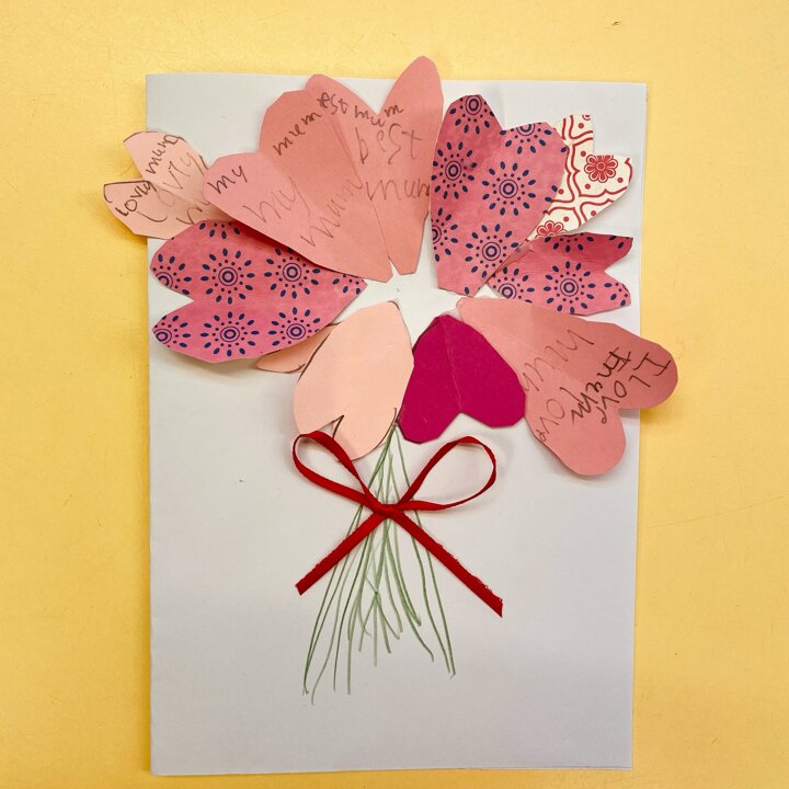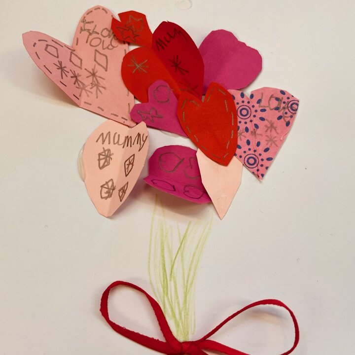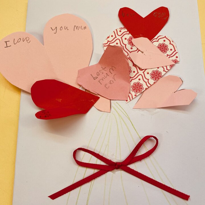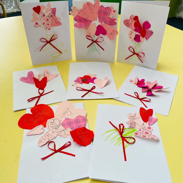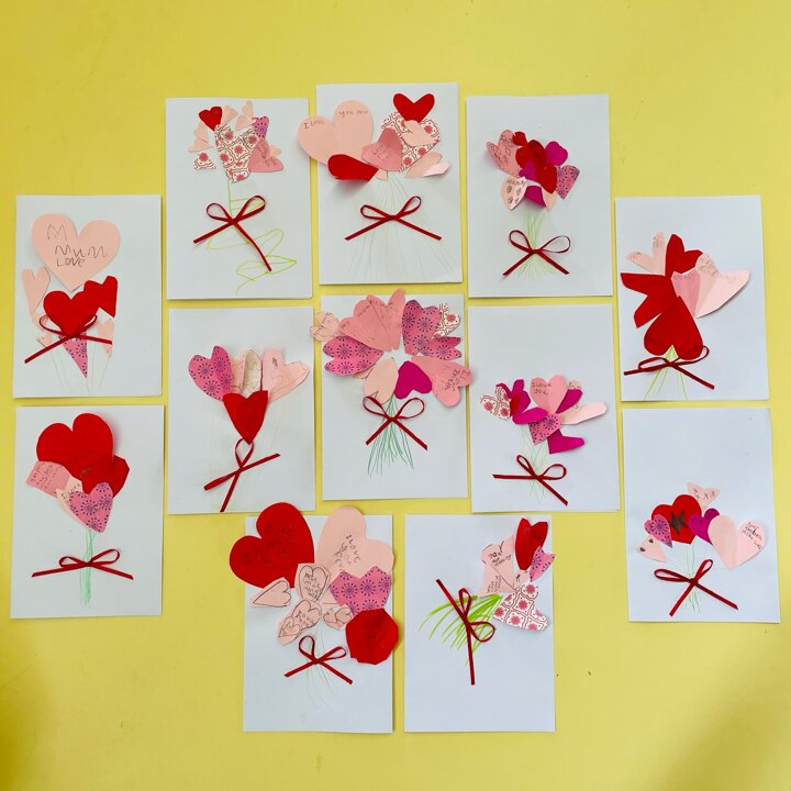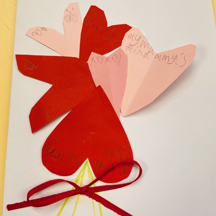 The Reception children made some zig zag cards saying how they love their mummies to pieces whilst the Year 1 and 2 children made special heart shaped bunches of flowers with special messages on them.