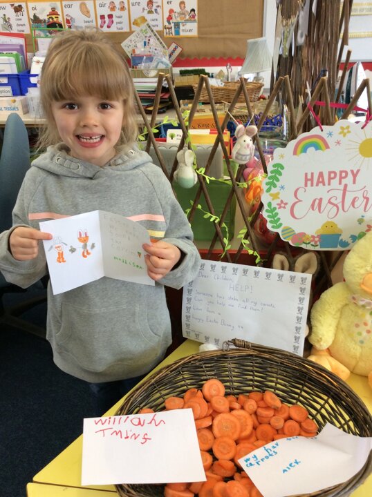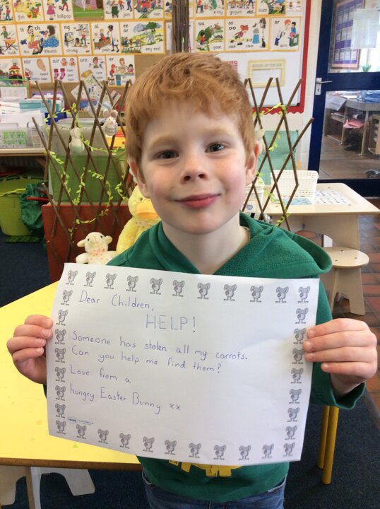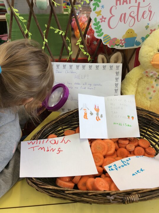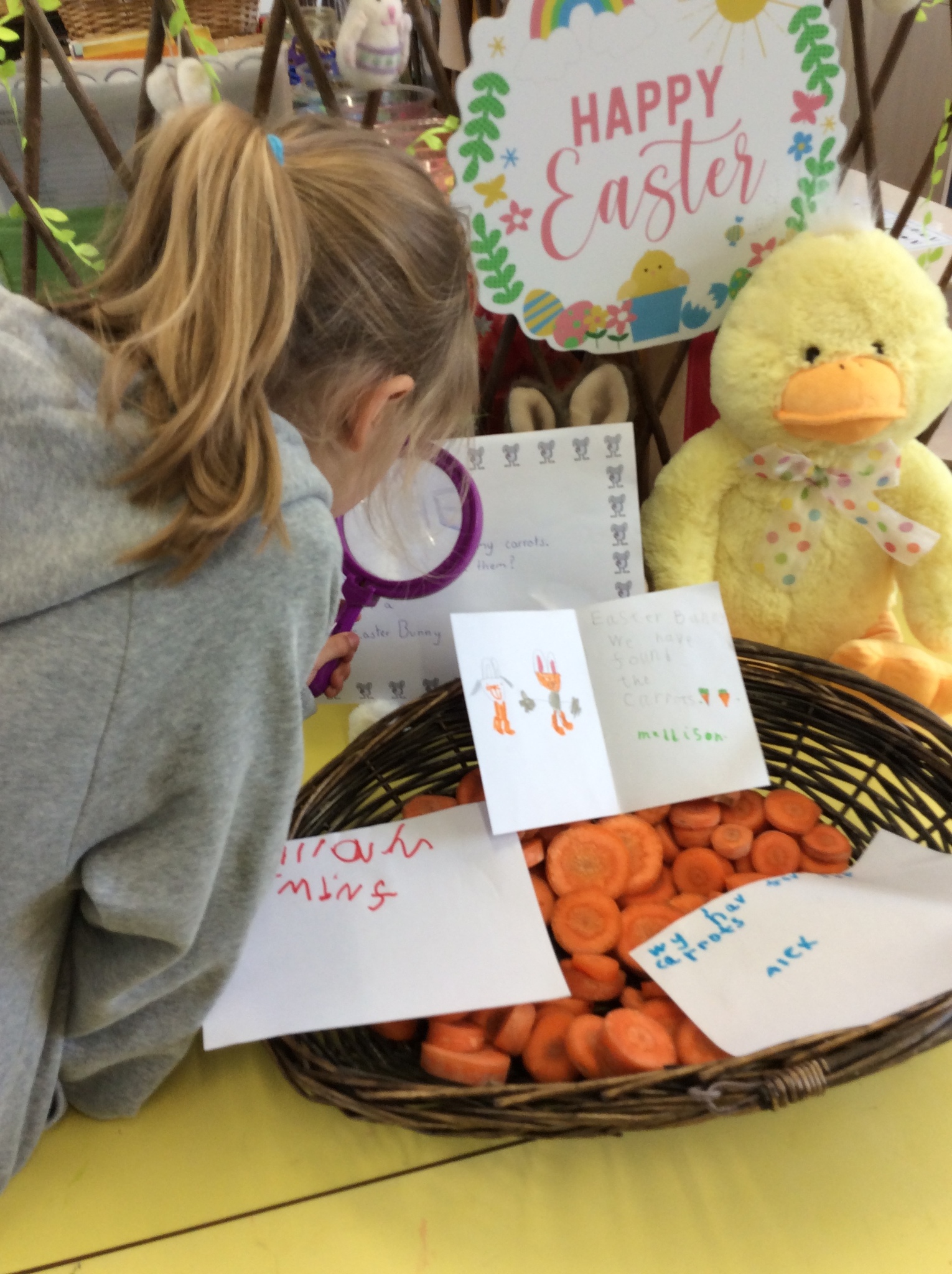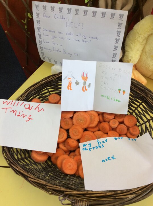 The children were very, very excited by the letter and Maddison told us all that she knew that the Easter Bunny could be invisible and hide behind trees and that she thought maybe the Easter Bunny was still at school. This got all the children thinking and they had fabulous ideas about where he could be. They even went looking for clues around the room to see if they could find him.