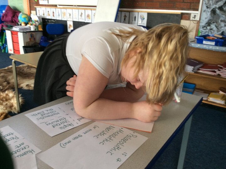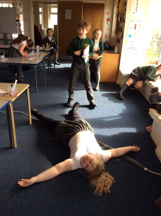 Next, the children played a stone-age themed game of among us. This saw the children play roles as 'tribespeople' and complete tasks such as filling up water for the camp by using times-tables skills, upgrading adjectives to tell their ancestors stories and using art skills to draw palaeolithic animals. Our Imposter, Sophie, however was busy secretly sending tribespeople to the sabre-tooth tiger cave! The children had fantastic fun with this game.