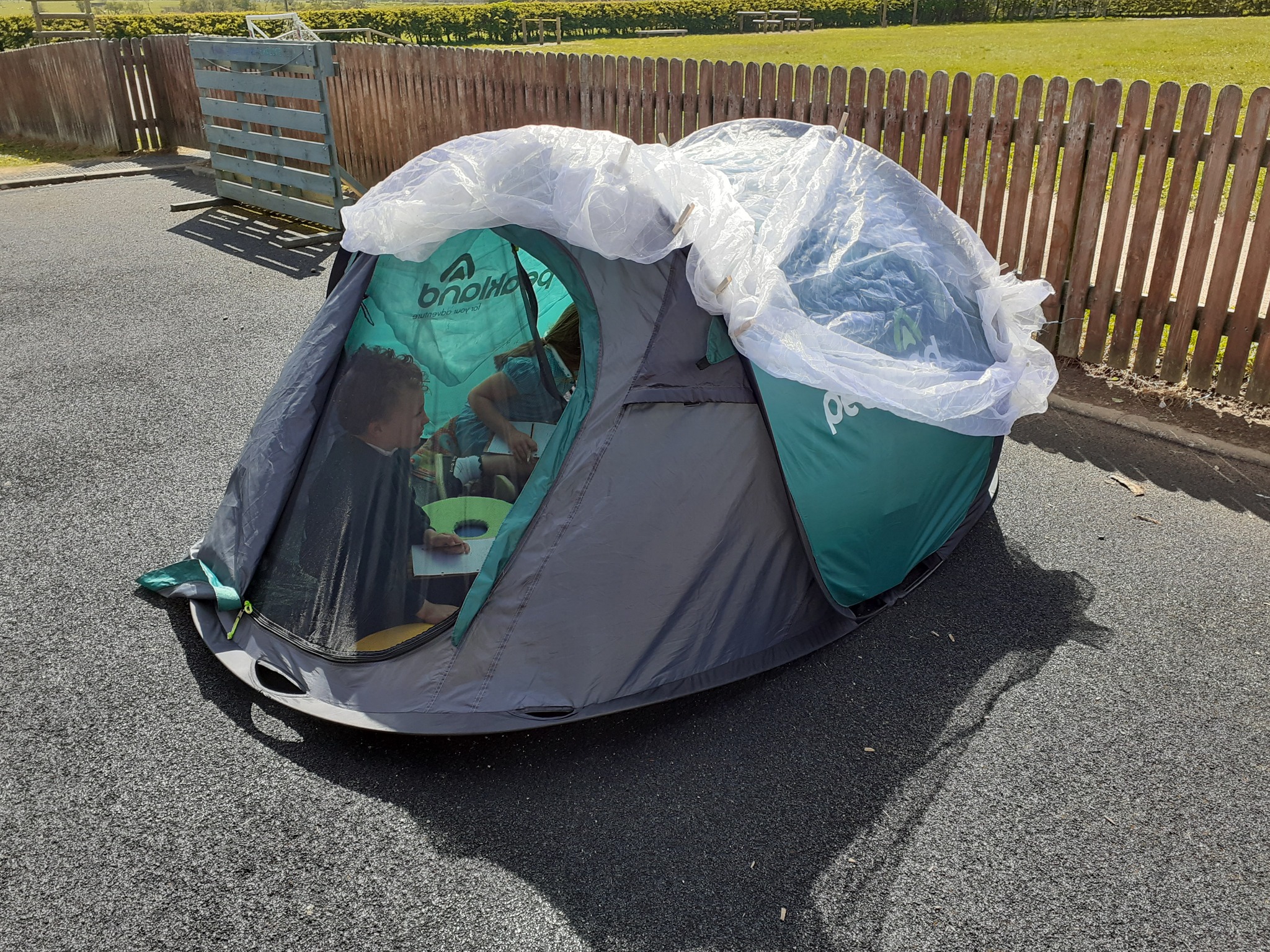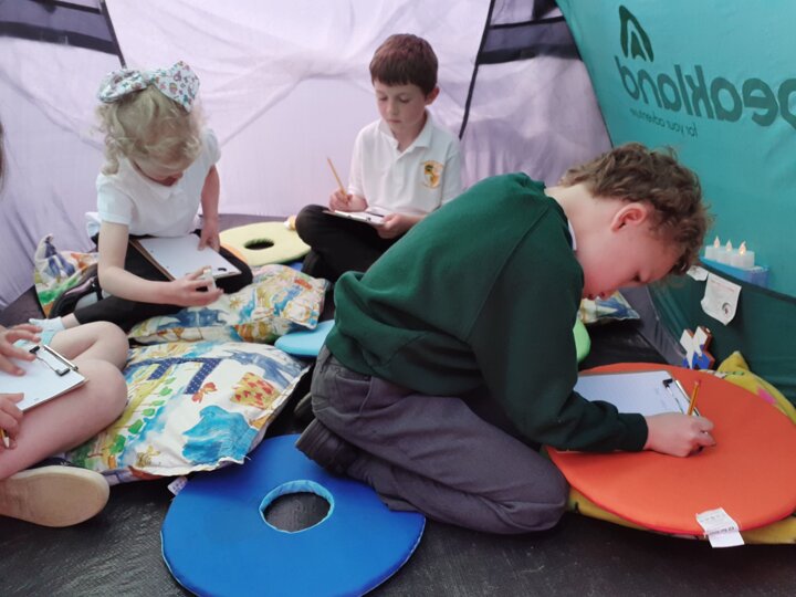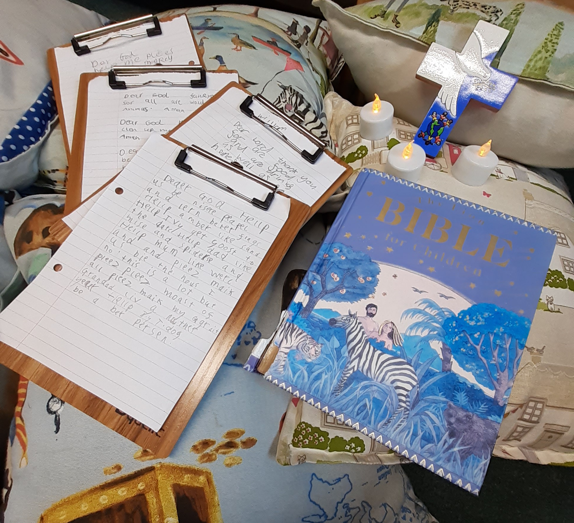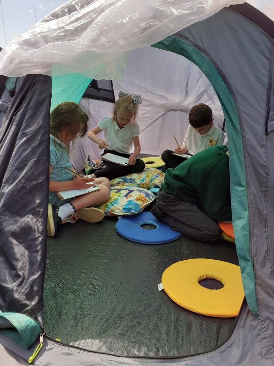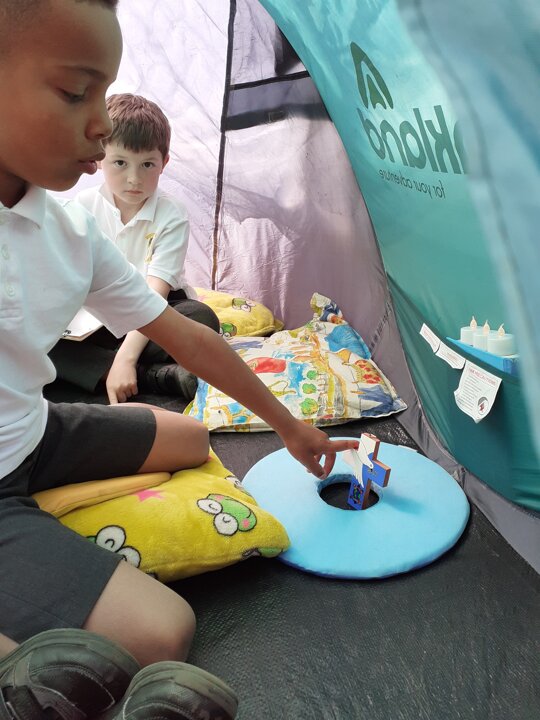 We're learning about Special Places in RE this half term. Moses spoke to God in the tent (Tabernacle) he built, we read the story of this in the Bible in Numbers 7:89. Today we have started to create our own Prayer Tent; the children draped fabric over a play tent we had, in order to make it a more special tent. The children were then tasked with the idea of collecting items they felt would help further create a Prayer Tent. They chose a Bible, a cross, 3 electric candles, cushions, a rug and a teddy. We had heard how in the tabernacle the lamps are lit and kept burning as a symbol of the presence of God. Year 2 were the first to create and go in our tent to talk to God through prayer.