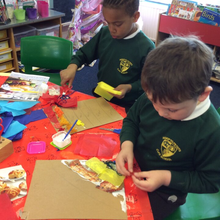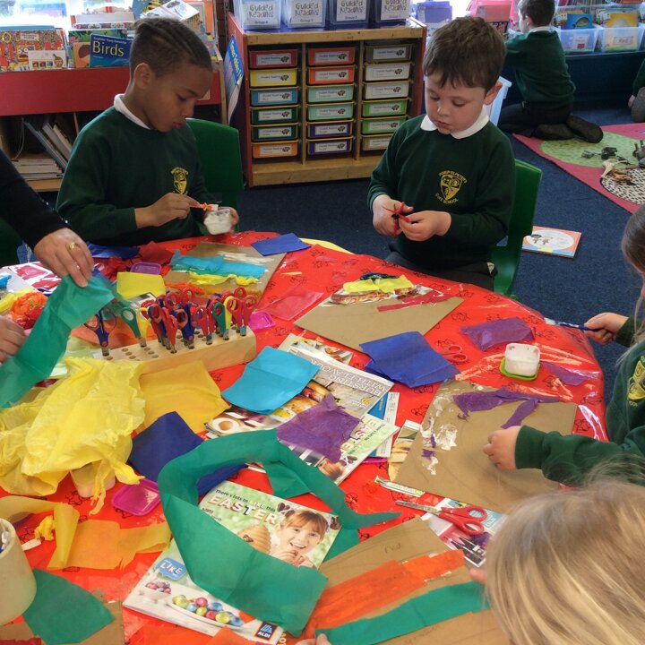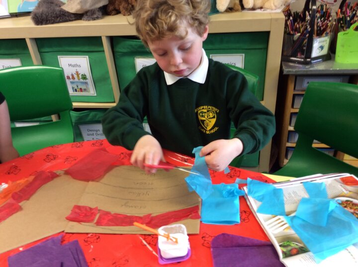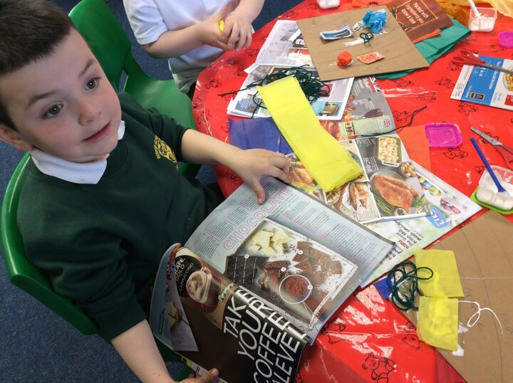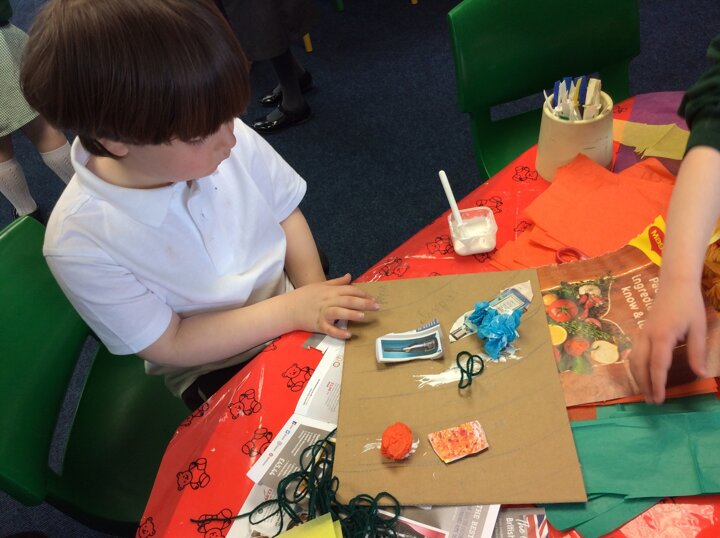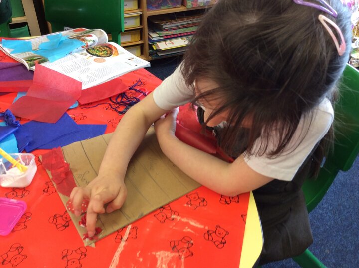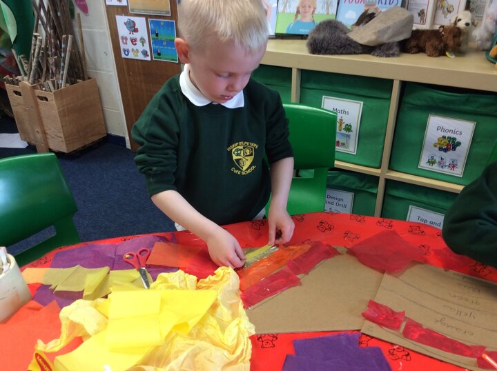 The Reception children sorted through magazines cutting out pictures, colour sorting and matching. They were making their fingers strong to help them hold a pencil for writing with all the tearing, ripping and scrunching of the paper to make the rainbow.
