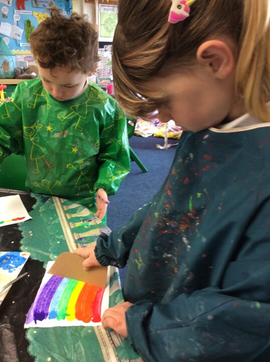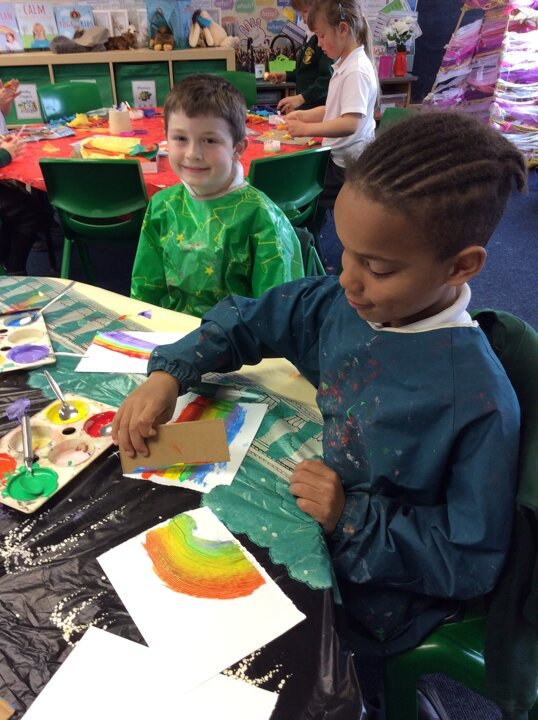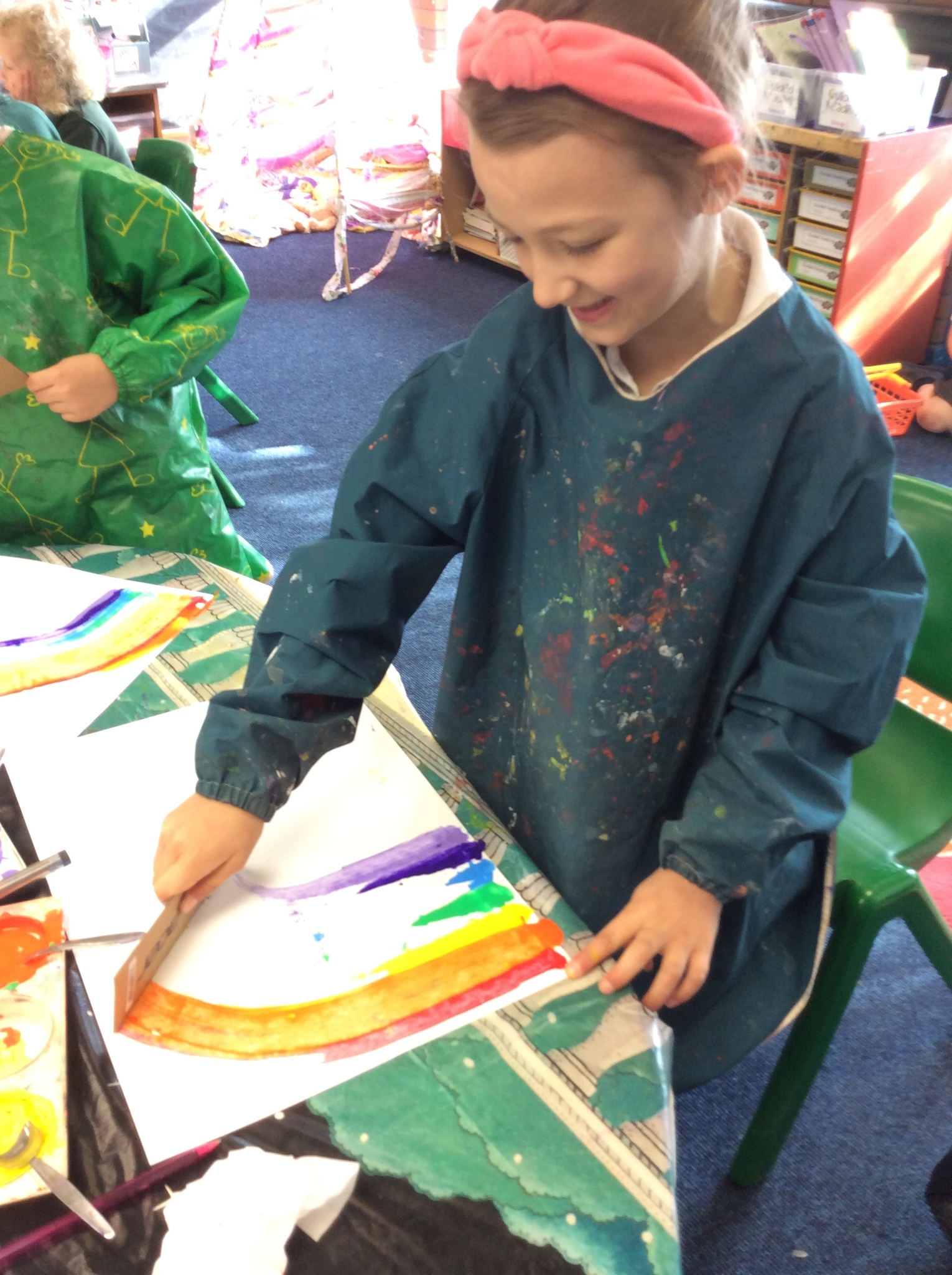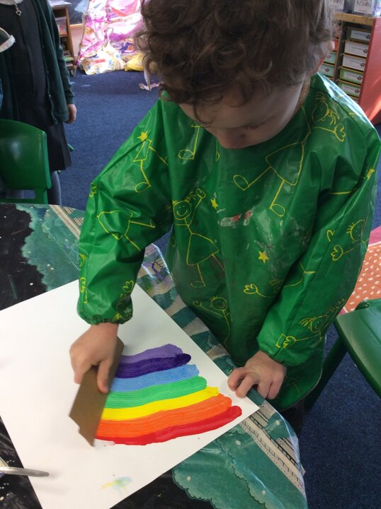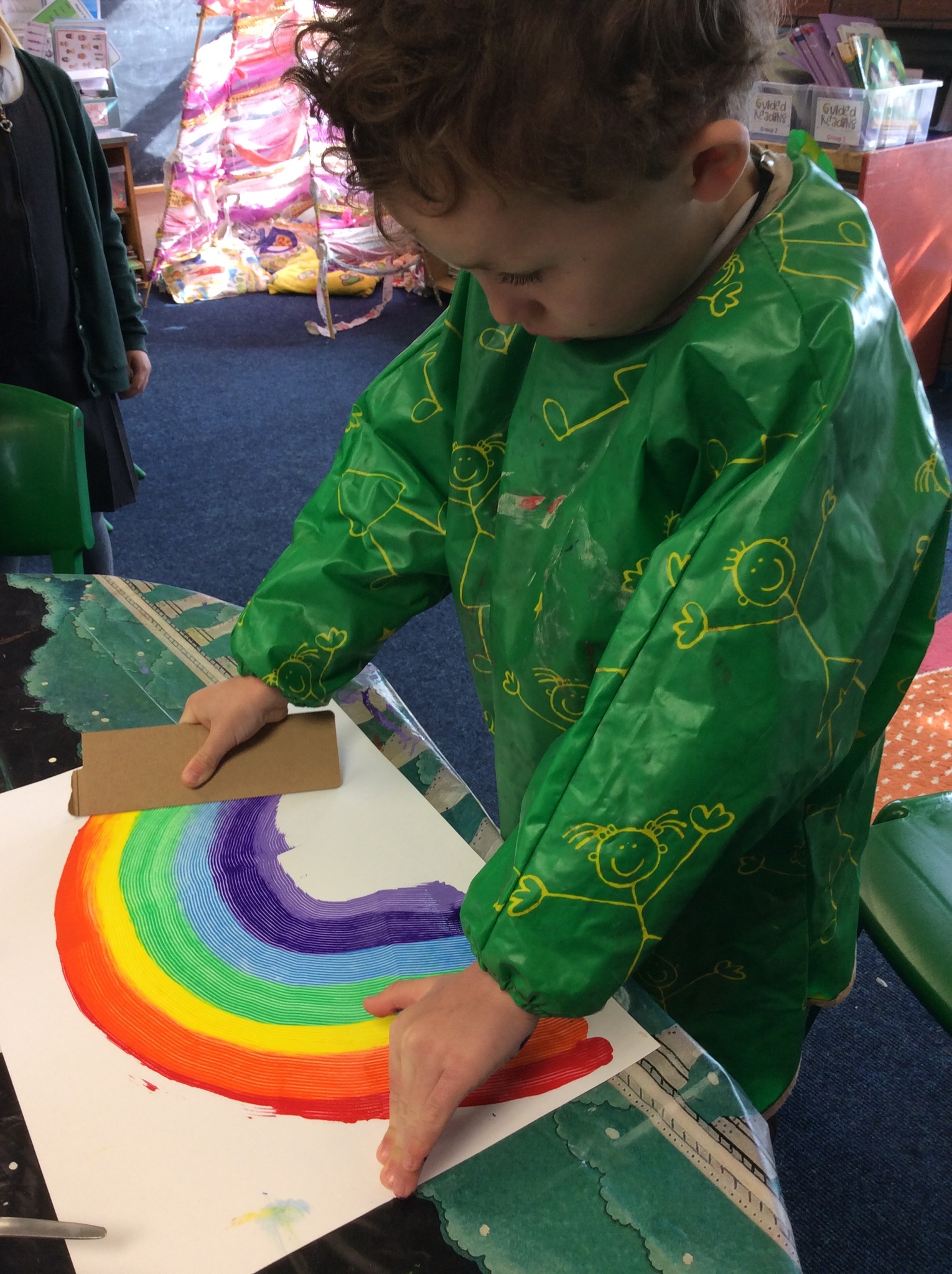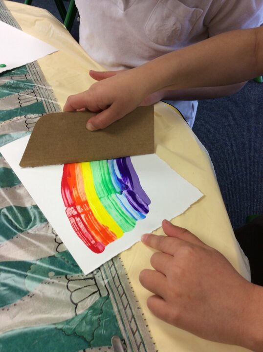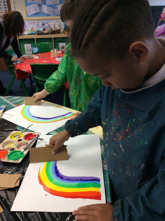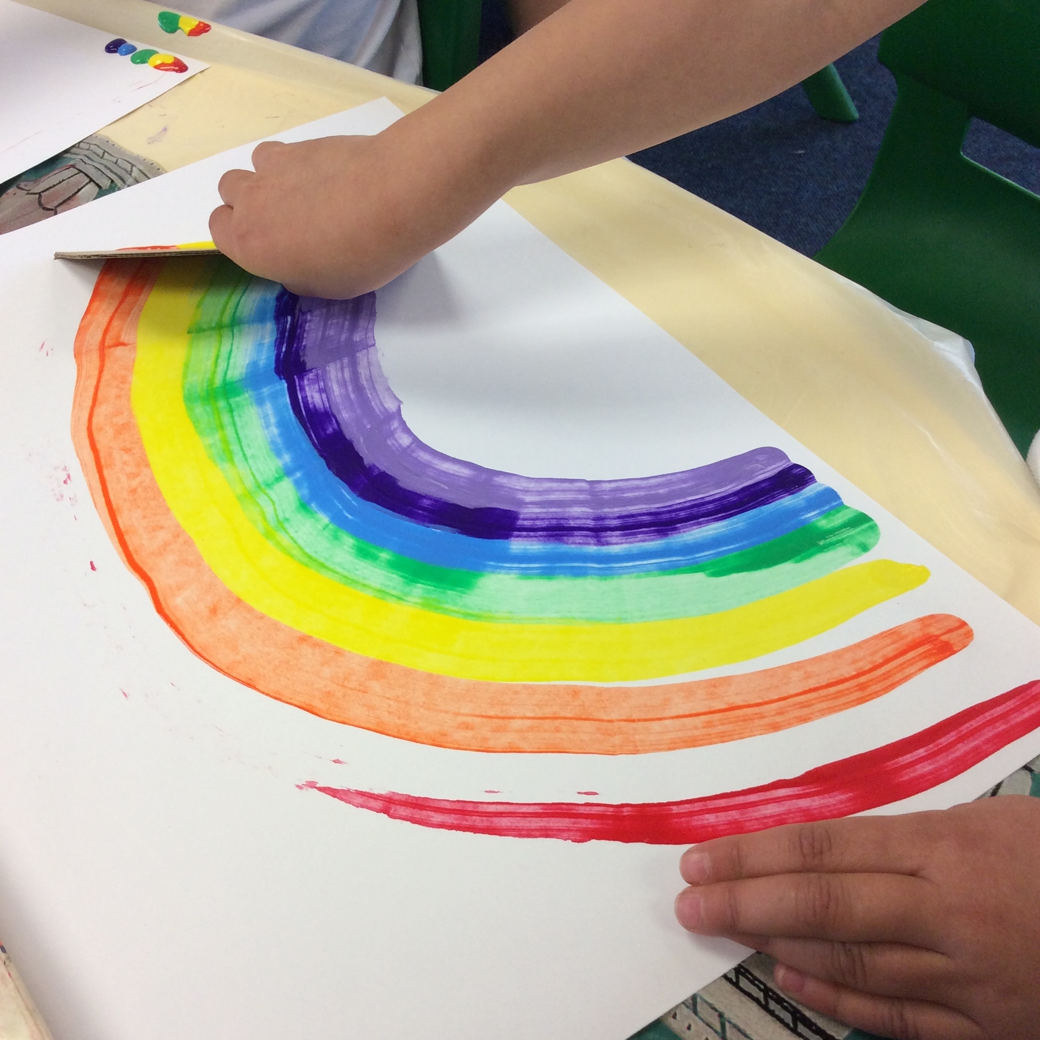 The Year 1 & 2 children learnt a new technique of dragging paint across paper with a piece of cardboard to create a fabulous paint effect. They practised the technique on small pieces of paper first to learn how much pressure they needed to put on the cardboard and get a ‘feel’ of the technique. They loved it and are so proud of their rainbows (as am I!).