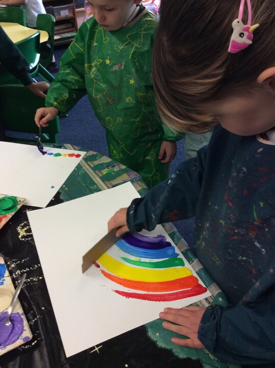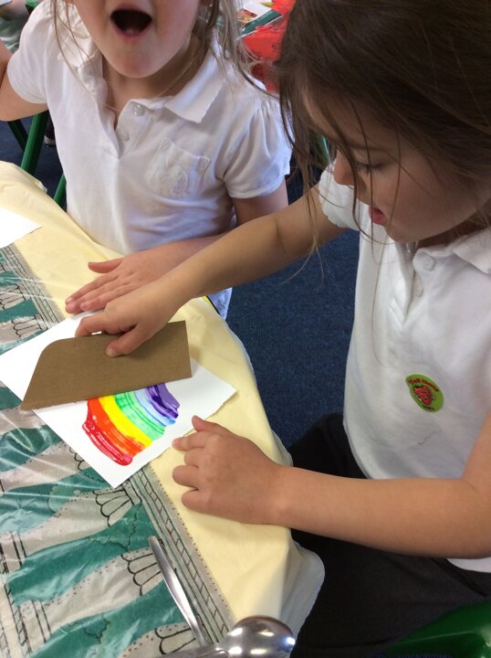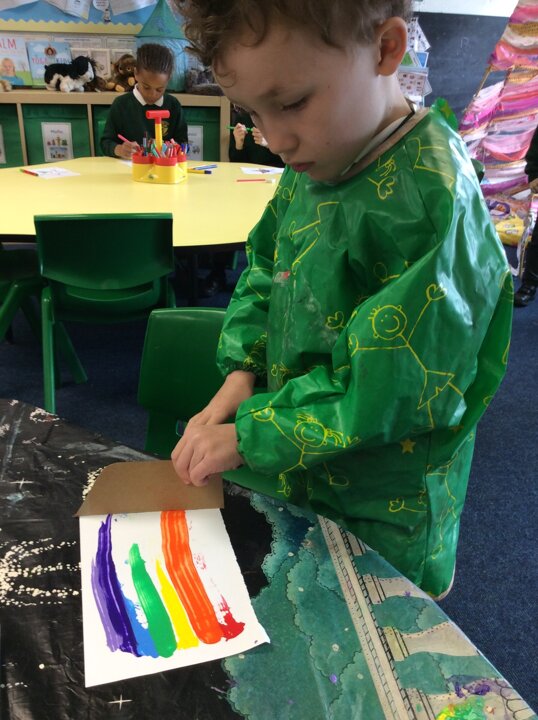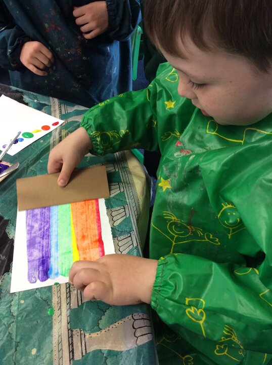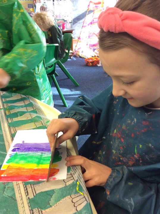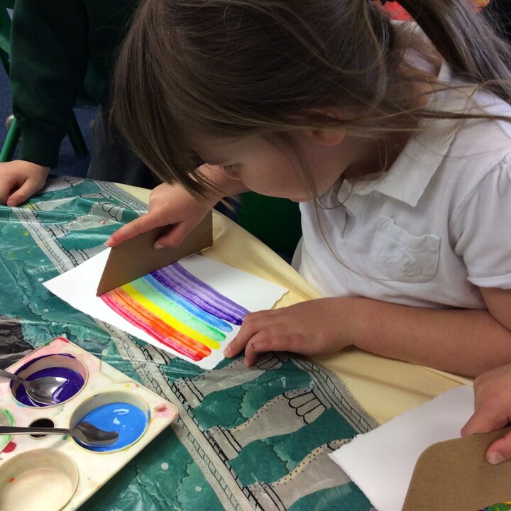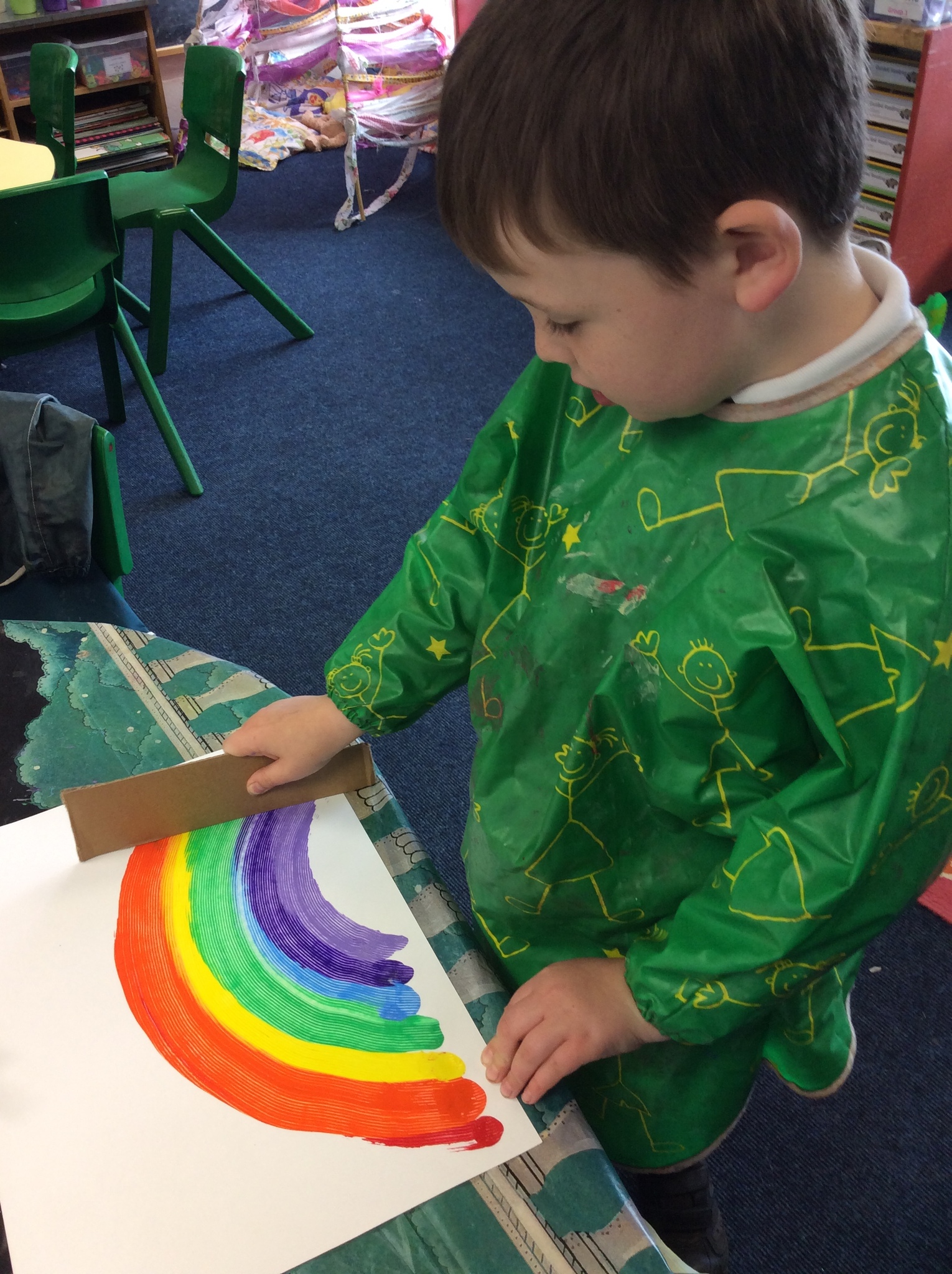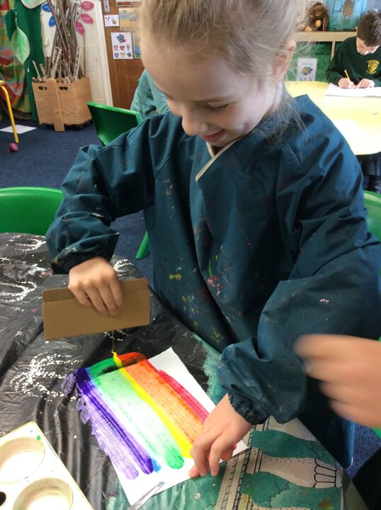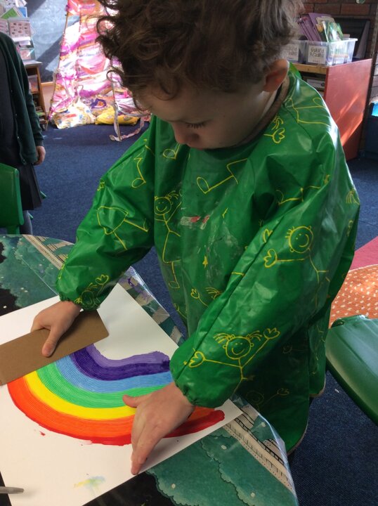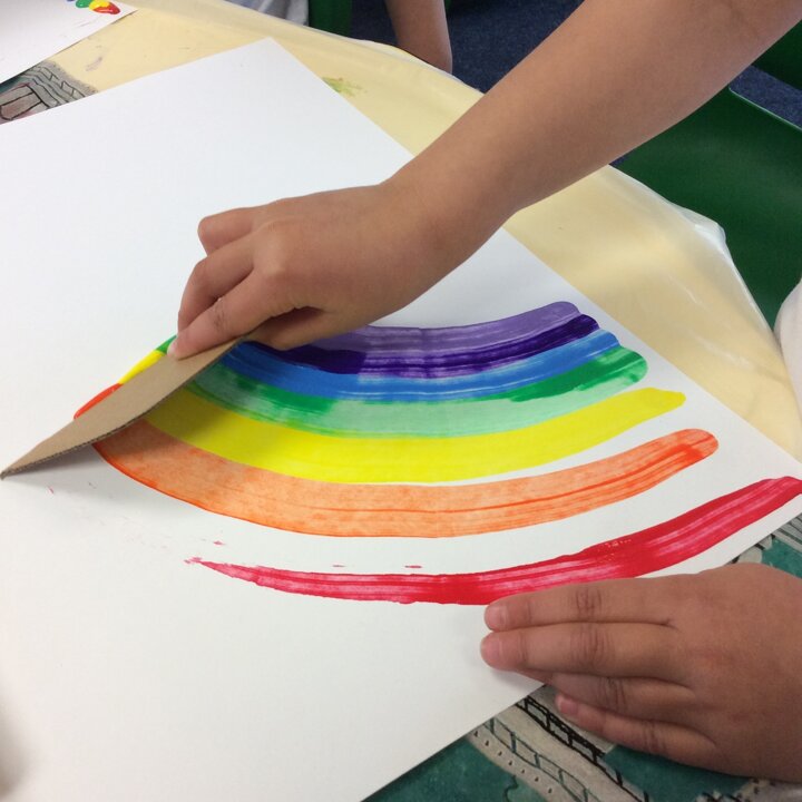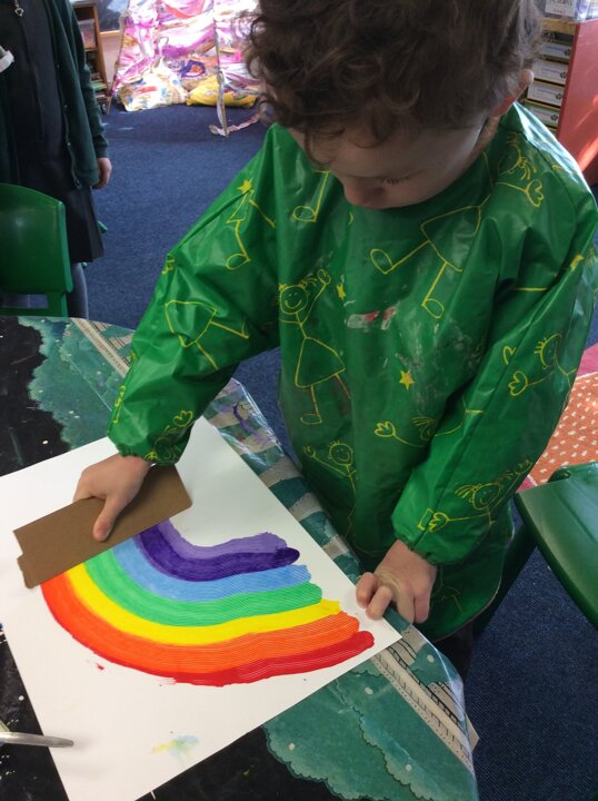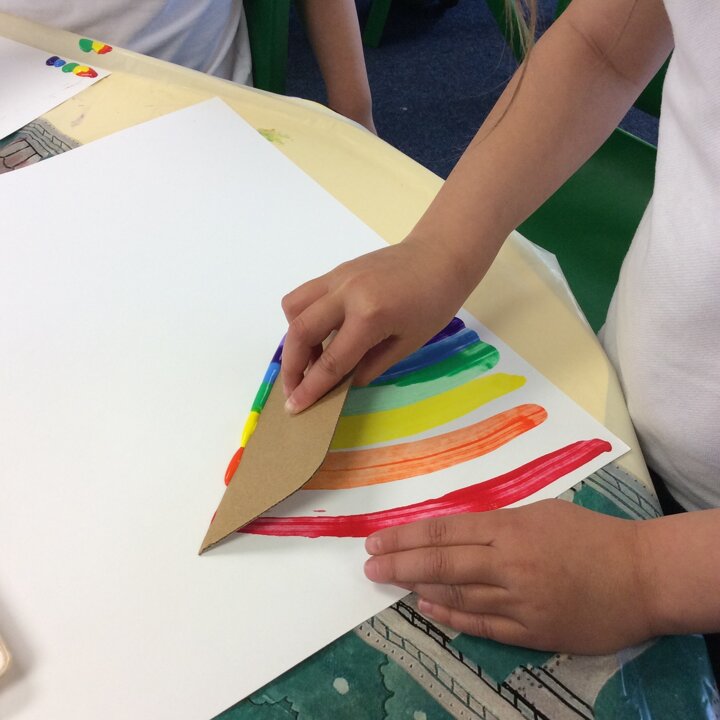The Year 1 & 2 children learnt a new technique of dragging paint across paper with a piece of cardboard to create a fabulous paint effect. They practised the technique on small pieces of paper first to learn how much pressure they needed to put on the cardboard and get a ‘feel’ of the technique. They loved it and are so proud of their rainbows (as am I!).