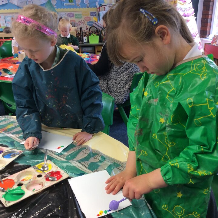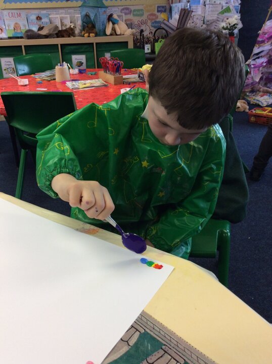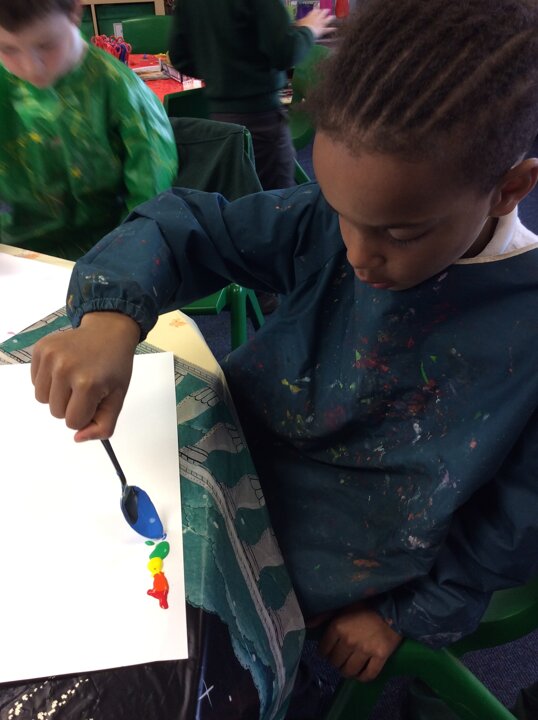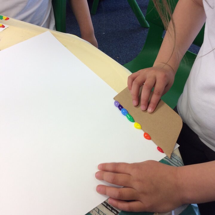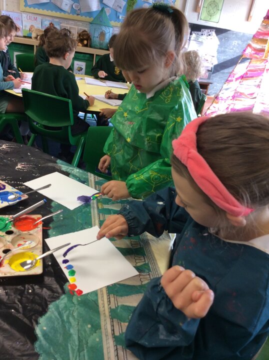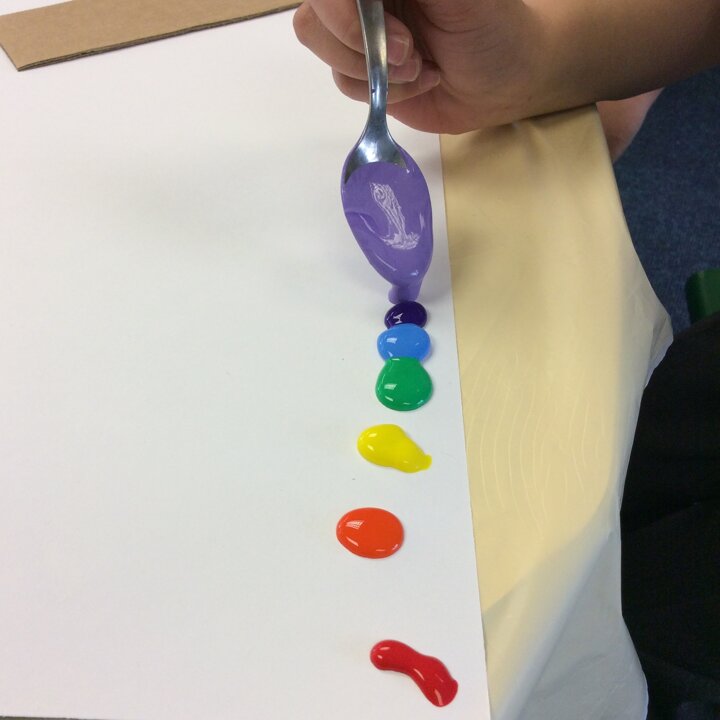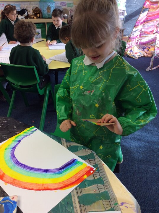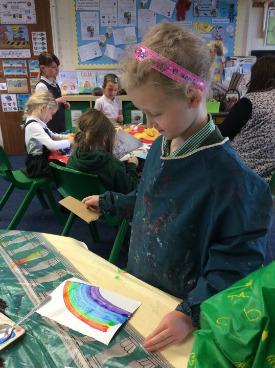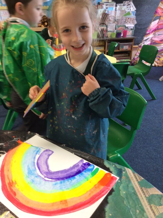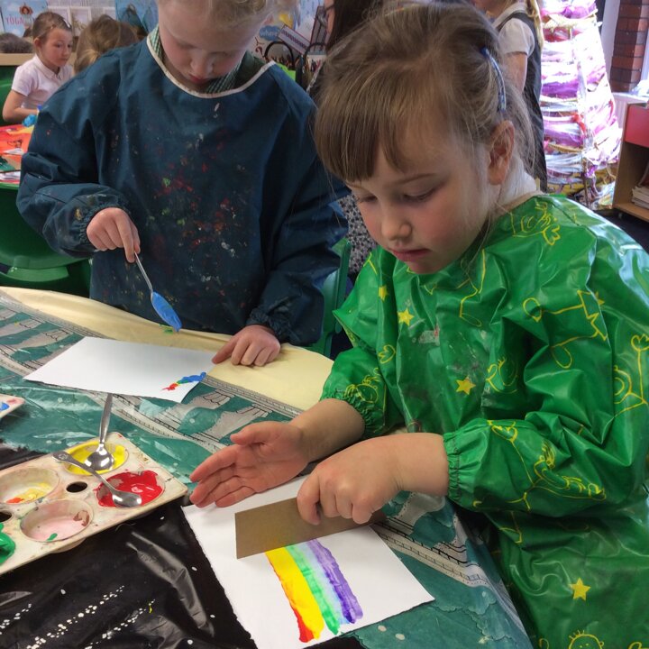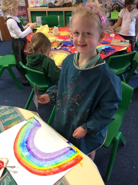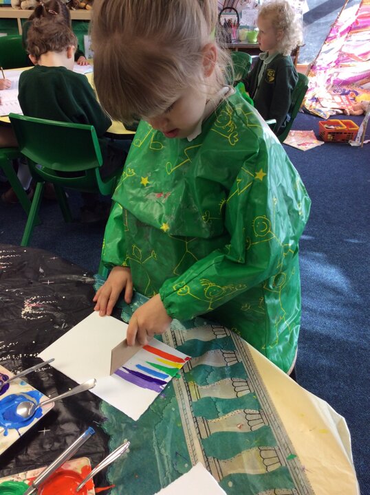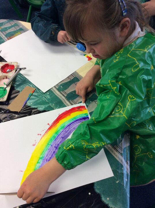 The Year 1 & 2 children learnt a new technique of dragging paint across paper with a piece of cardboard to create a fabulous paint effect. They practised the technique on small pieces of paper first to learn how much pressure they needed to put on the cardboard and get a ‘feel’ of the technique. They loved it and are so proud of their rainbows (as am I!).