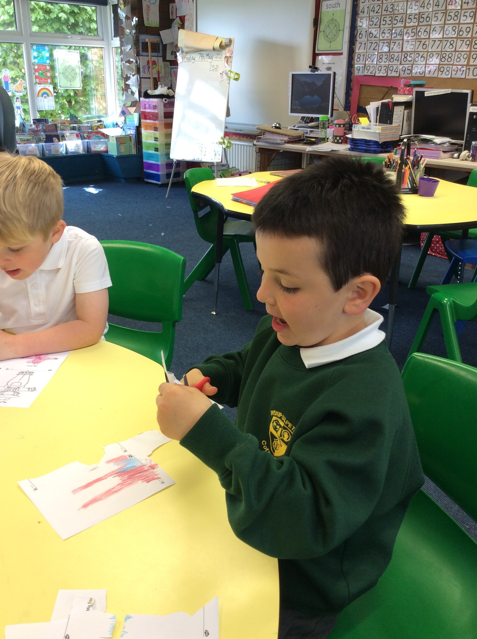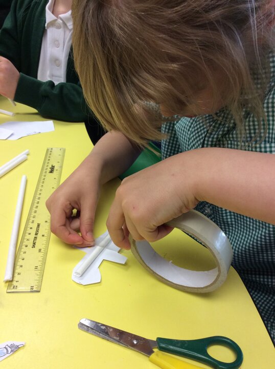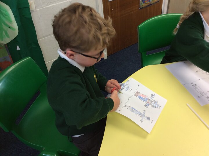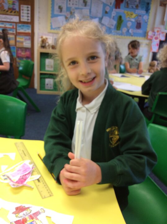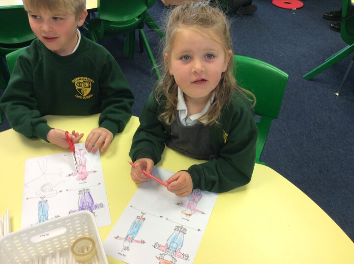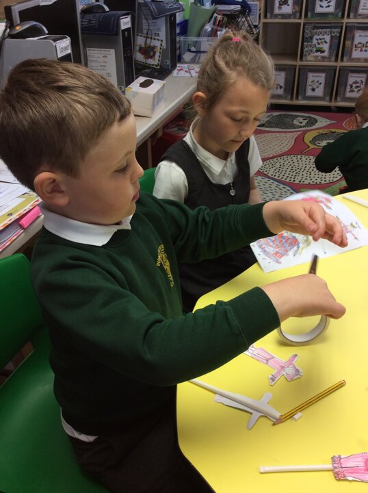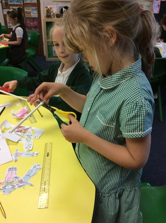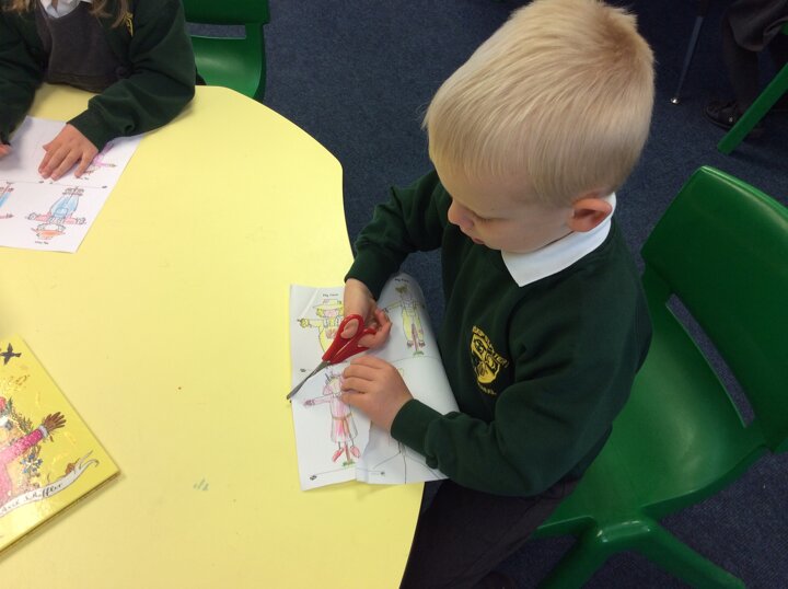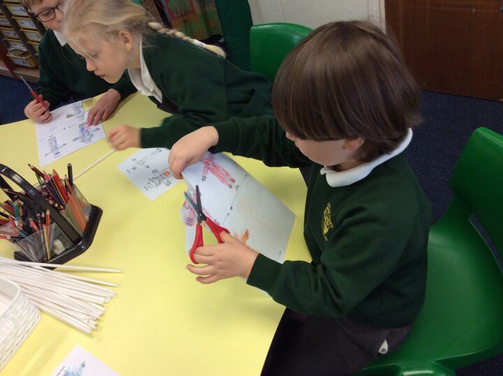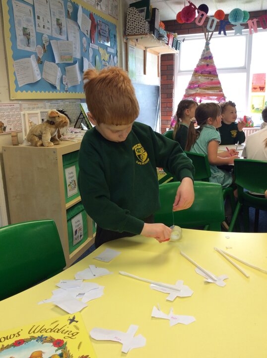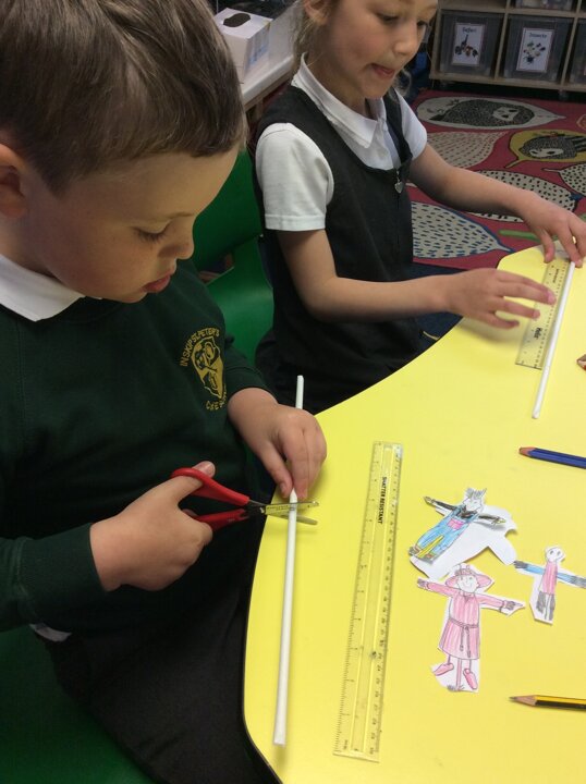 The Reception and Year 1 children have made puppets and played with them, really impressing me with their retelling of The Scarecrow’s Wedding and their own stories they have been making up. I was also really impressed with their growing independence as they measured to work out where the halfway point of their straws were. Lots of maths talk and thinking as they knew the two parts had to be equal length to make a half. All the children cut the straws and attached their puppets to them with sellotape, judging sizes and making decisions as to where to cut the sellotape for it to be the right size.