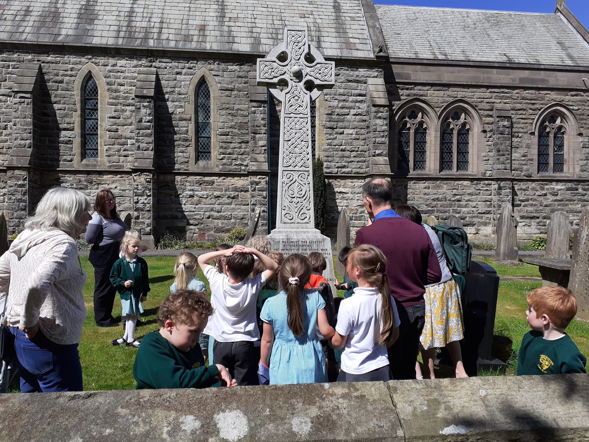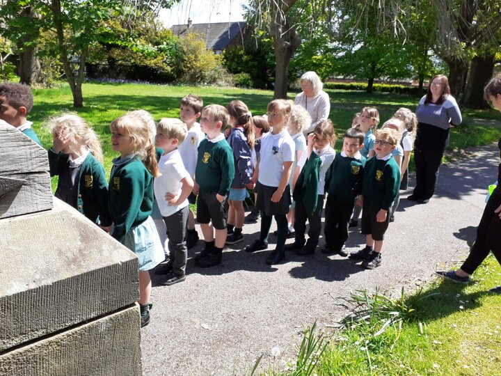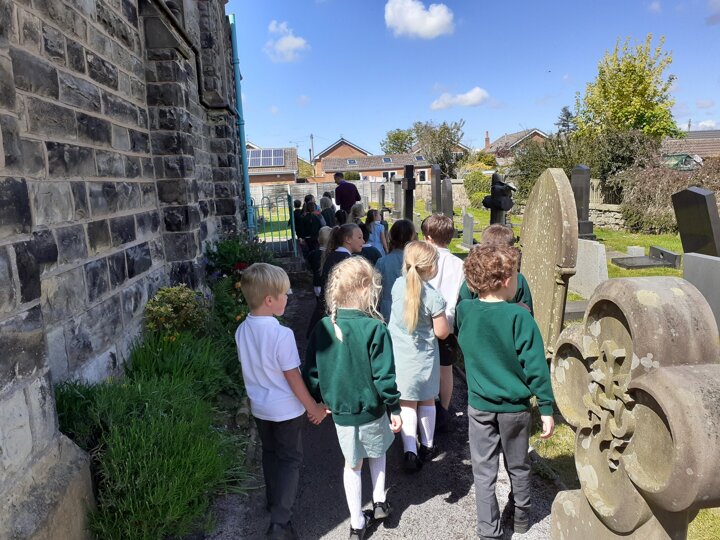 Revd Paul took us on walks around both the church and the graveyard, explaining the meaning and history of what we saw as we went. We learnt about the font, alter, pulpit, lectern and pews along with the stained glass windows, kneelers, organ and monuments, the children were great at explaining what they thought something was for, often refering to Bible stories they knew in their answers. We went in the vestry where Revd Paul showed us his vestments and explained how he gets ready for a service and walked around the outside of the church looking at graves and visiting the war memorial.