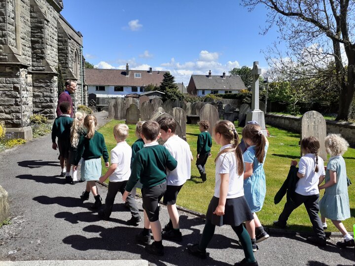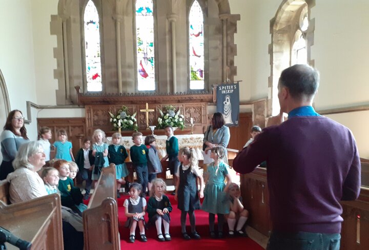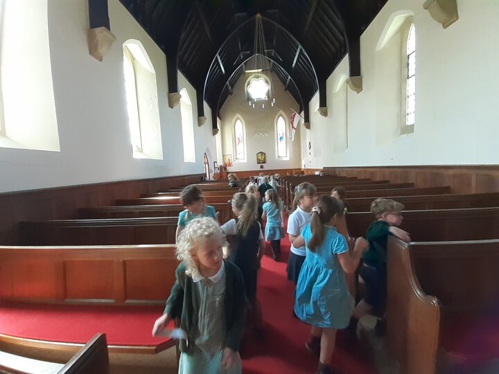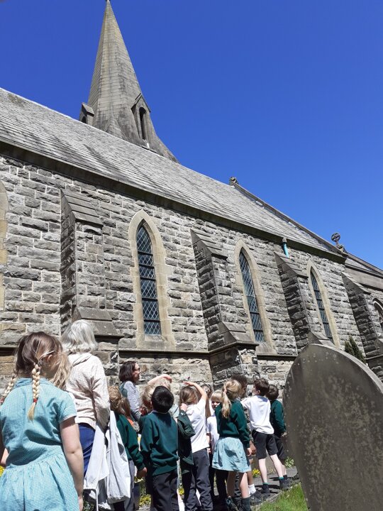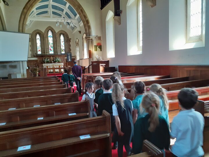 As part of our RE unit this half term, 'Why is the church a special place for Christians?' Revd Paul invited us to visit him at St. Peter's Church. It was a lovely sunny day and our walk down through the village was enlivened by a cat who walked in front of us all the way down from our school building to the church, even sitting still under the lych gate to listen to Revd Paul welcome us all to St Peter's!
