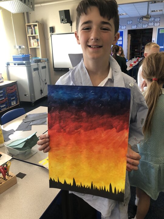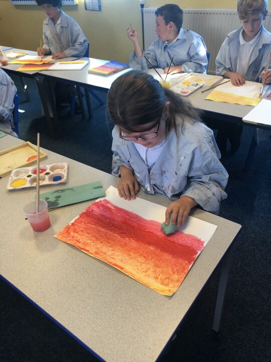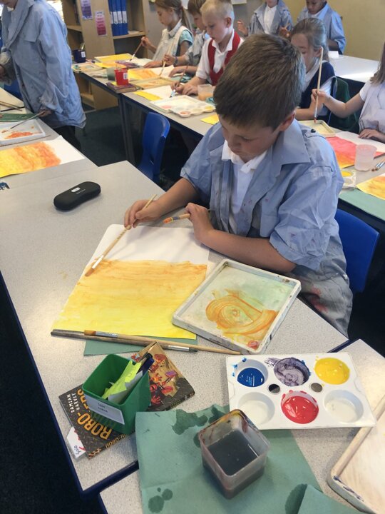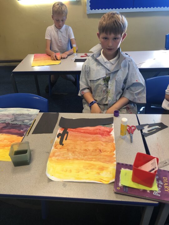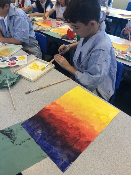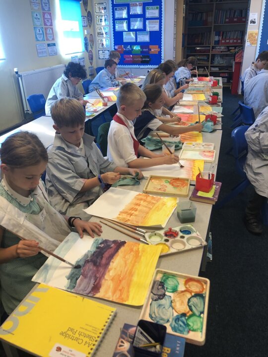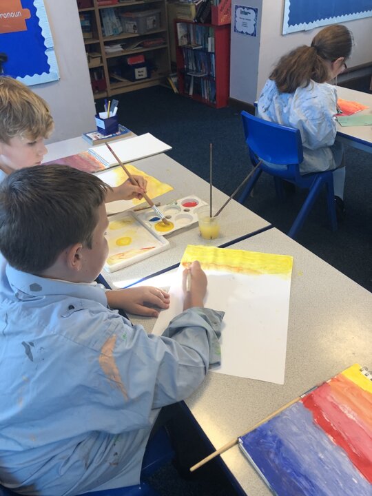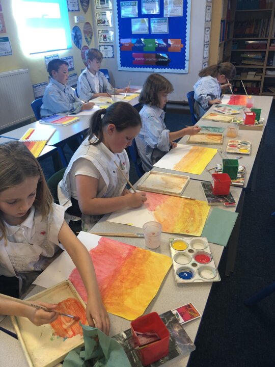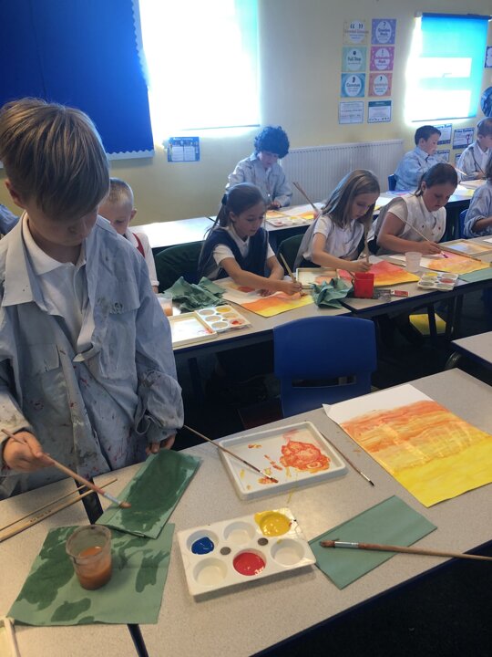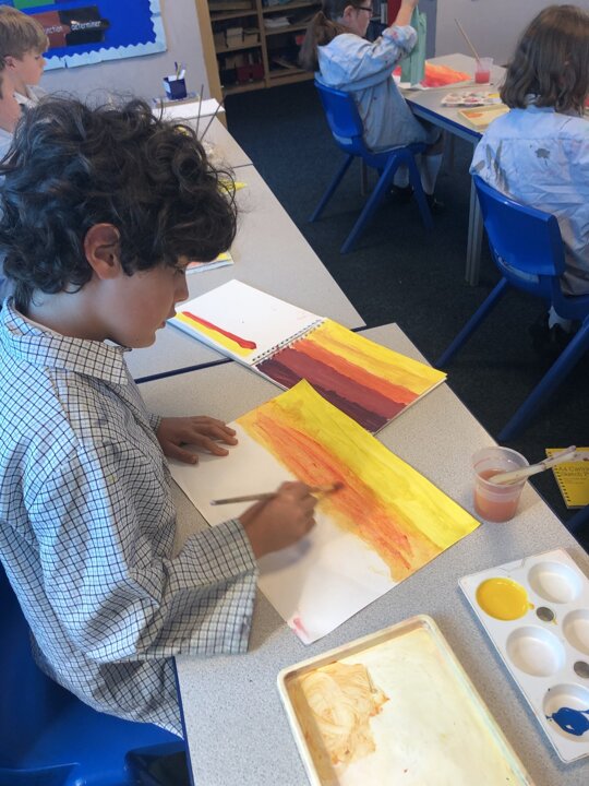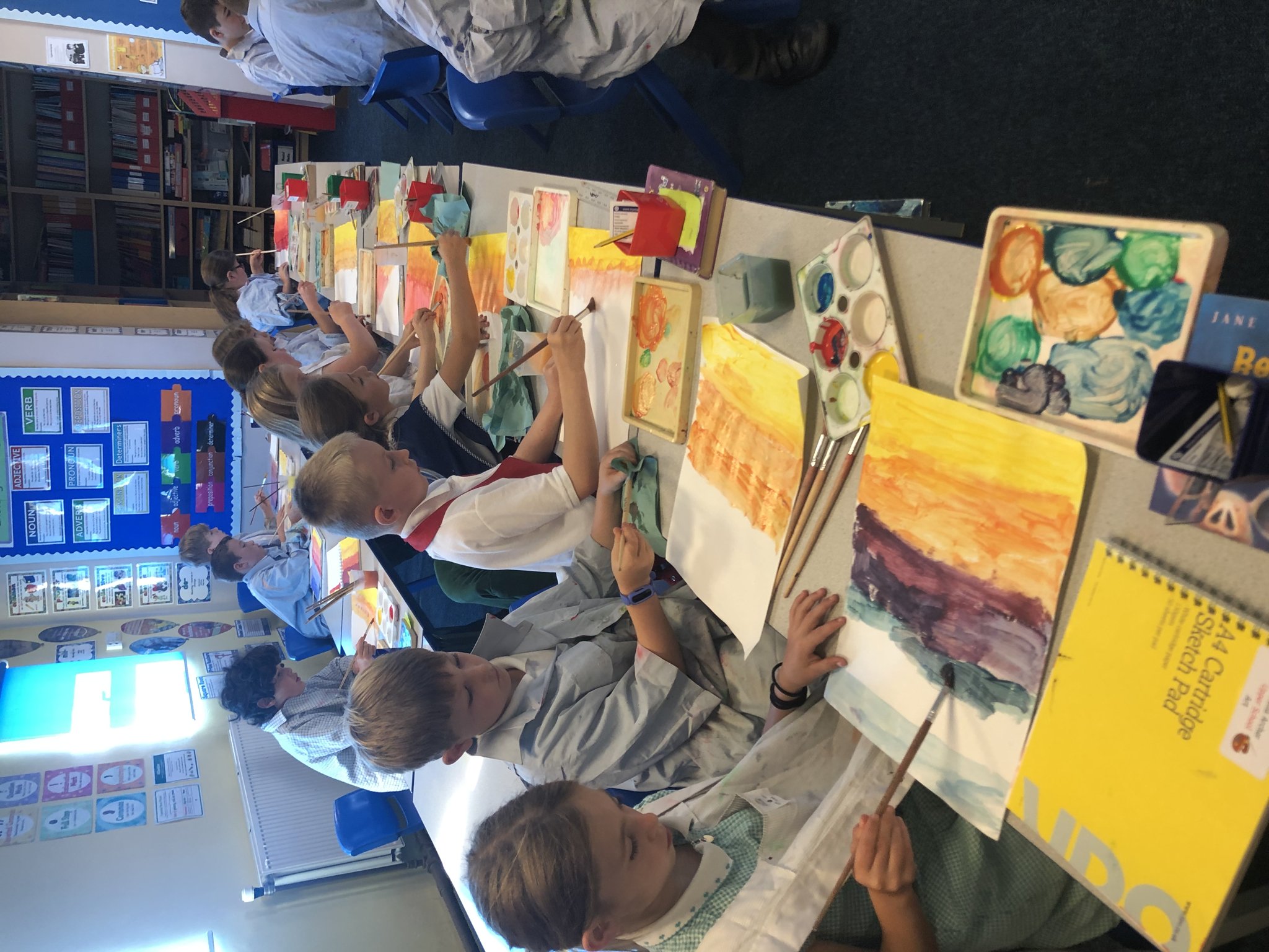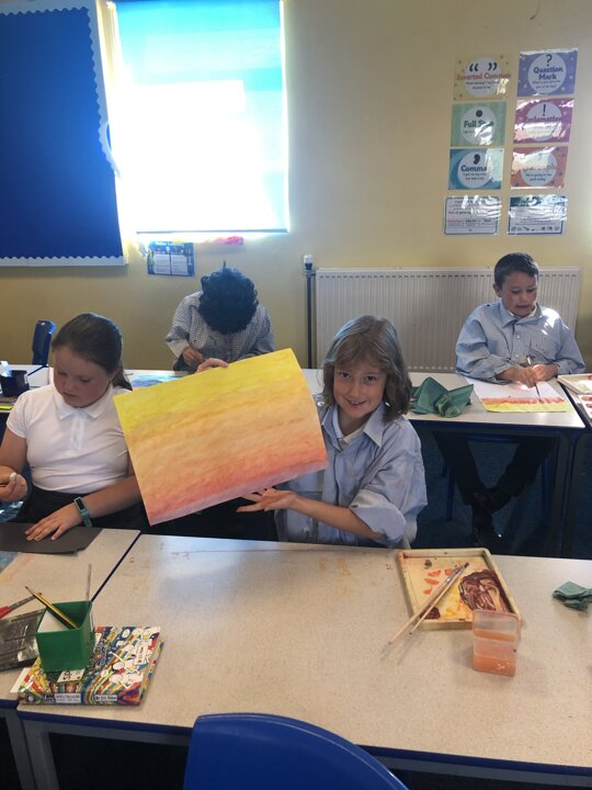 This term, Year 5/6 are working on their painting skills through a number of creative activities. The last couple of sessions have been to explore how to use a mixing palette and mix appropriate colours for a sunset or sunrise picture. The children are only using primary colours plus black and white. They also learnt about blending colours using a dry brush or sponge.