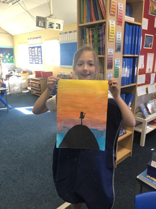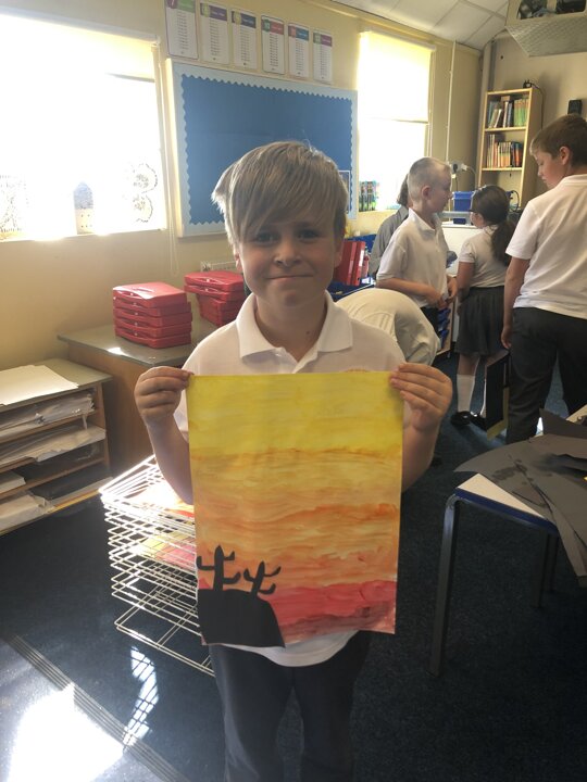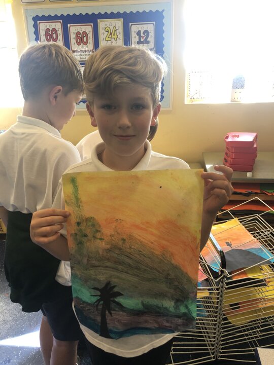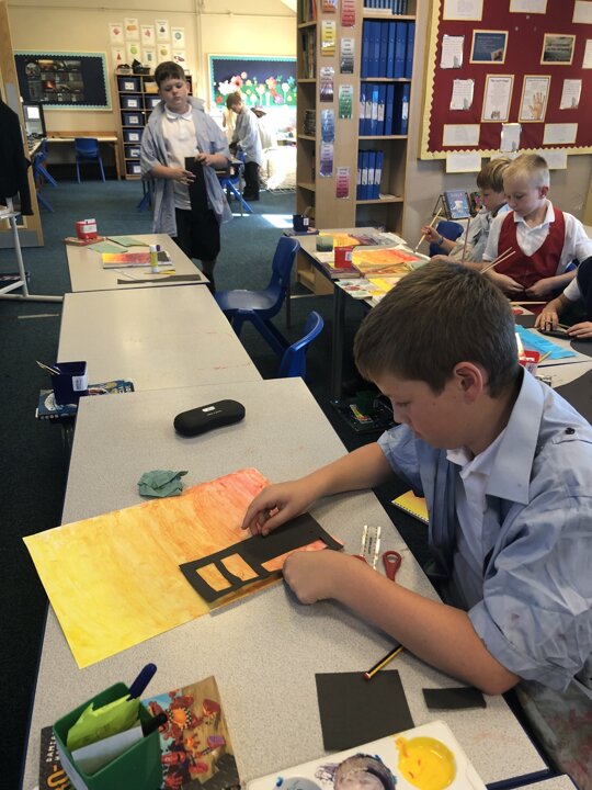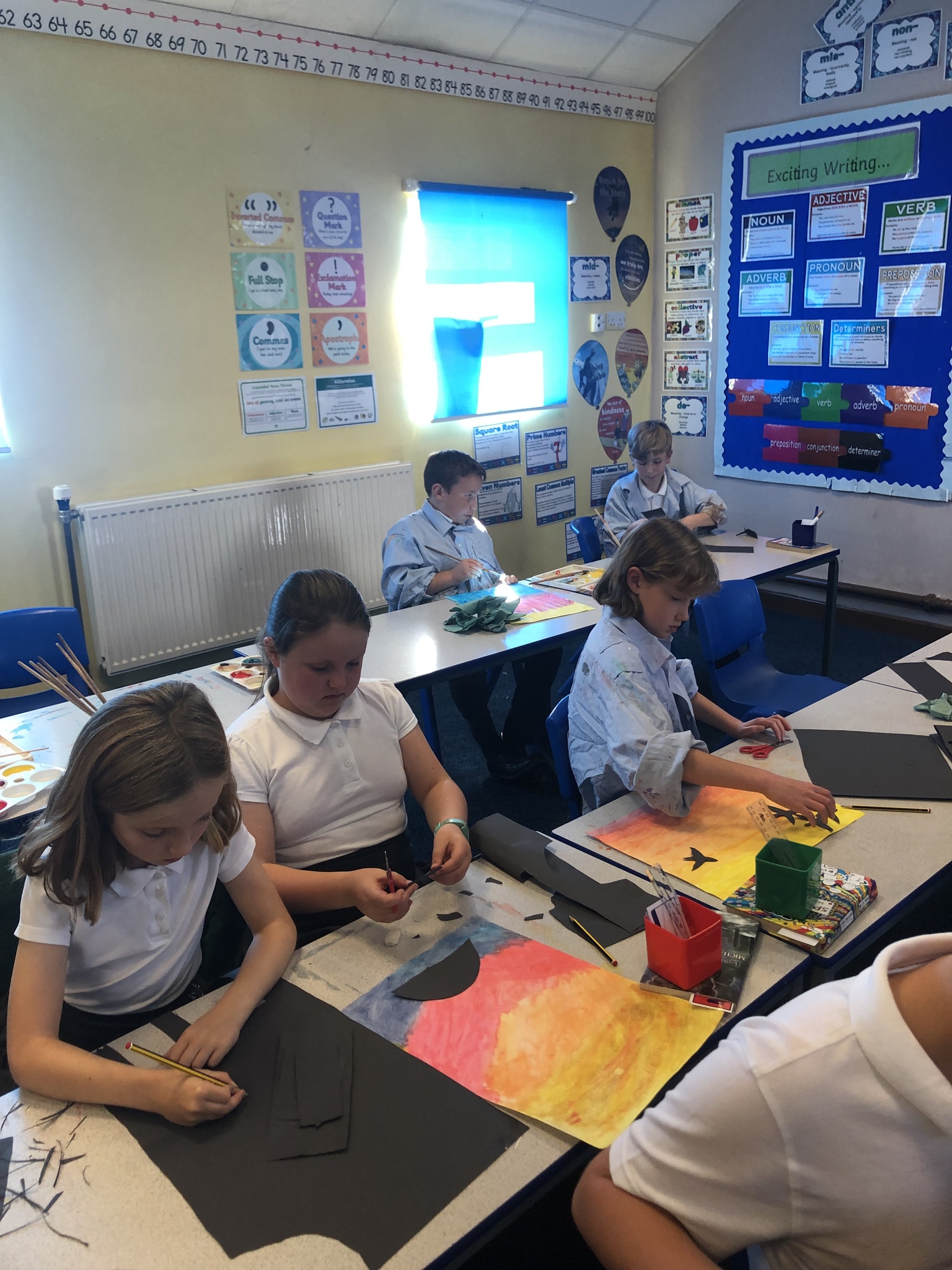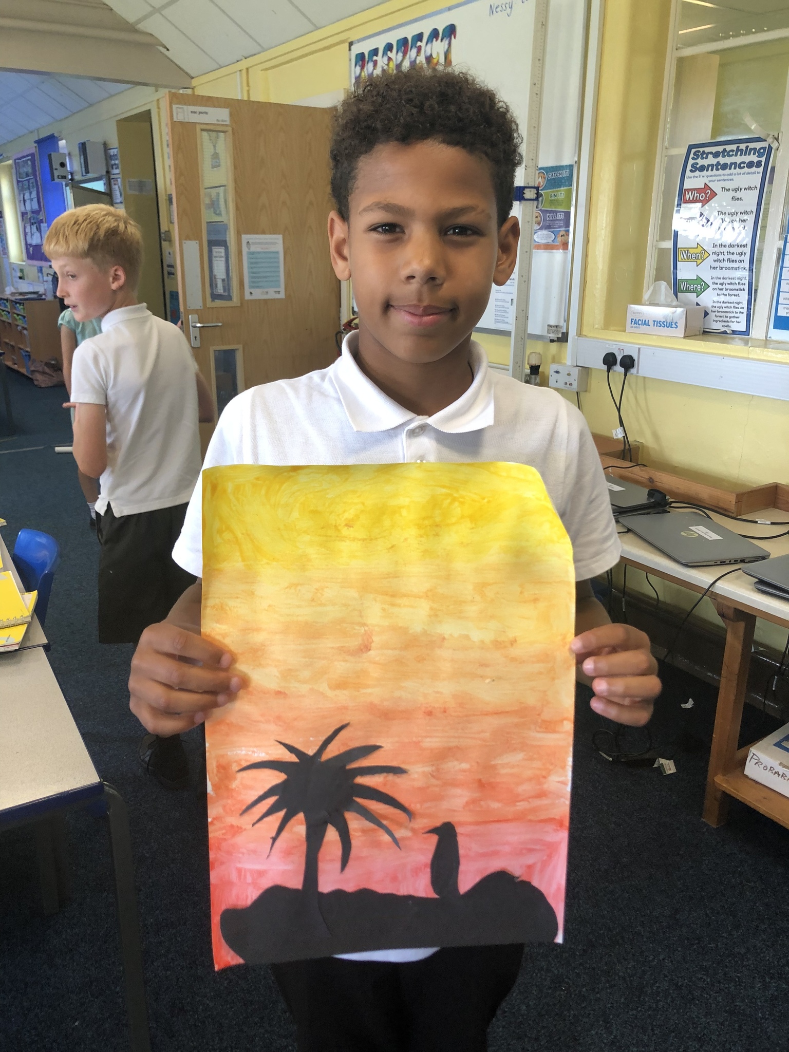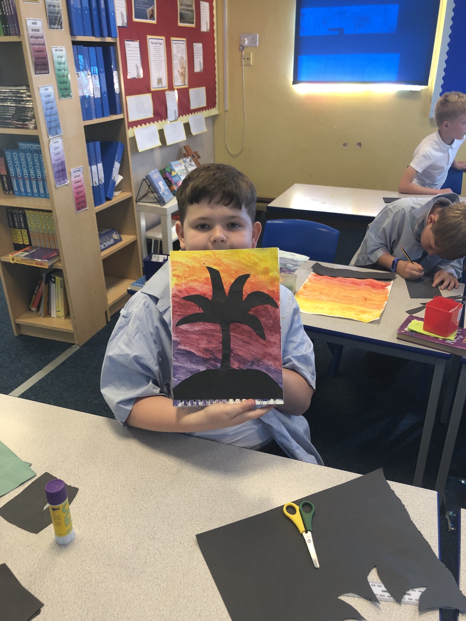 This term, Year 5/6 are working on their painting skills through a number of creative activities. The last couple of sessions have been to explore how to use a mixing palette and mix appropriate colours for a sunset or sunrise picture. The children are only using primary colours plus black and white. They also learnt about blending colours using a dry brush or sponge.