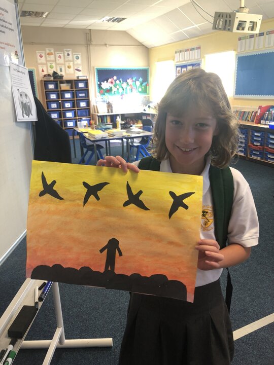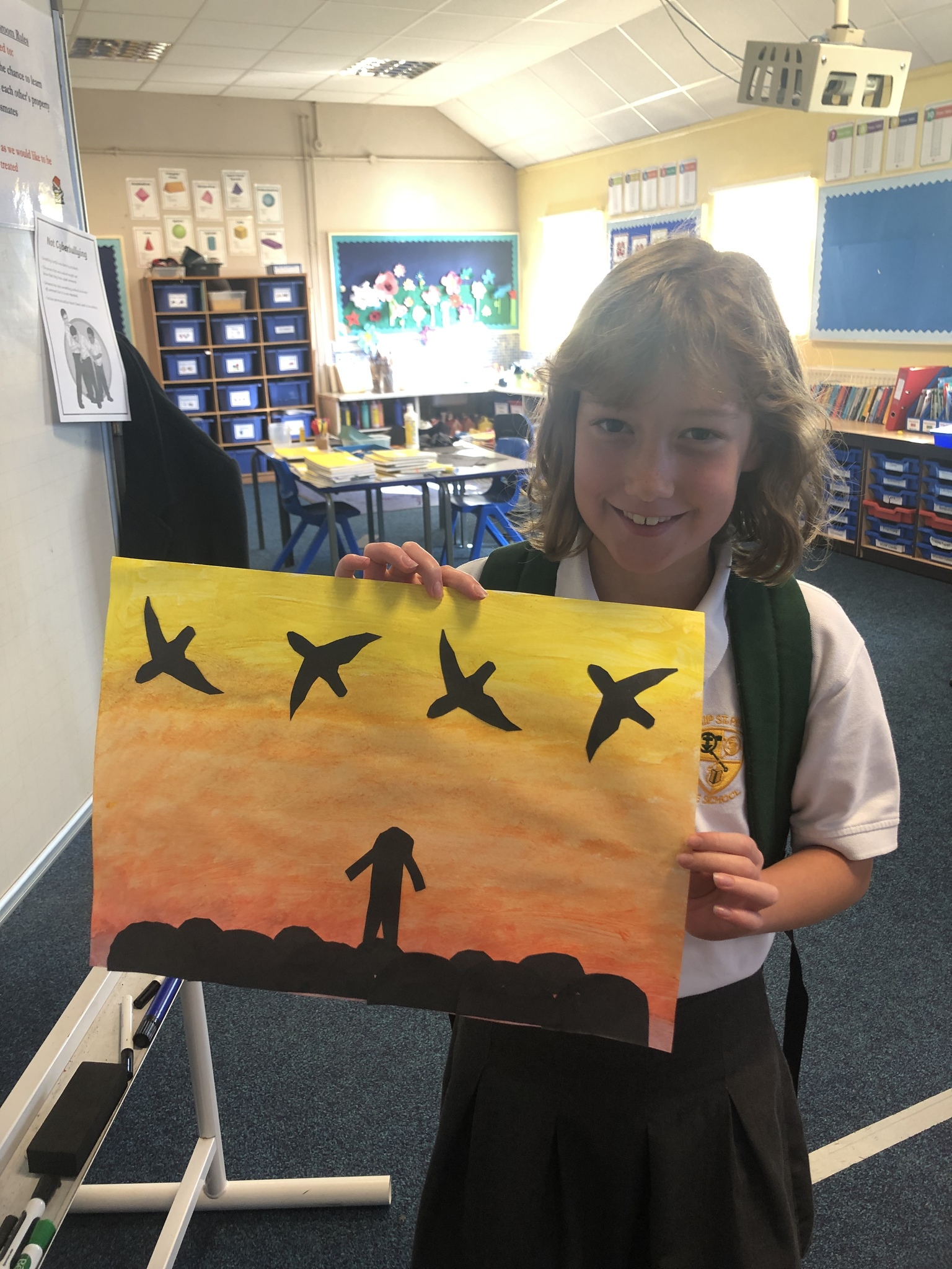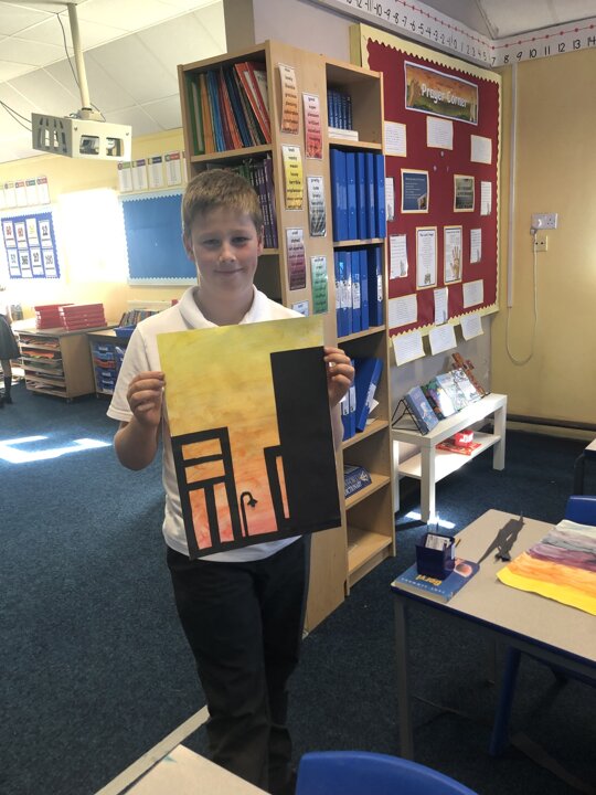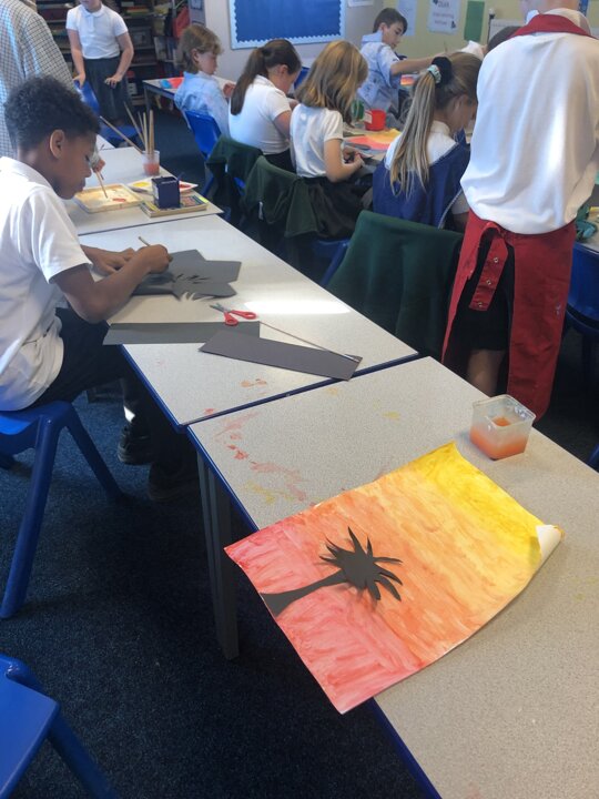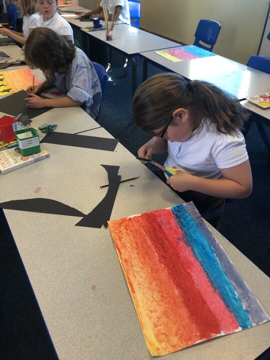 Today we finished our paintings and added some paper cut outs to create a silhouette. The effect is very dramatic as you will see from the photos…
