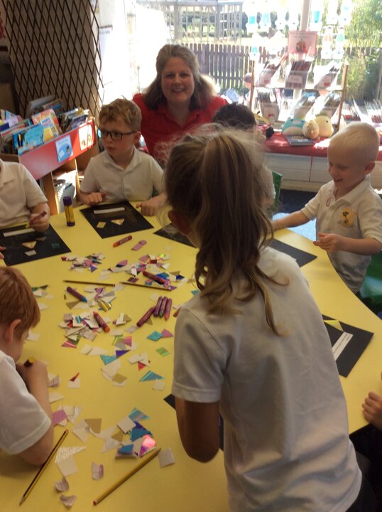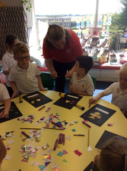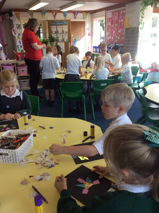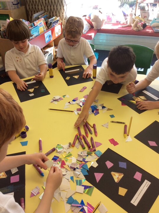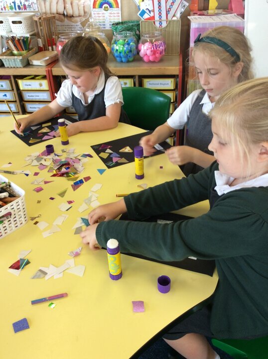 Then the children made some wonderful collages around the triangle symbol of the Trinity representing the three parts of God; Father, Son and Holy Spirit, using glitter glue, sparkly paper and colourful card shapes to represent the light that God had created. We were impressed by the chatter and thinking about the questions we had discussed as a group, that the children had with one another as they made their collages.