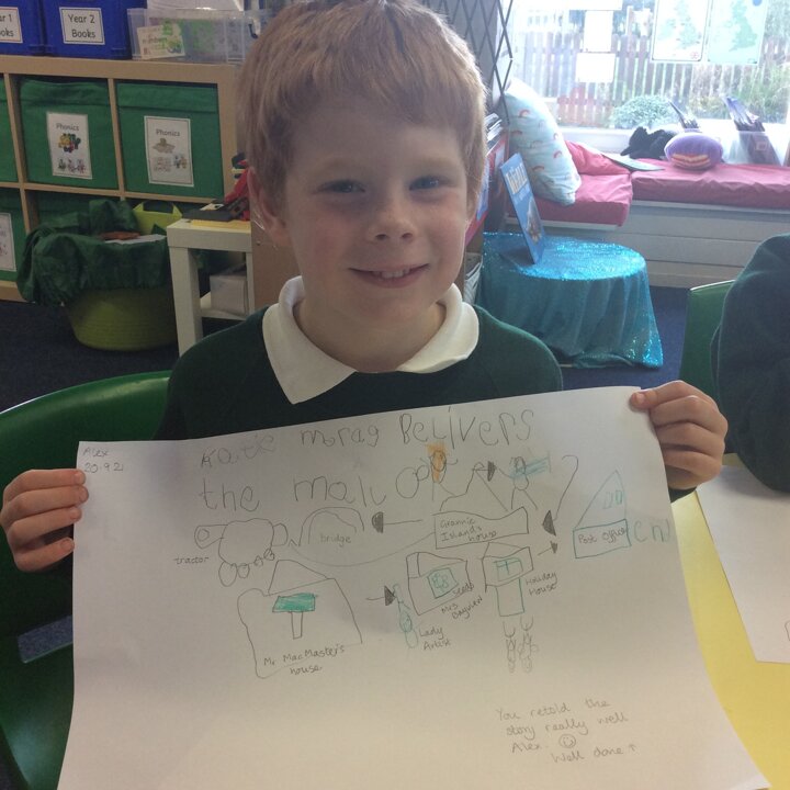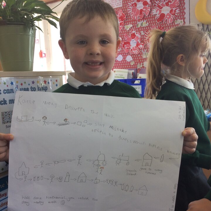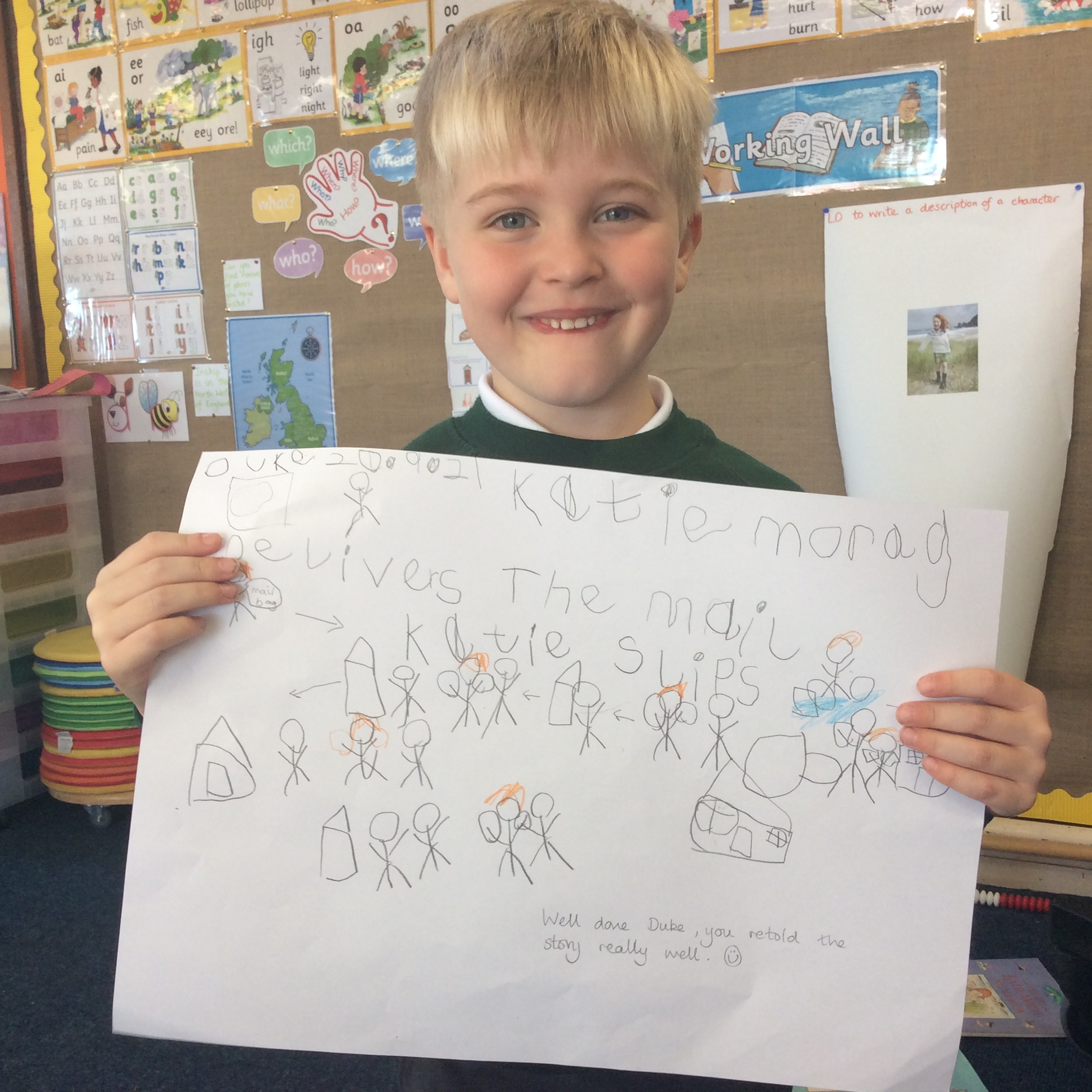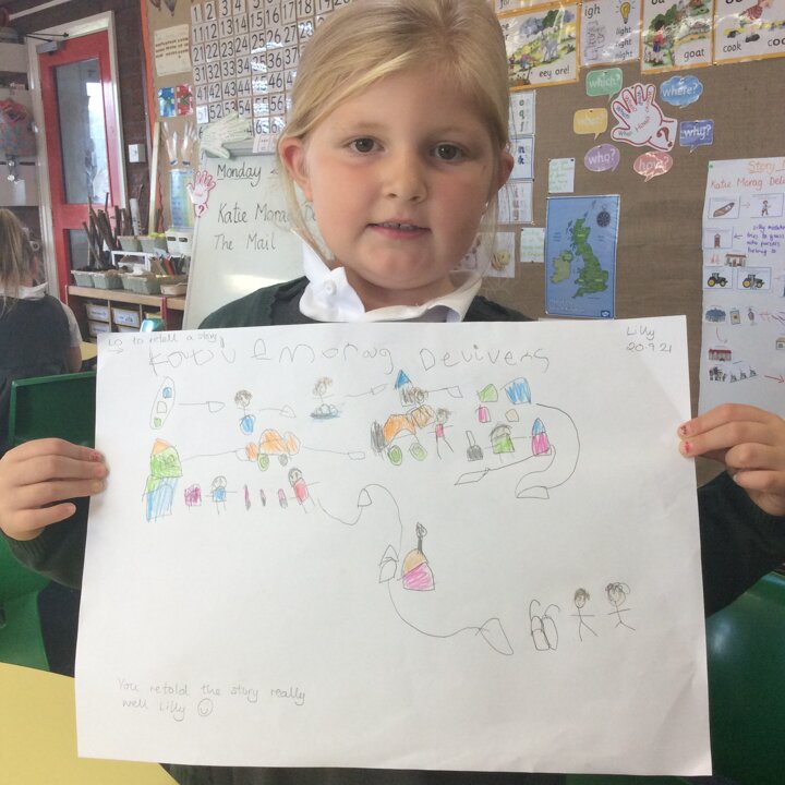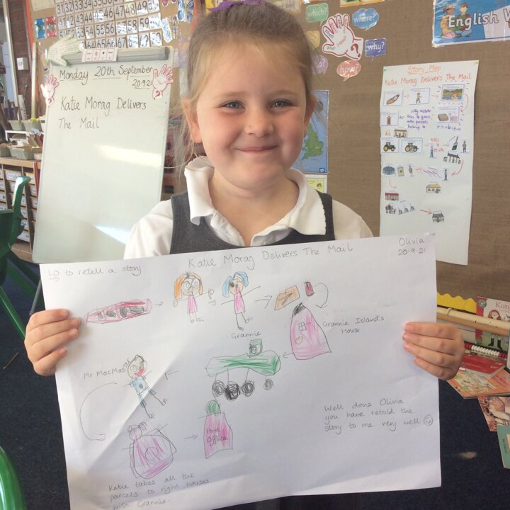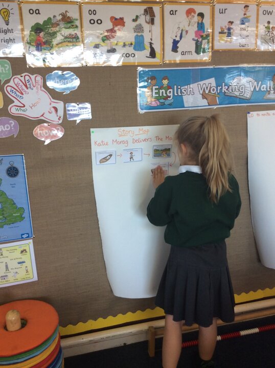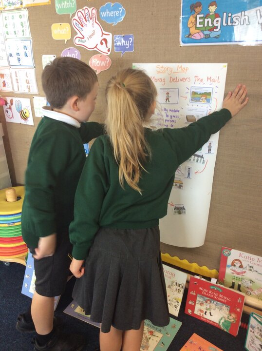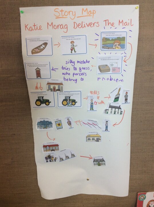 We have thought about the structure of a story and drawn a story map for the story 'Katie Morag Delivers The Mail'. Whilst listening to stories read from the books and watching episodes of the Katie Morag stories made by the BBC on DVD we have been building up a character profile of Katie.