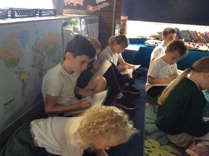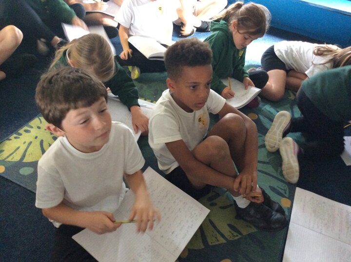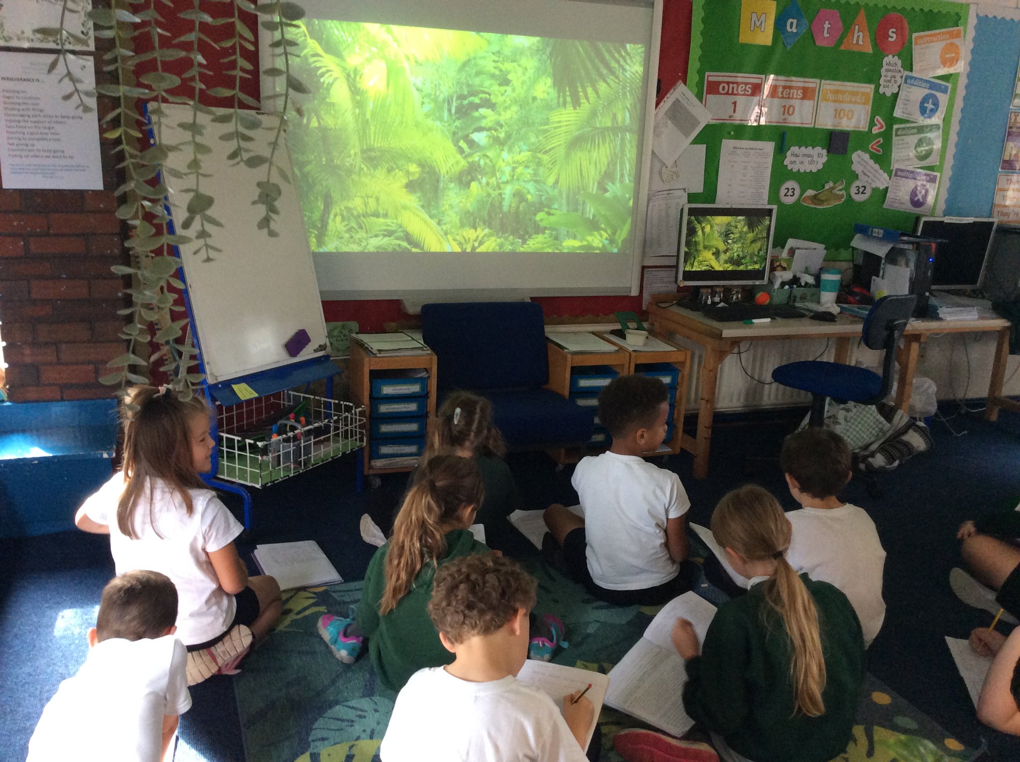 In English lessons this week the children have begun to think about the stories we will be writing. We used images of the rainforest as well as sounds of the rainforest to take ourselves on an immersive and descriptive journey to write about our setting. Children came up with some amazing descriptive sentences - here are some below...