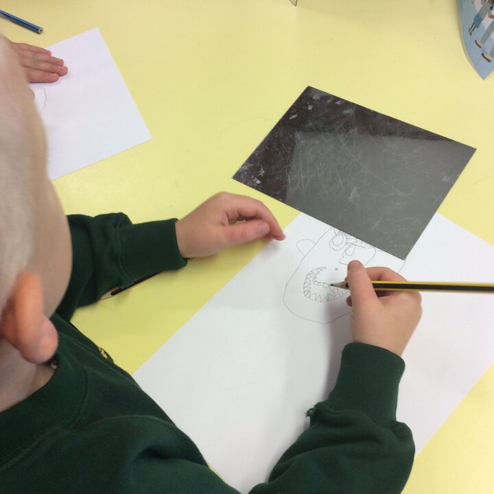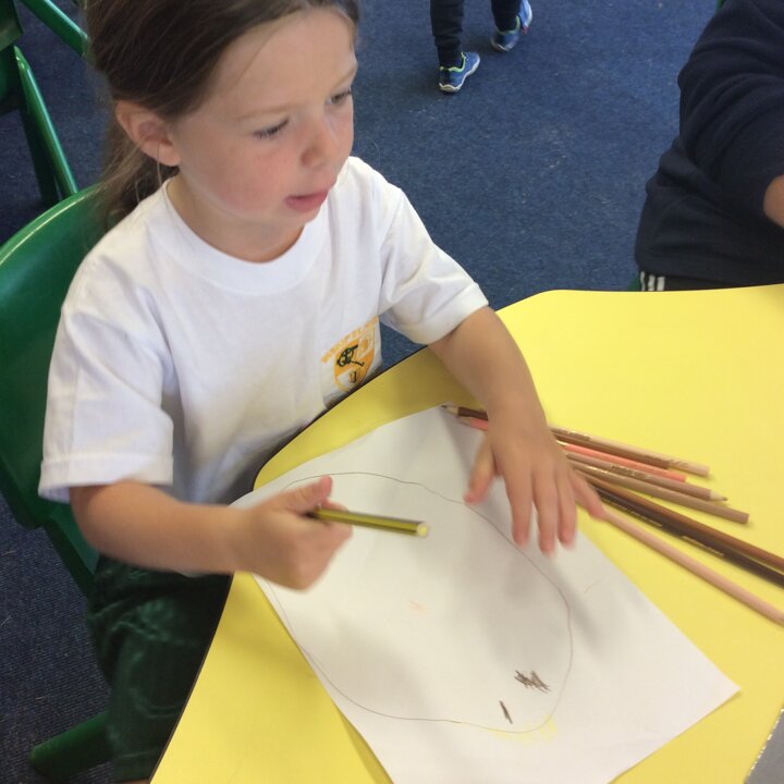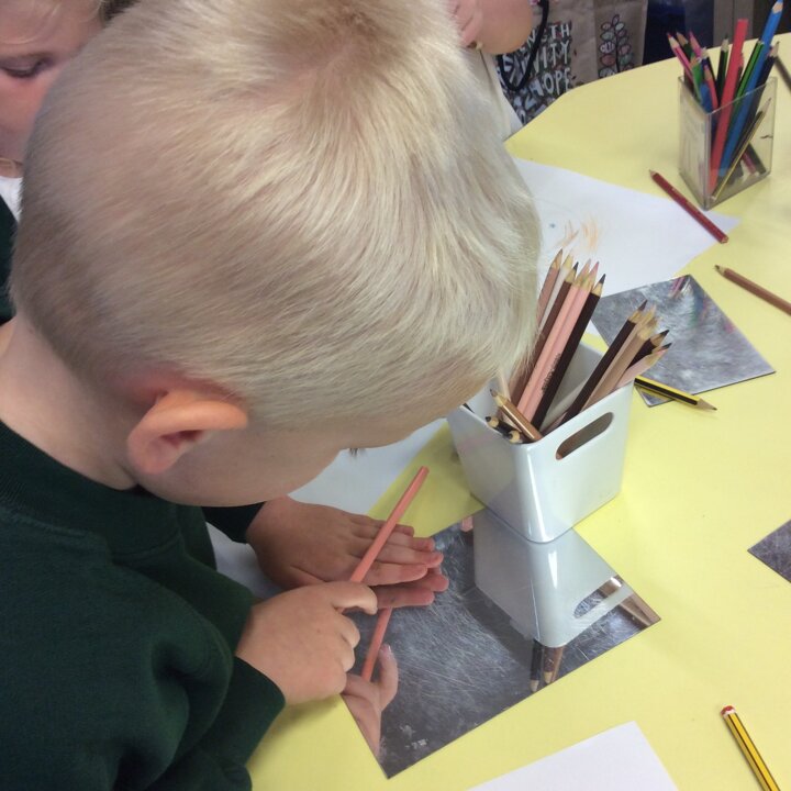 They took their time to try matching different colours of crayons to their own skin tone by placing them on their arms and then shading a small section of their paper to see if they felt it was a close match. Once they had checked again in the mirror they coloured in their skin.