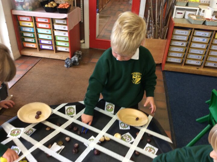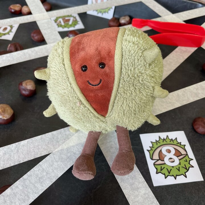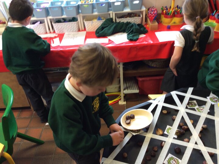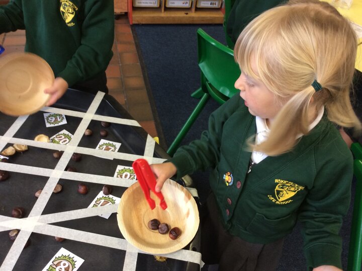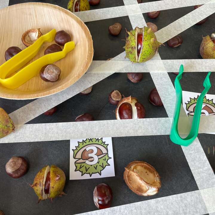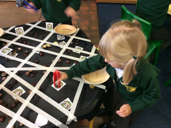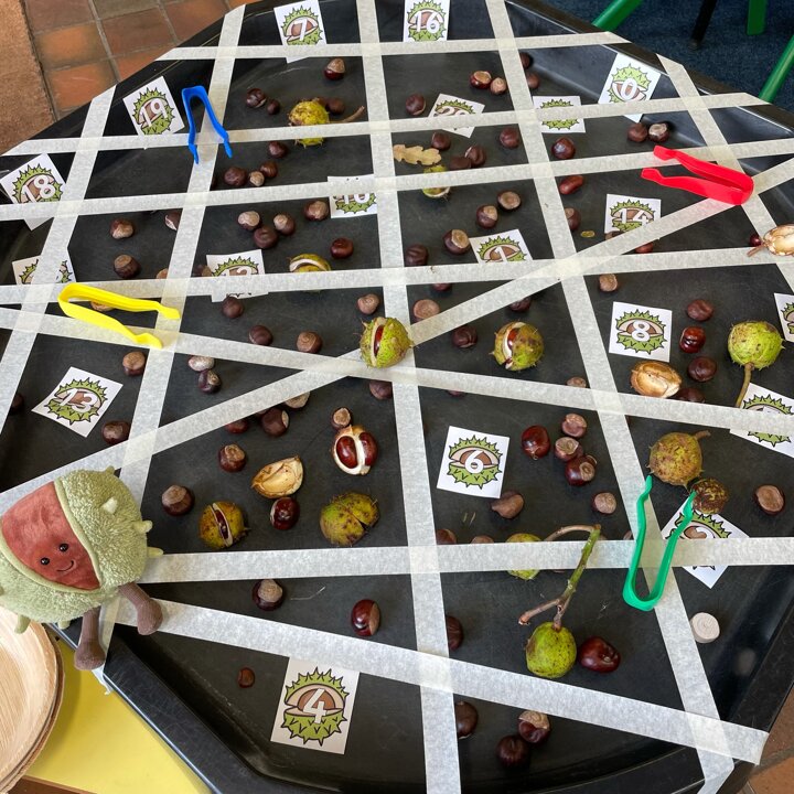 The second tuff tray in the photograph in the gallery below shows another autumn themed activity we have been doing this week for fine motor skills and lots of maths learning. The children have to reach through the taped shapes and grab a conker with the plastic tongs and put it into their bowl (it is quite tricky!). They are meant to tip the conkers in their bowl back in to the tray if they hit the tape but I think everyone forgot to do that!
