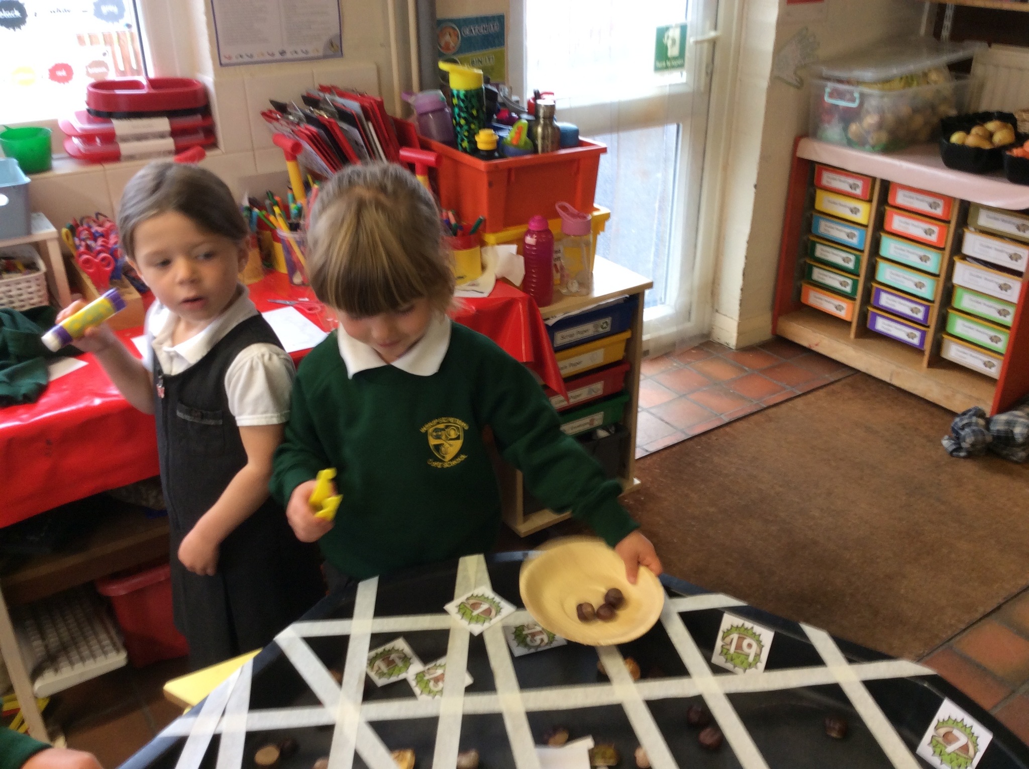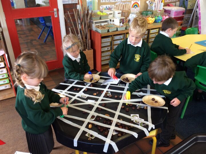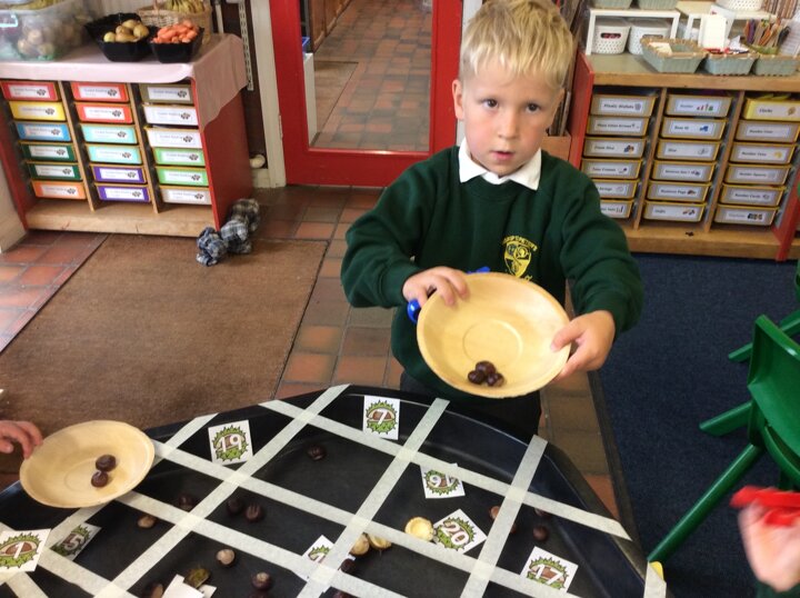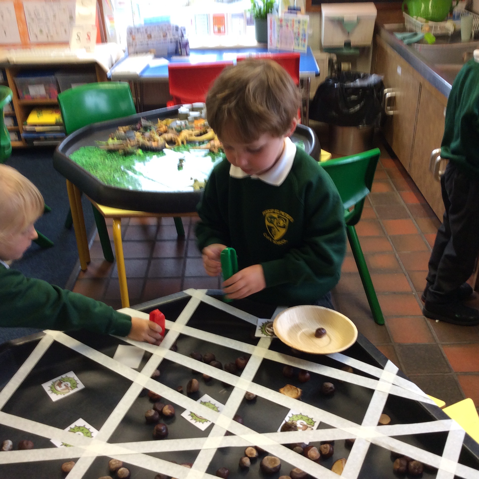 The second tuff tray in the photograph in the gallery below shows another autumn themed activity we have been doing this week for fine motor skills and lots of maths learning. The children have to reach through the taped shapes and grab a conker with the plastic tongs and put it into their bowl (it is quite tricky!). They are meant to tip the conkers in their bowl back in to the tray if they hit the tape but I think everyone forgot to do that!