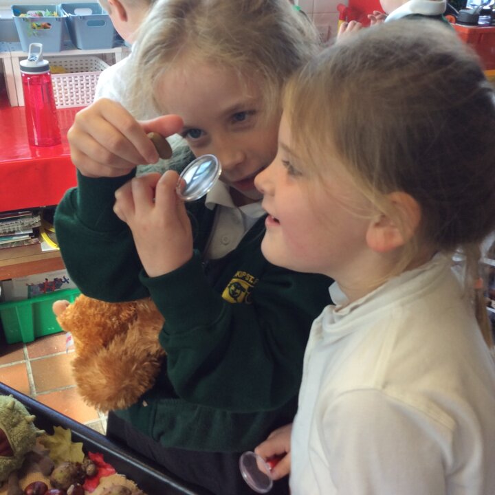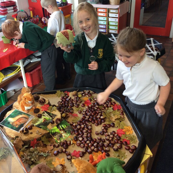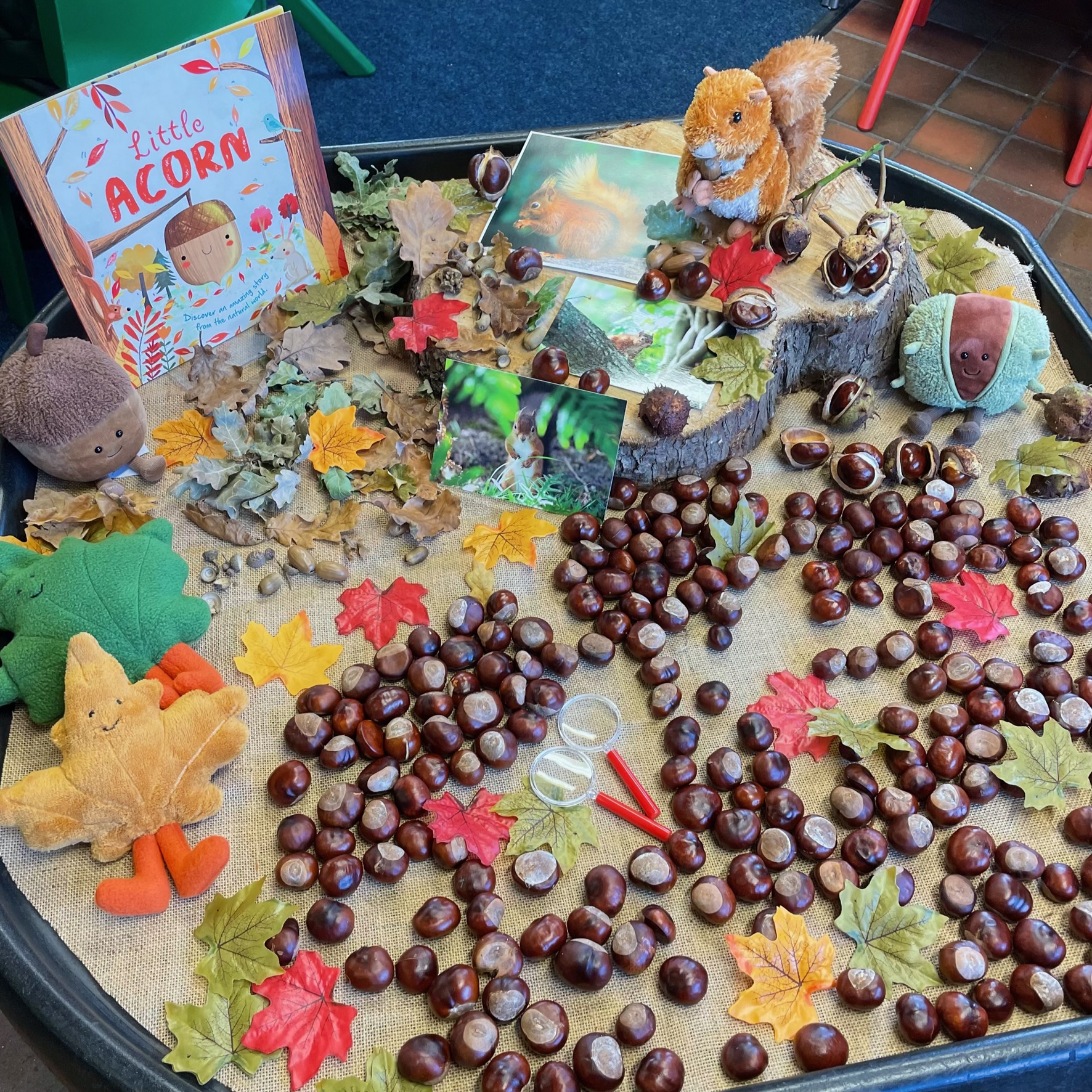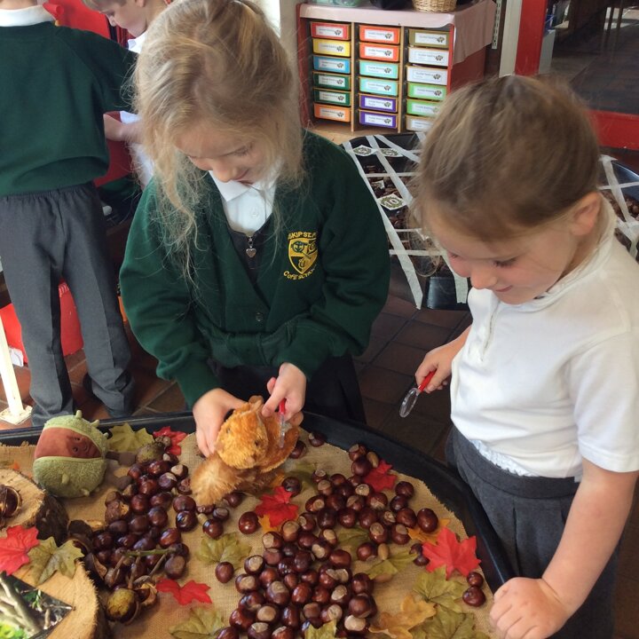This has been the question the children have been asked and asking each other whilst they have investigated all the autumn treasures in this tuff tray in the main photograph above. There has been a lot of learning and interesting discussion that has been great to listen to and share.