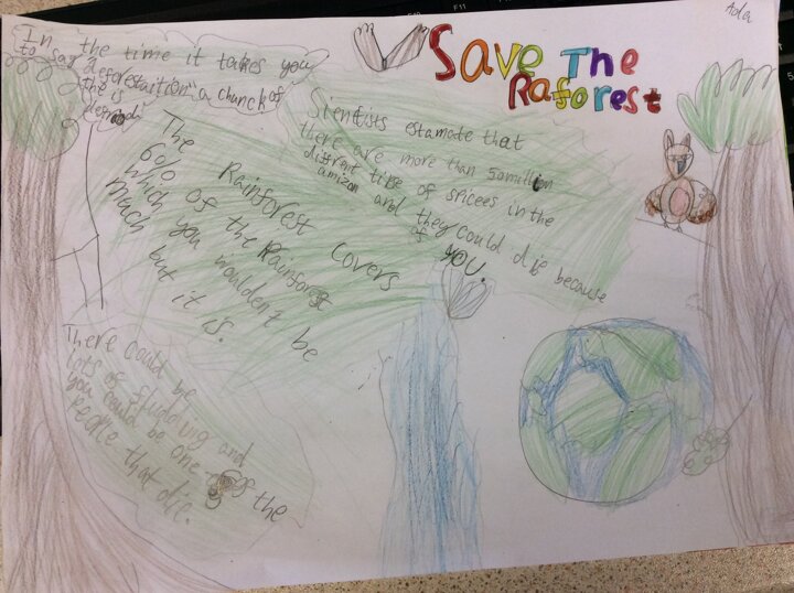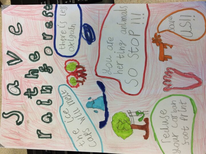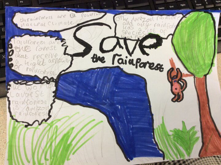To round up our topic on the rainforest, middle school have combined their knowledge of facts about the rainforest with some advice on saving the rainforest from it's current deforestation and habitat loss issues to create a poster.
