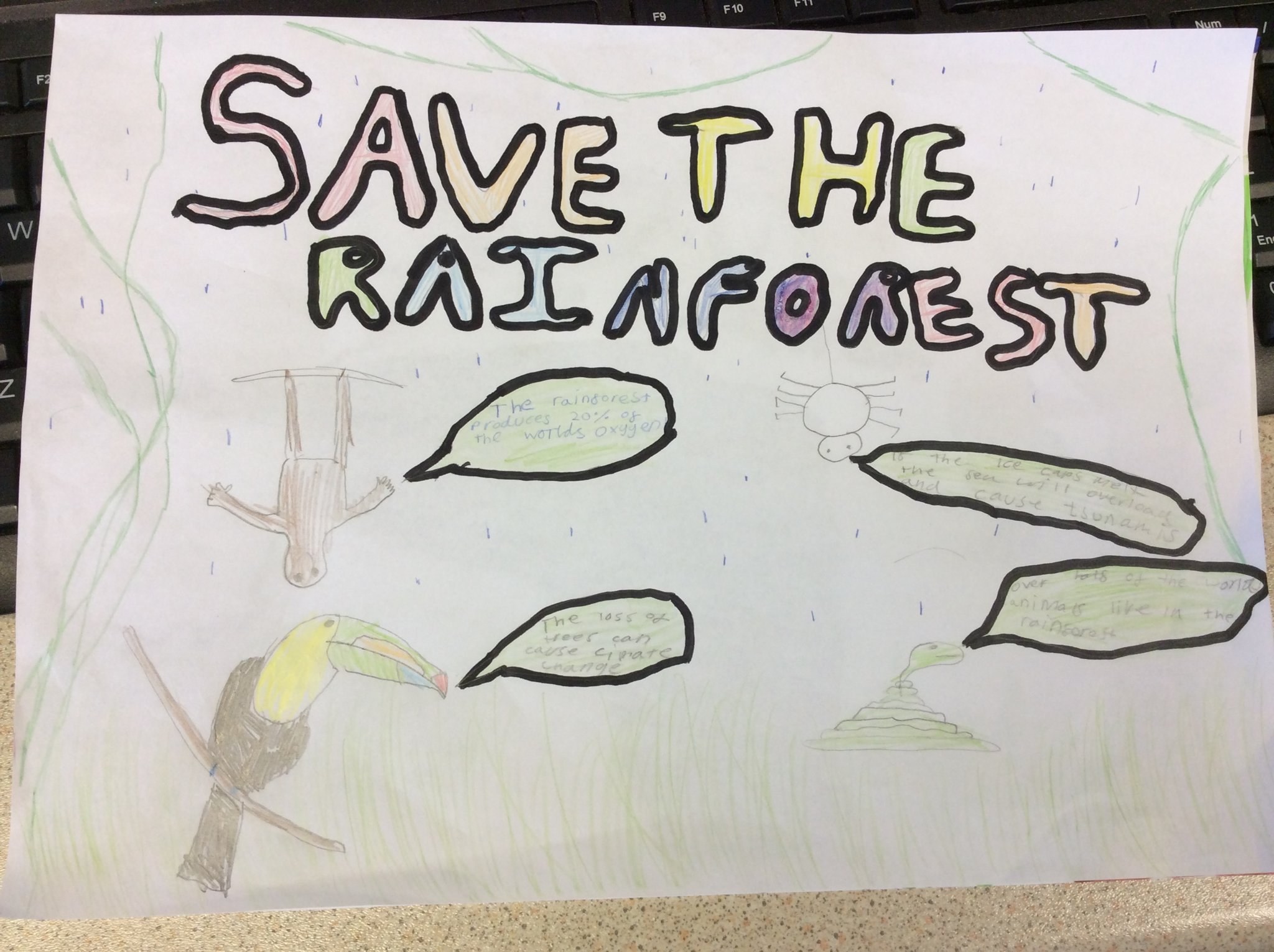 Middle school hope that their posters will reach people and influence them to do their part to help save the rainforest and all of the wonderful plants and animals it contains.