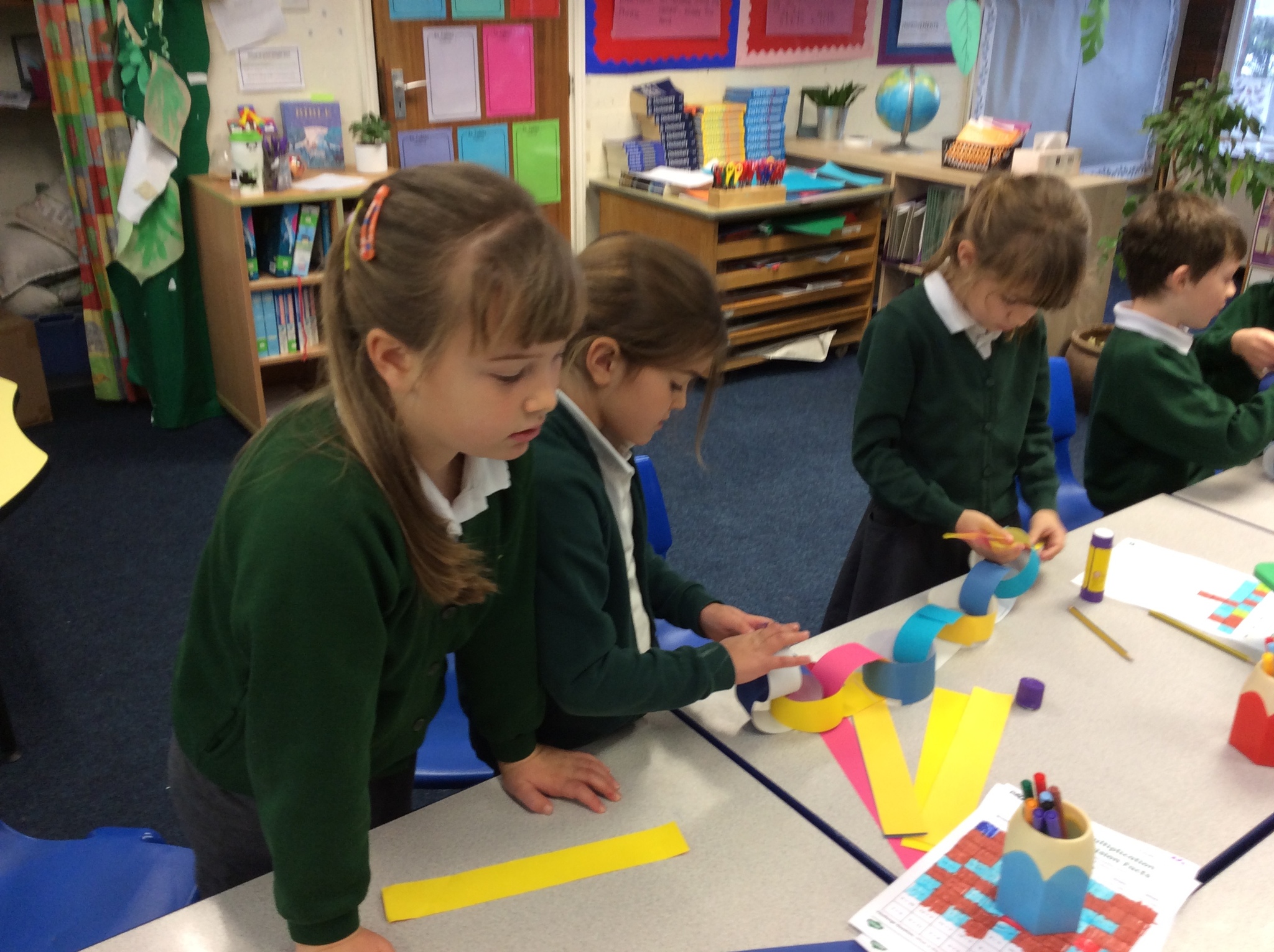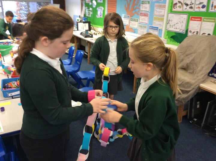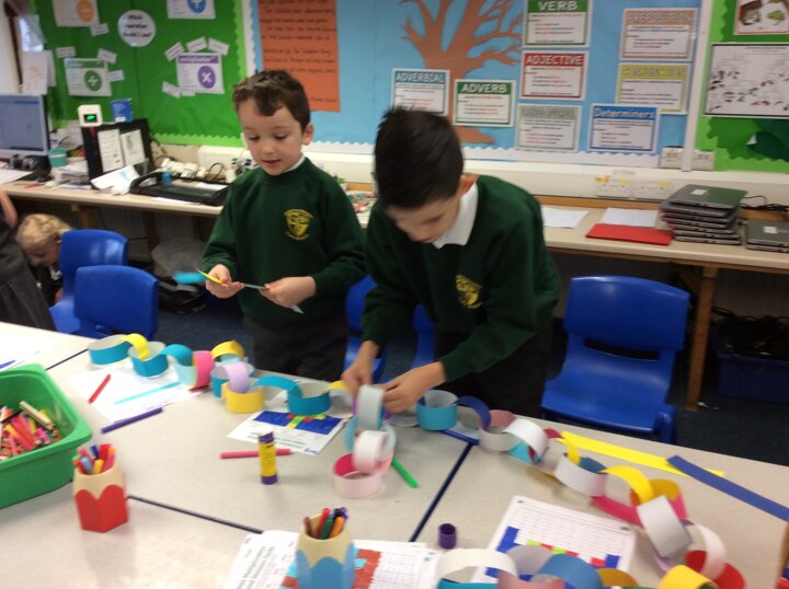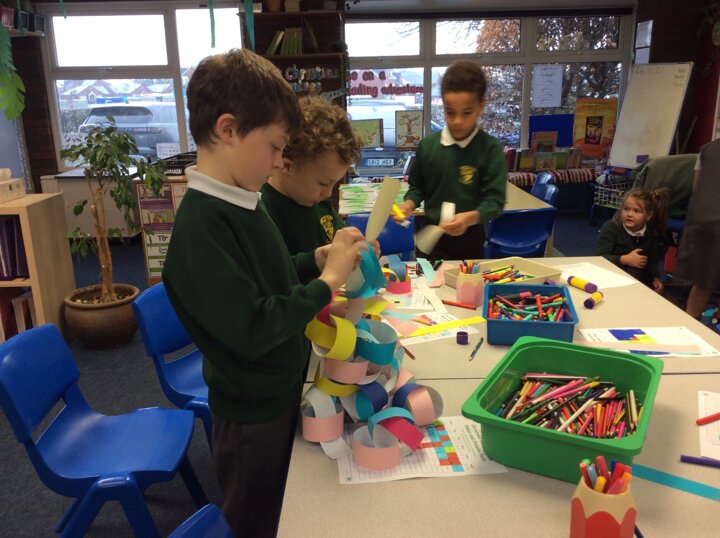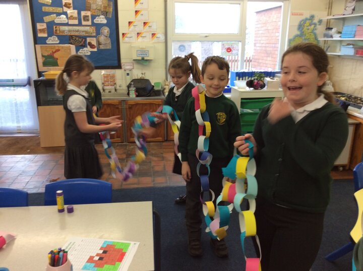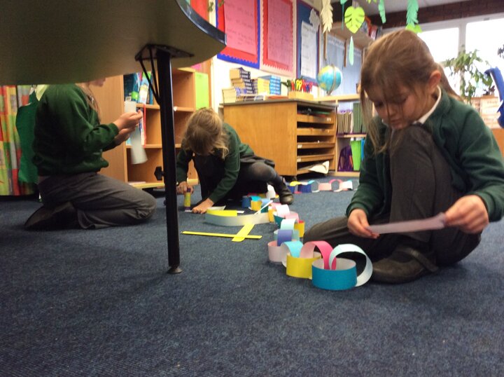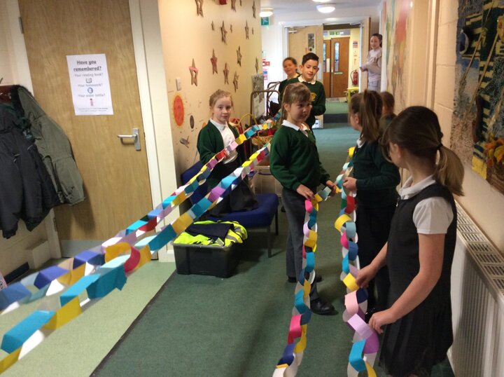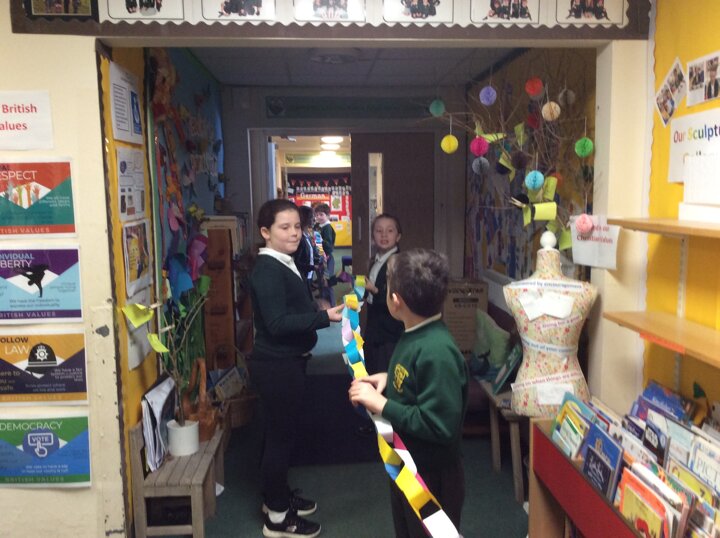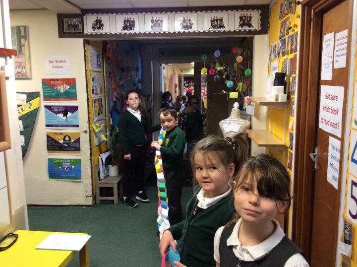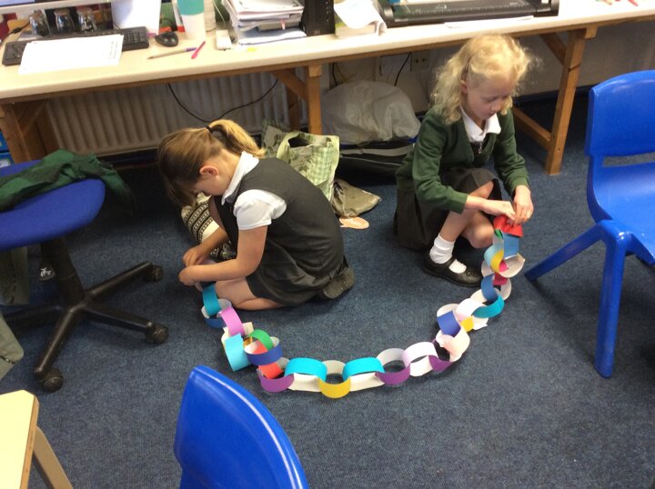 Children all sat on one big table to colour, cut and create. We made a huge paper chain together that was 20 metres long and stretched all of the way down the corridor!