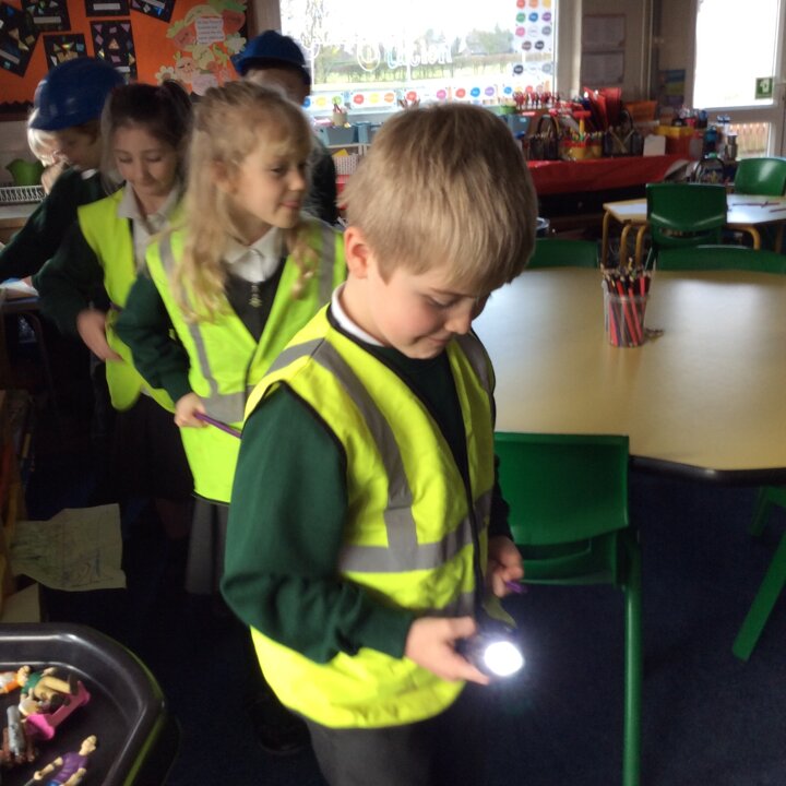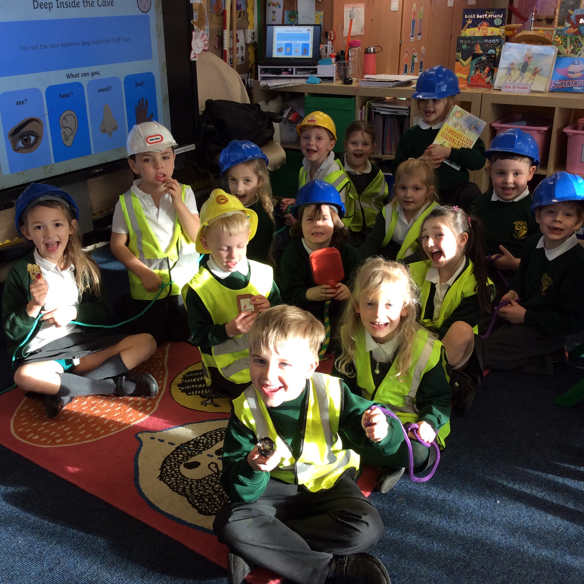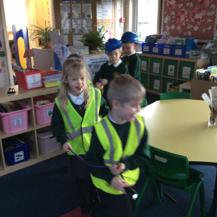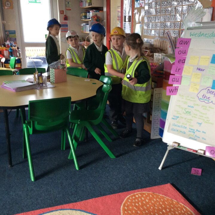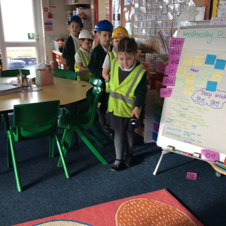 Then I pretended to be Head of The Cave Department for Lancashire and the children were all Cave Detectives who needed to go and explore the local caves as we had a report come in saying that there was some mysterious goings on happening! The fun bit was dressing up as if we were explorers with hard hats, hi vis jackets, torches and a rope to hold onto so that the group didn’t get lost. The children used their imaginations, we turned the lights off in the classroom, played the sounds of inside a cave and they went exploring! See the photos below.
