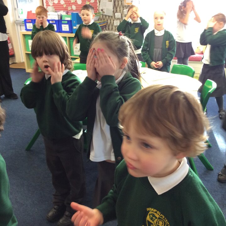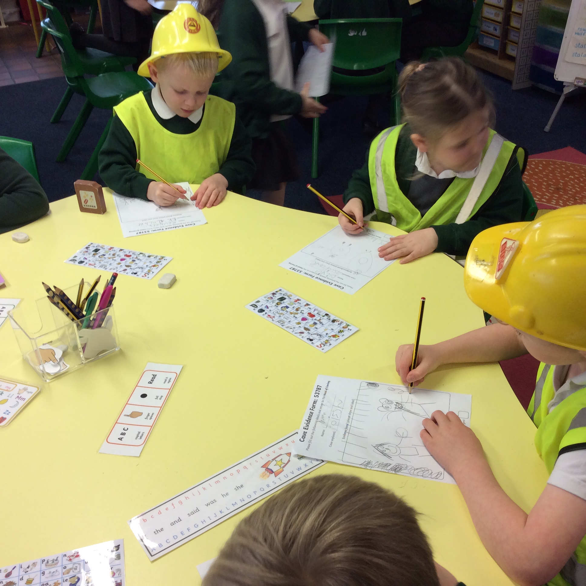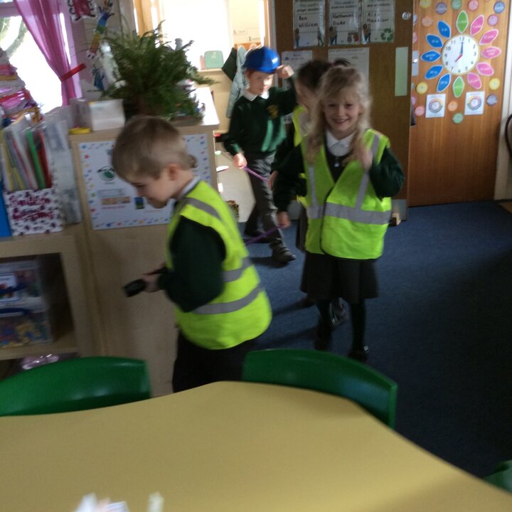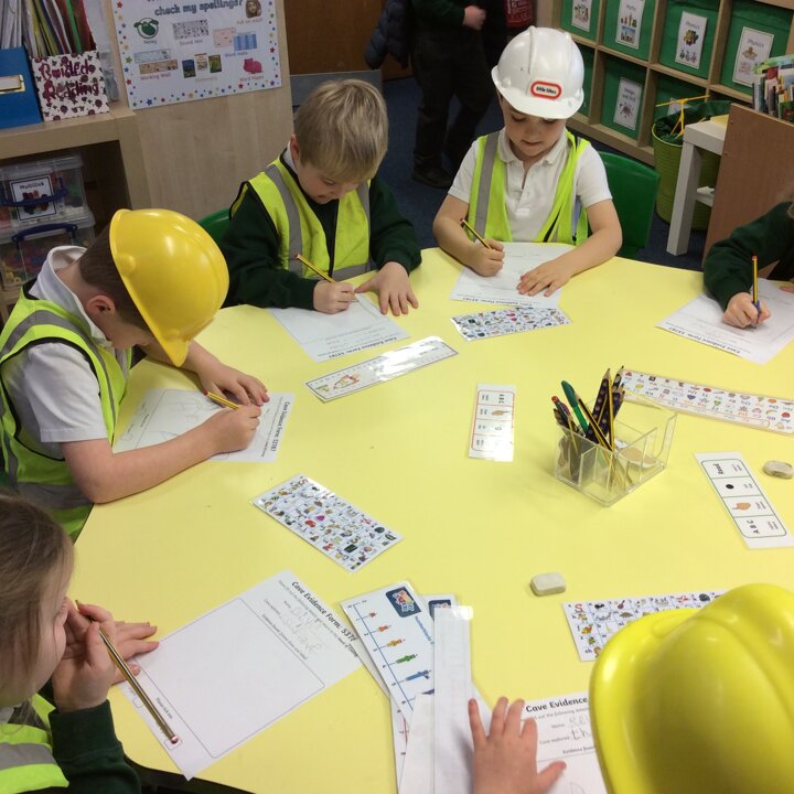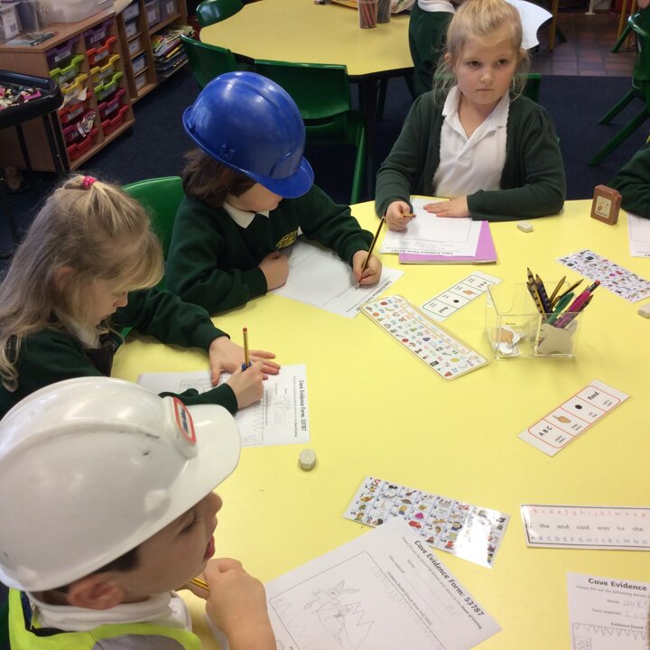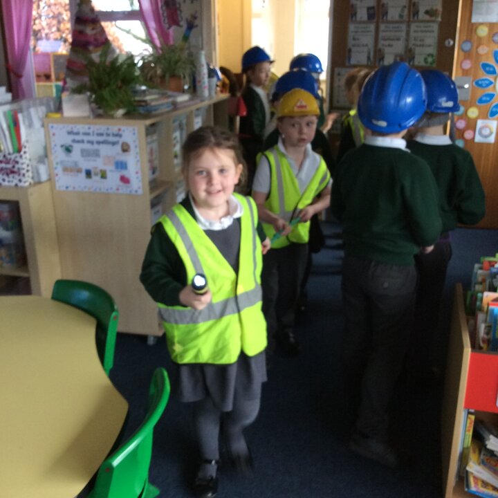 Then I pretended to be Head of The Cave Department for Lancashire and the children were all Cave Detectives who needed to go and explore the local caves as we had a report come in saying that there was some mysterious goings on happening! The fun bit was dressing up as if we were explorers with hard hats, hi vis jackets, torches and a rope to hold onto so that the group didn’t get lost. The children used their imaginations, we turned the lights off in the classroom, played the sounds of inside a cave and they went exploring! See the photos below.