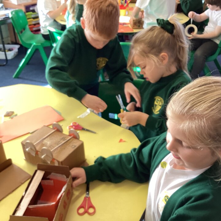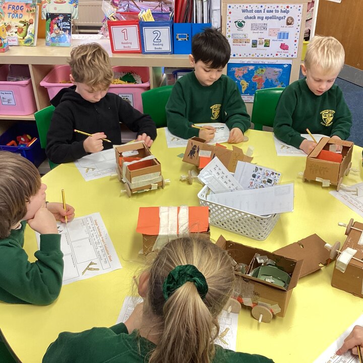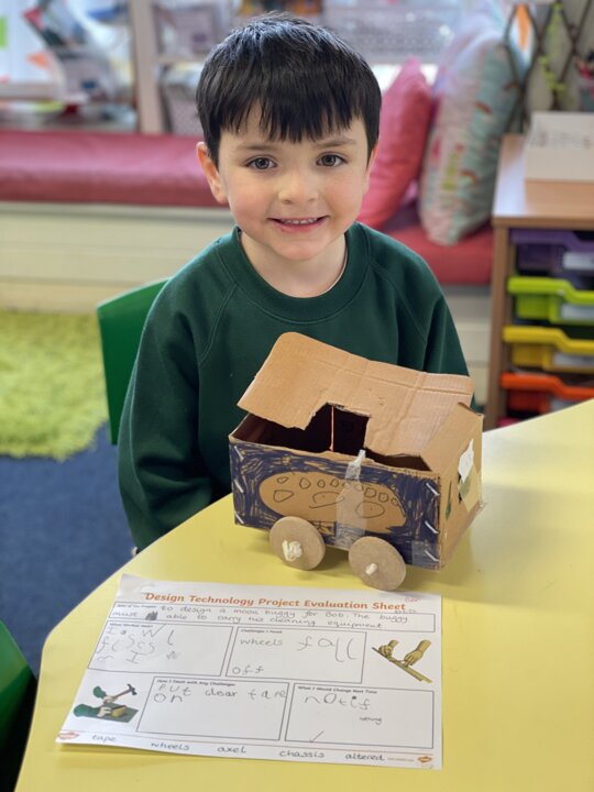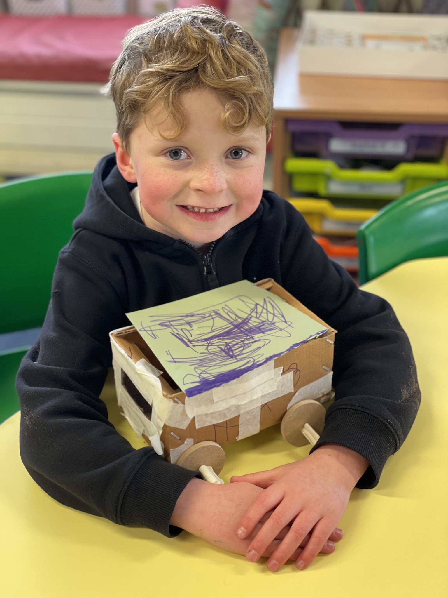 To begin with they put their initial thoughts on paper and drew a design developing their ideas as they went along. Then the children had to think about the materials and equipment they would need. We learnt about wheels and axels, looked closely at toy cars and how their wheels and axels worked and were positioned.