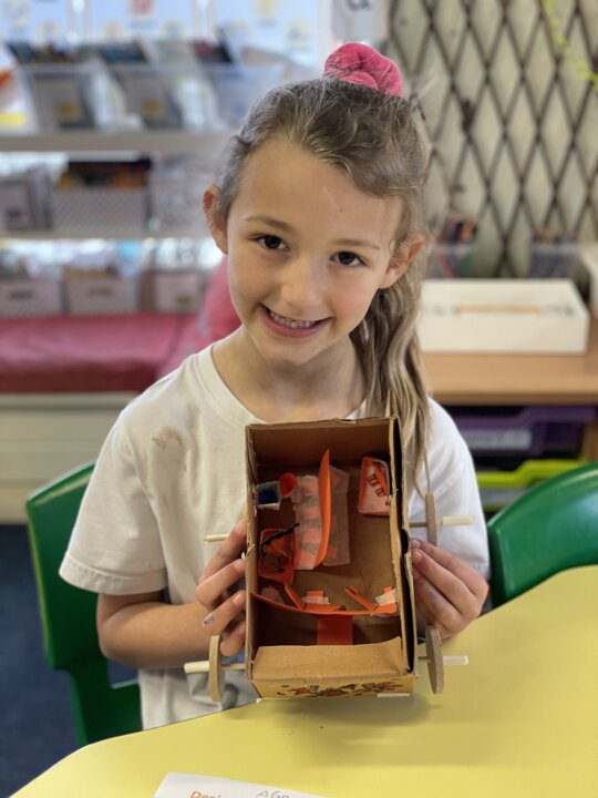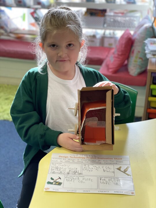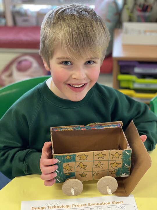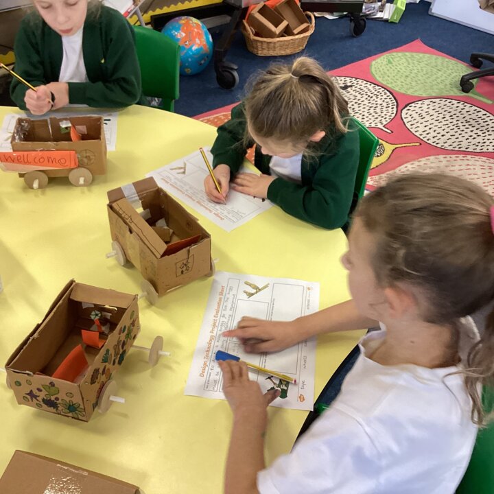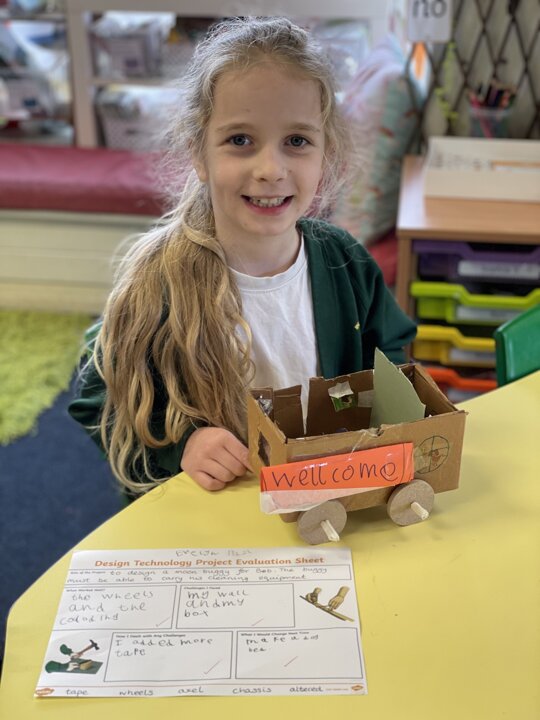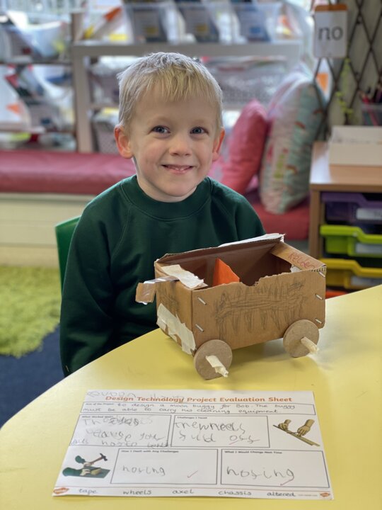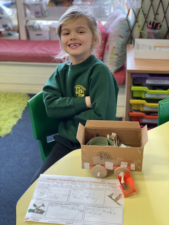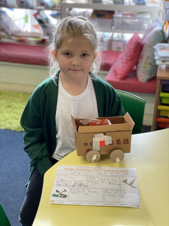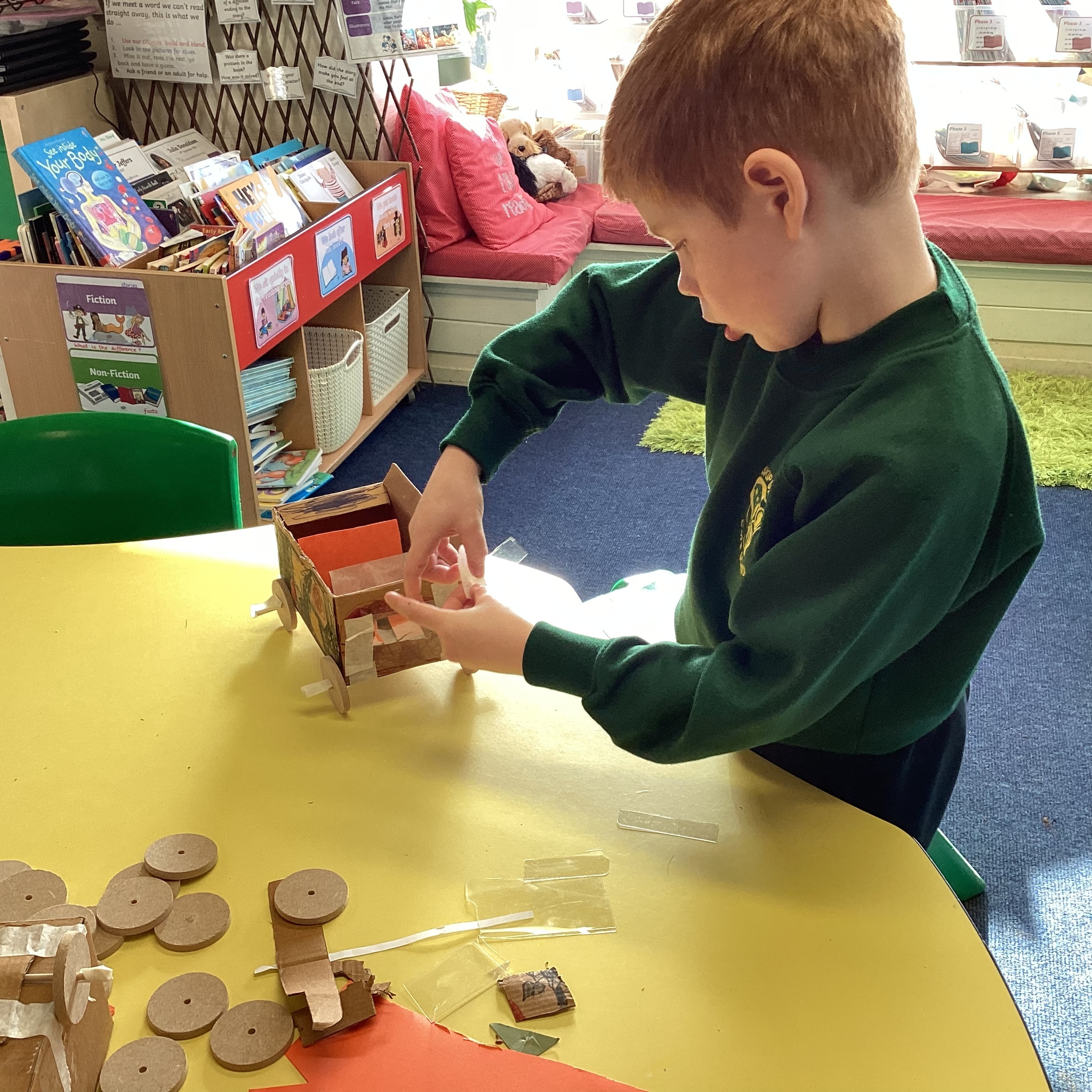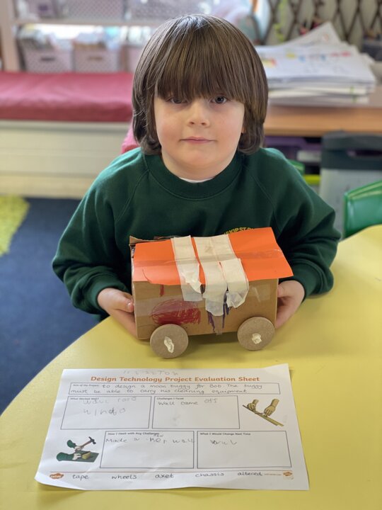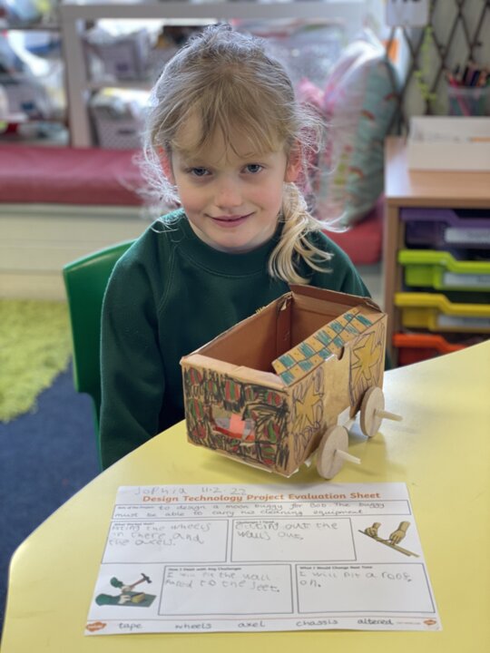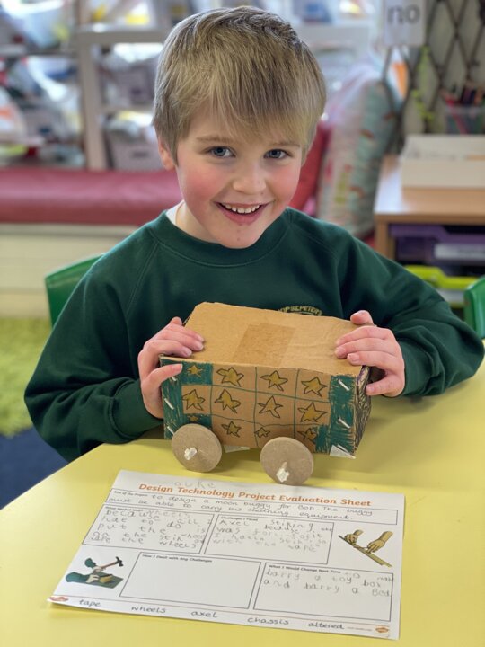 We looked at different attachment techniques (flange, L brace, tabs, fold, tie, slot) to create standing walls (to separate Bob’s cleaning supplies from the driving seat), gathered all our materials and then began making. The children adapted and altered ideas and dealt with challenges well (axels falling off, re measuring card to make things fit) and evaluated their final designs at the end.