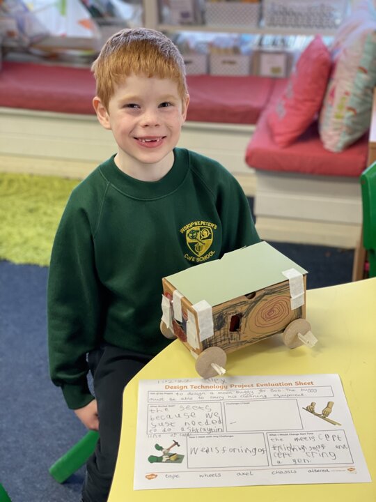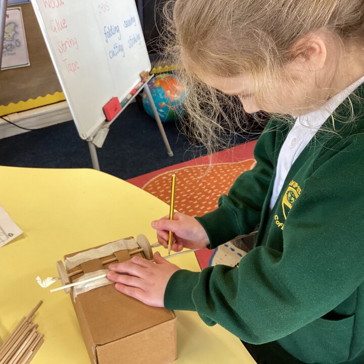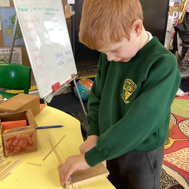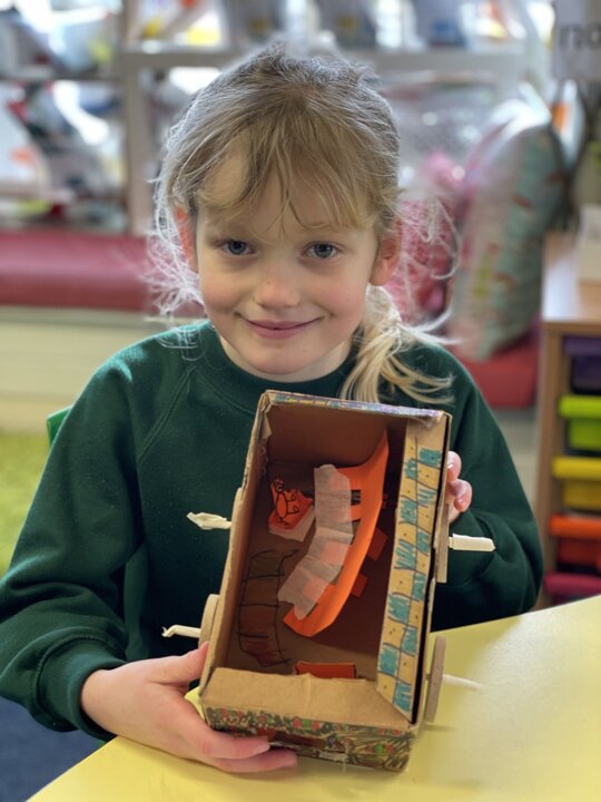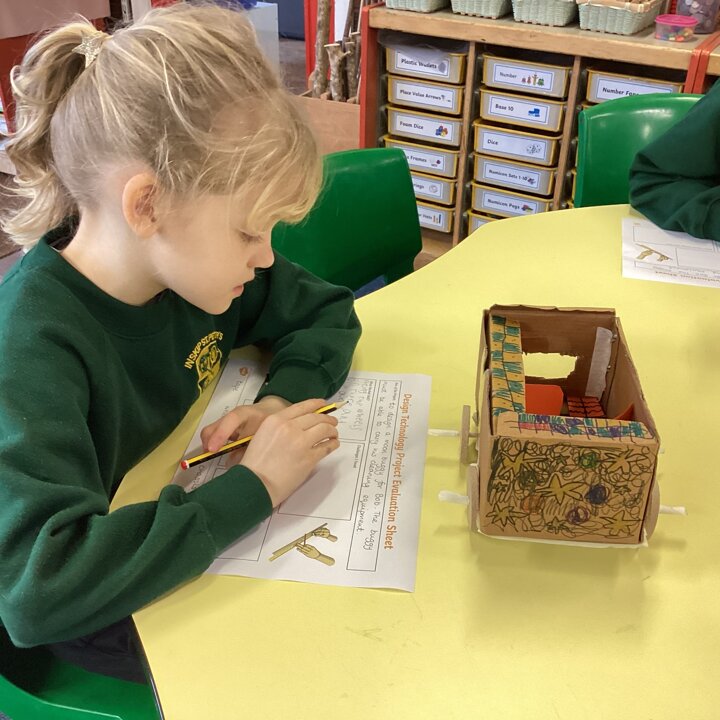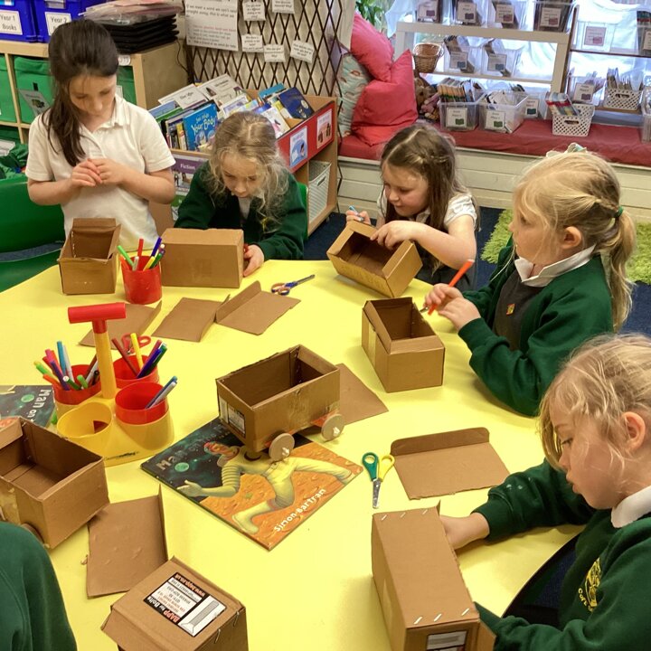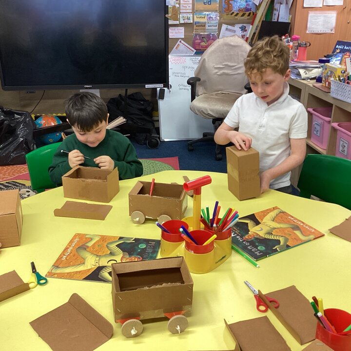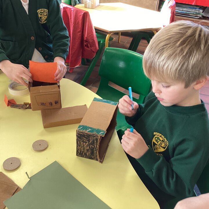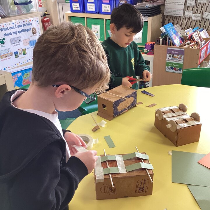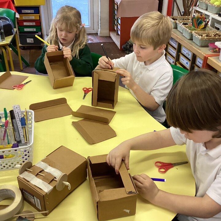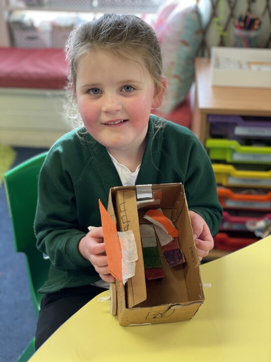 We looked at different attachment techniques (flange, L brace, tabs, fold, tie, slot) to create standing walls (to separate Bob’s cleaning supplies from the driving seat), gathered all our materials and then began making. The children adapted and altered ideas and dealt with challenges well (axels falling off, re measuring card to make things fit) and evaluated their final designs at the end.