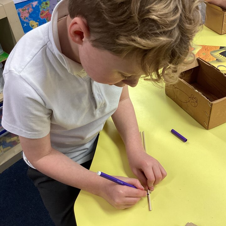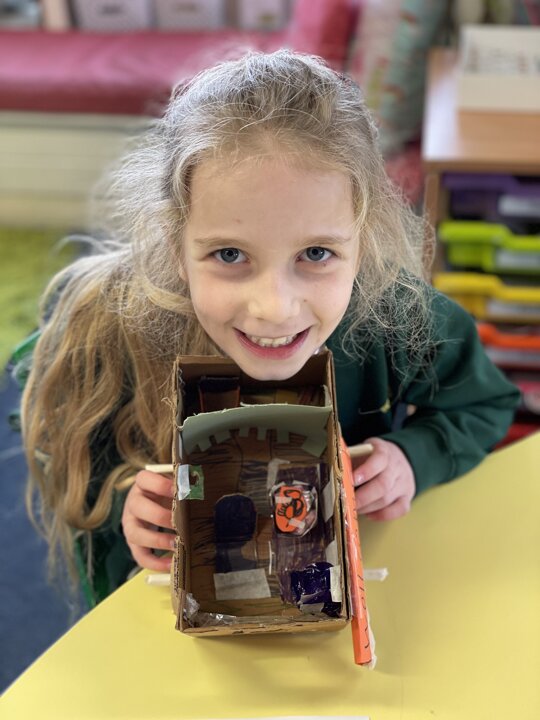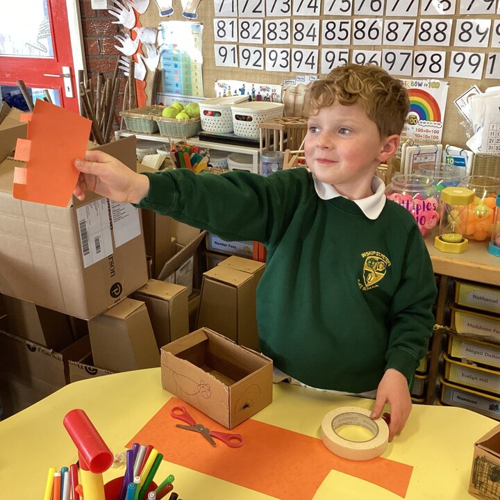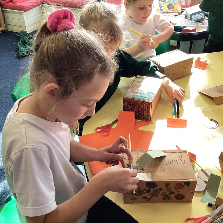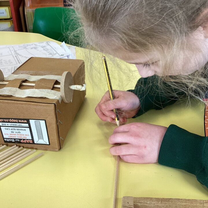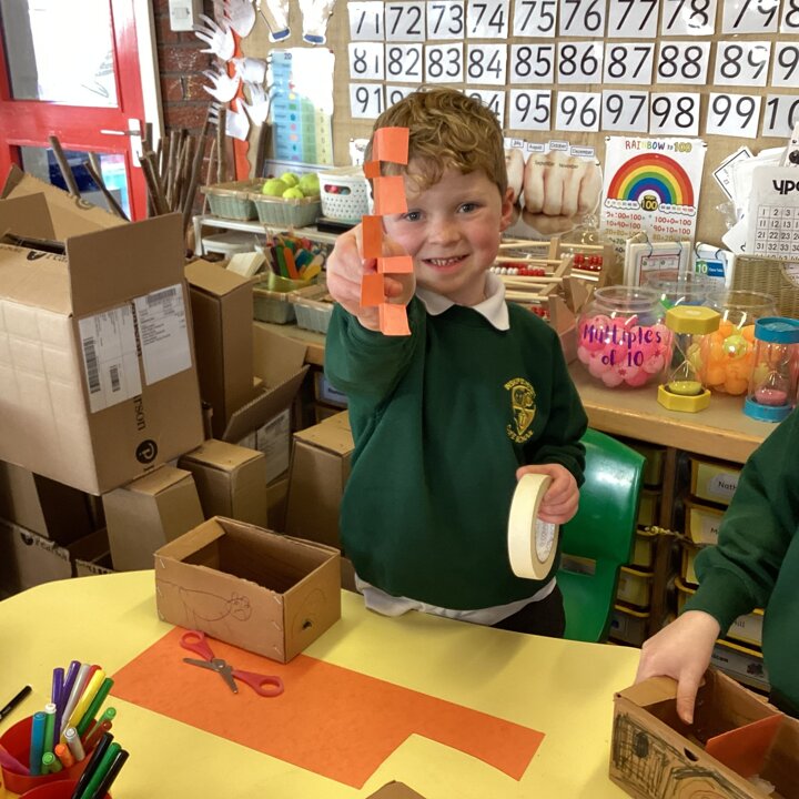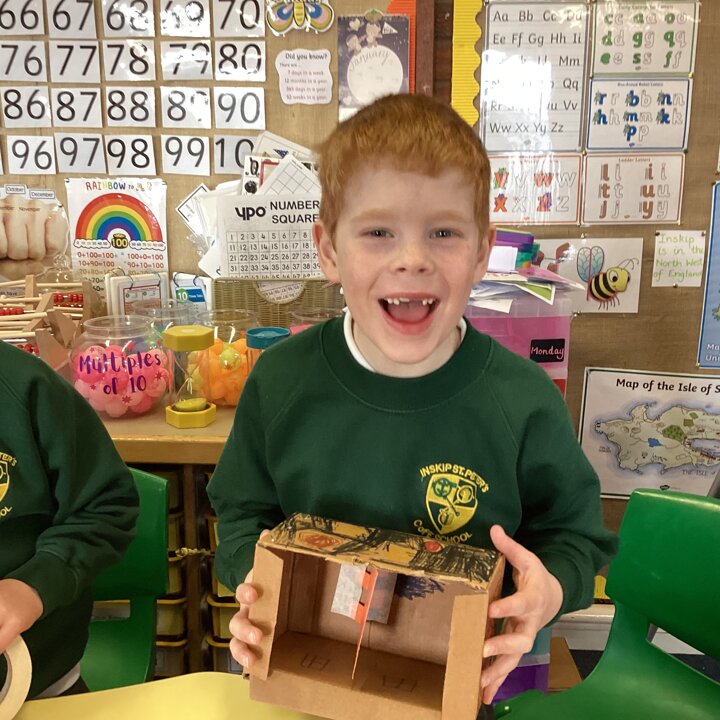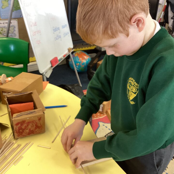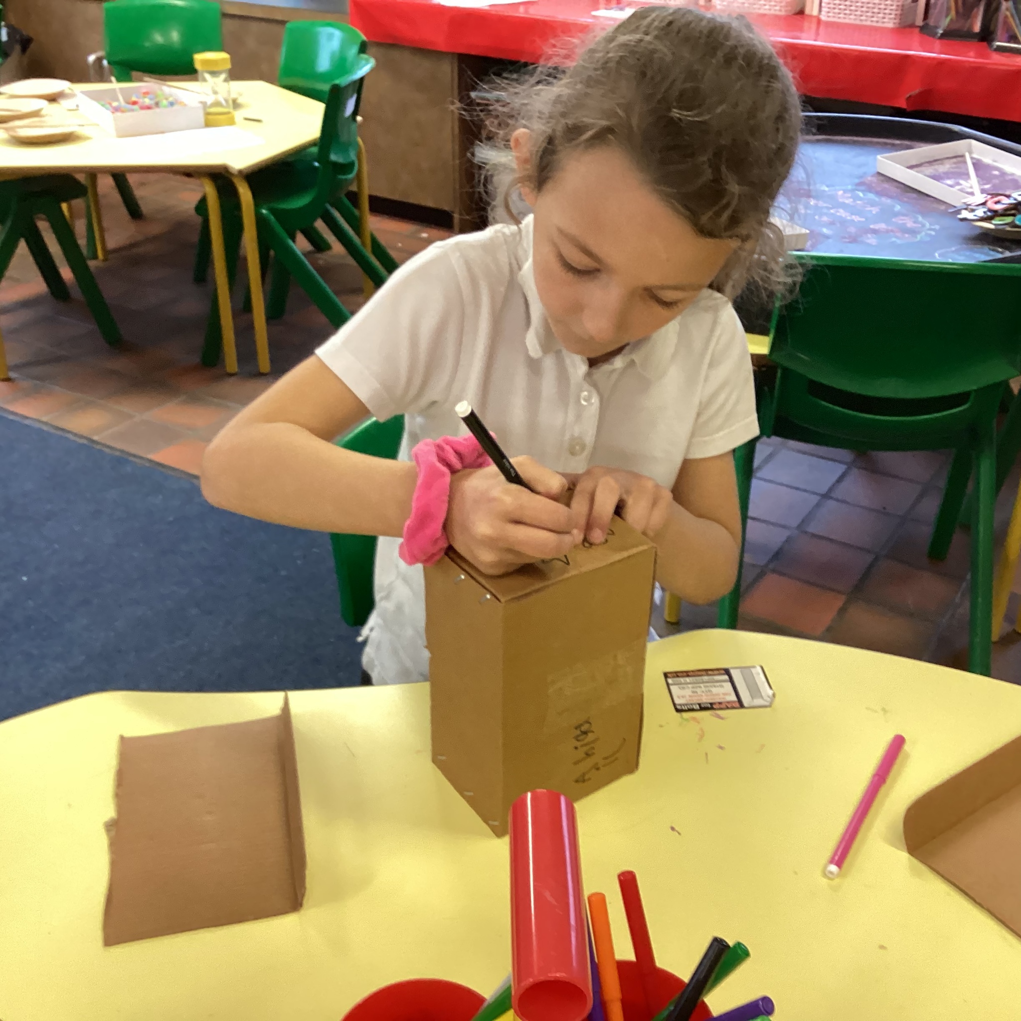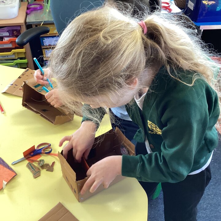 We looked at different attachment techniques (flange, L brace, tabs, fold, tie, slot) to create standing walls (to separate Bob’s cleaning supplies from the driving seat), gathered all our materials and then began making. The children adapted and altered ideas and dealt with challenges well (axels falling off, re measuring card to make things fit) and evaluated their final designs at the end.