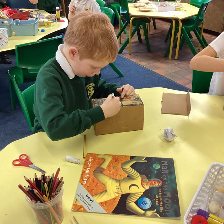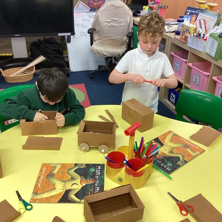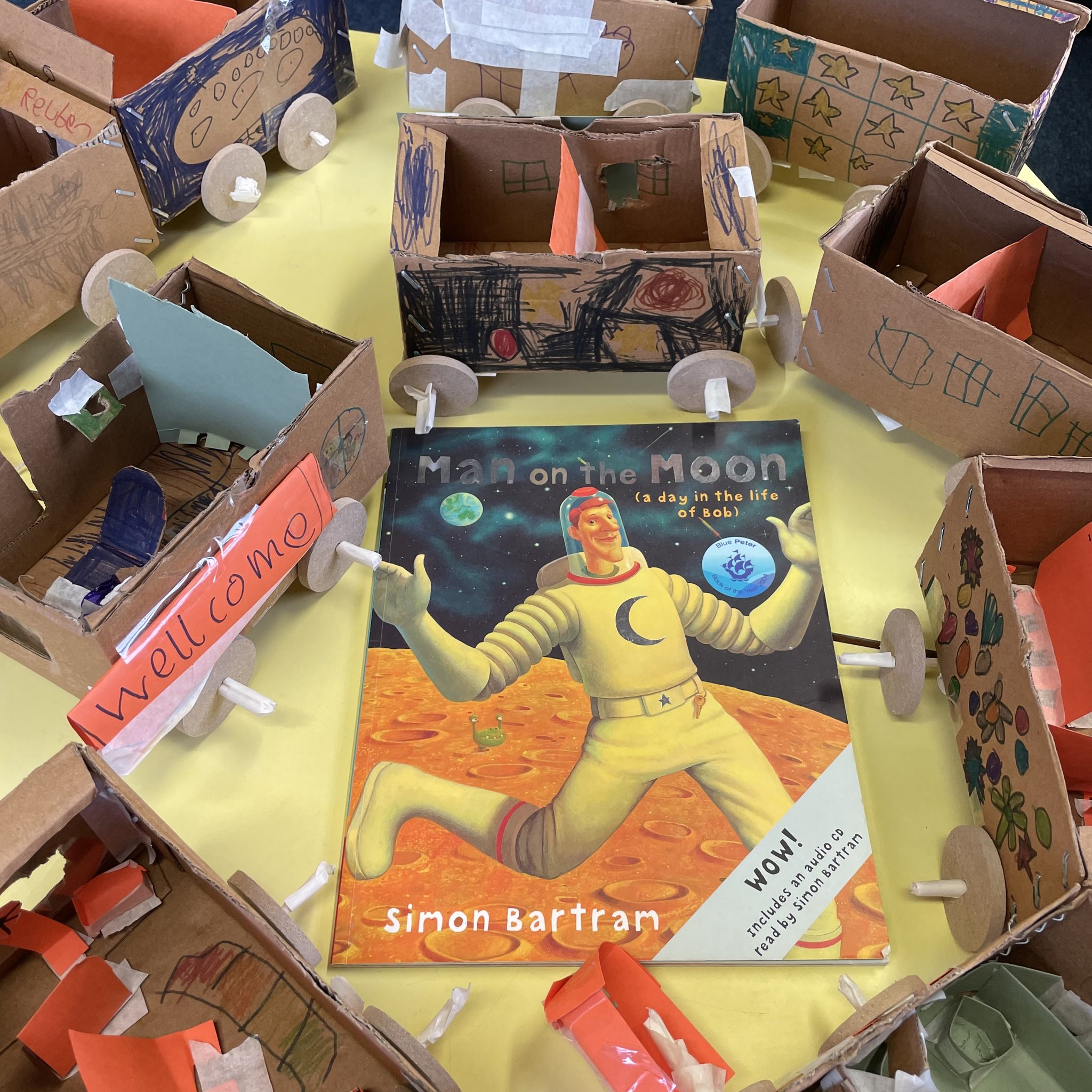 As part of our topic ‘Explorers’ and as part of our English learning reading stories by the same author we have been reading the marvellous books by the artist and author Simon Bartram. We have been enjoying Dougal’s Deep-Sea Diary, Bob The Man on The Moon, Bob and his Best Ever Friend Ever and Bob’s lunar adventures in chapter books. We love the stories and stunning illustrations in all of his books, but we focused our DT learning on a challenge around Bob who’s job it is to work on the moon cleaning it and giving guided tours to tourists.