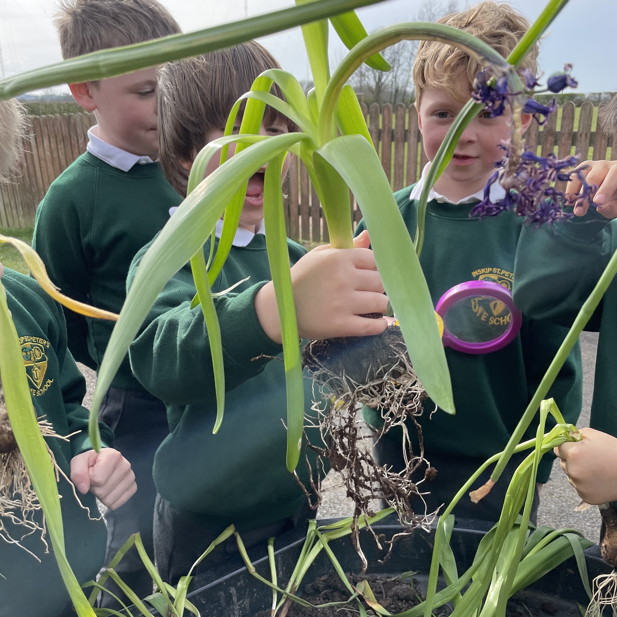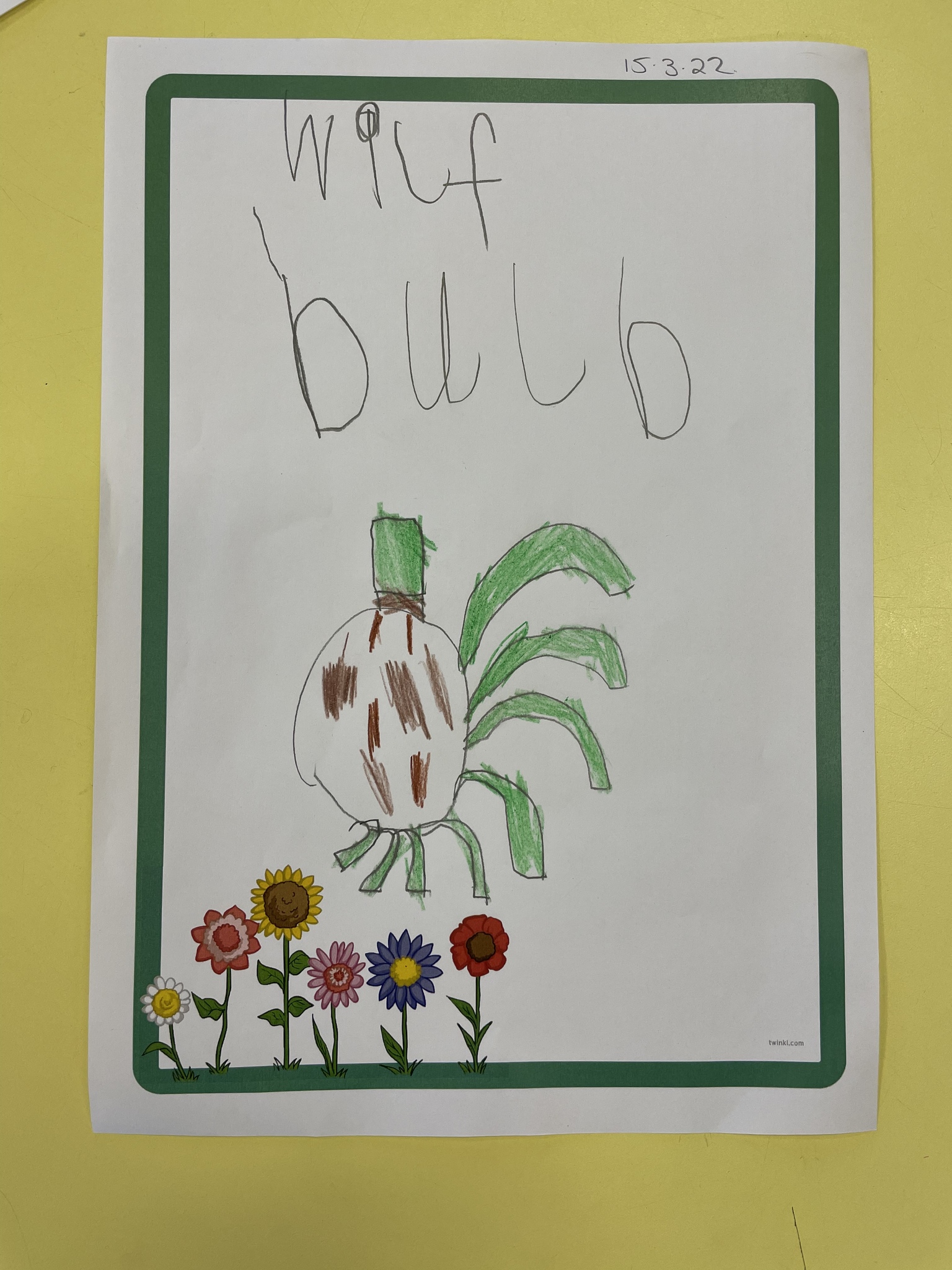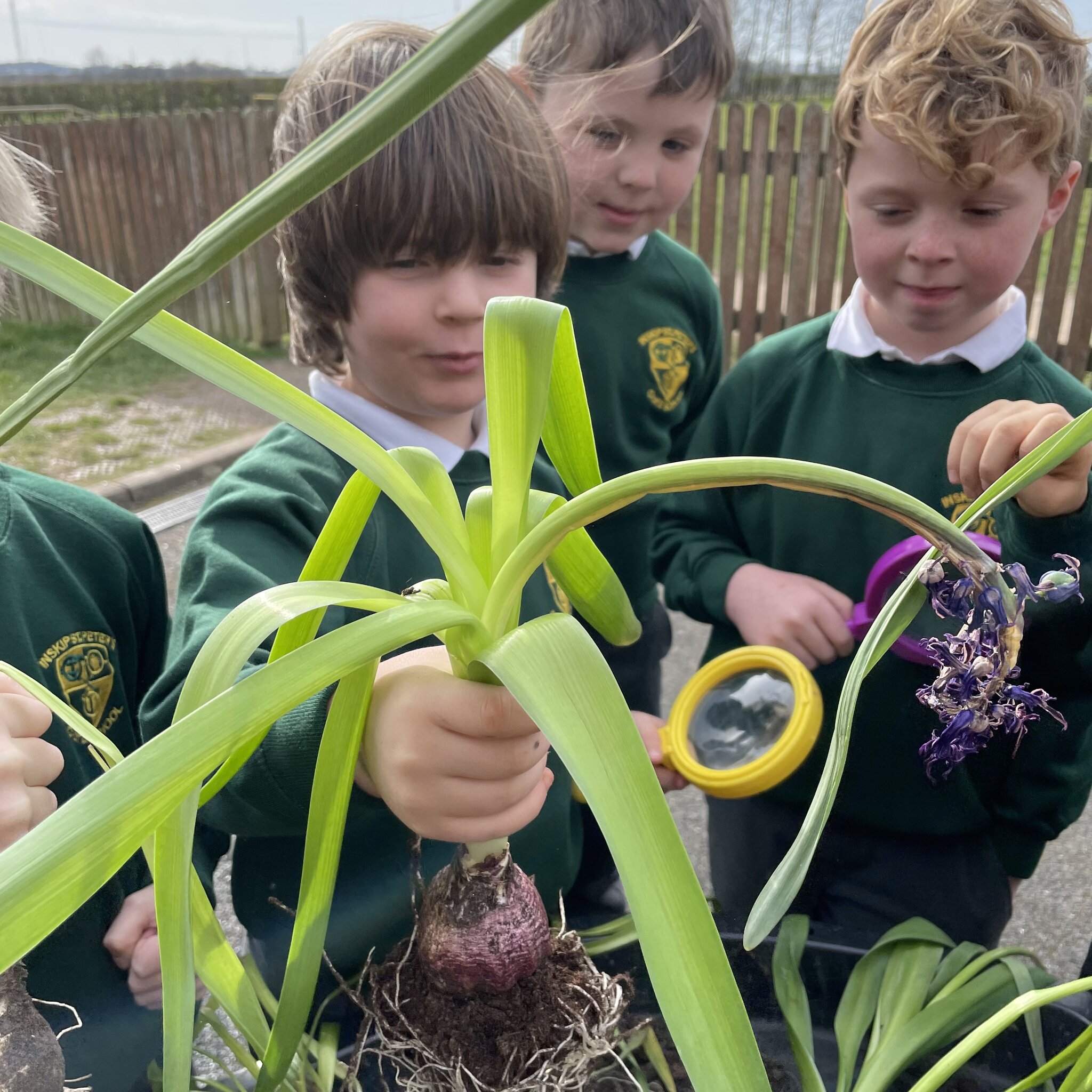 In science we have looked closely at bulbs developing our scientific skills of investigating, observing and questioning. If you look back through our blog posts to the 21st January here https://inskip.lancs.sch.uk/blog/2022-01-21-19-45-00-what-are-they you’ll find a post where I surprised the children by bringing into school some daffodil plants (but didn’t tell them that the plants were daffodils!). The children cared for the plants and watched them grow. I added to the activity by bringing two hyacinths and some tulips growing in pots for the children to observe as well once the daffodils had grown. Over time the children have watched the flowers bloom and then die.